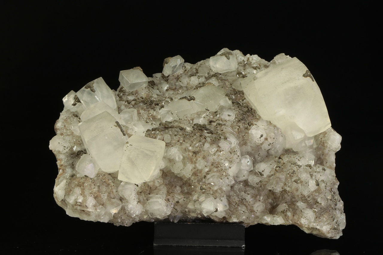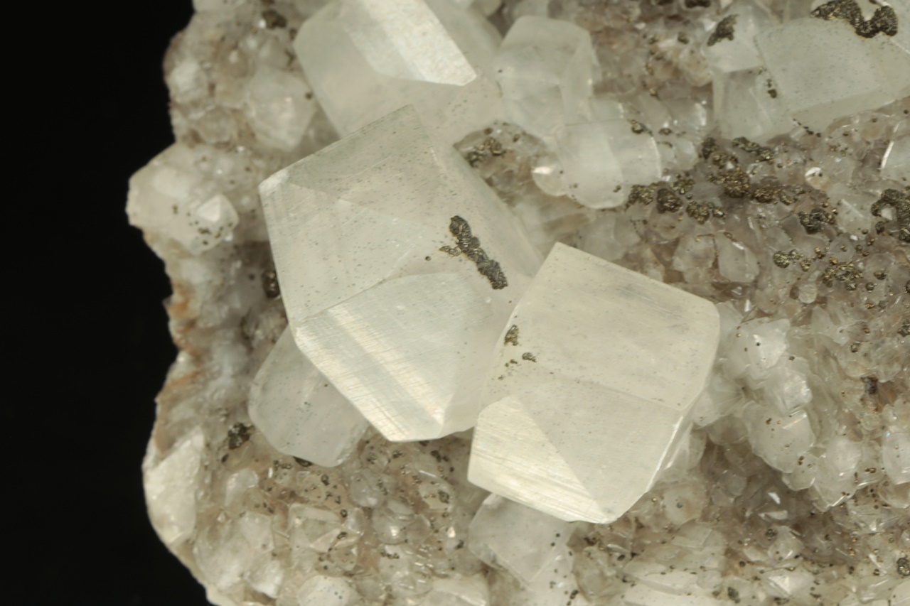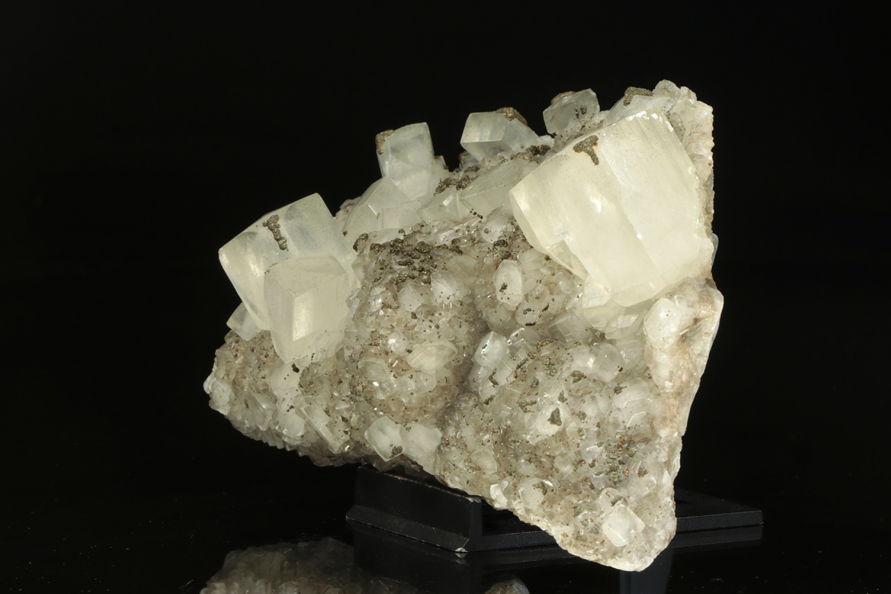 Drúza estetických, průsvitných krystalů kalcitu až pseudokubického vzhledu každý na nejvrchnějším rohu porostlý drobným pyritem. Největší krystal je 4 cm velký.