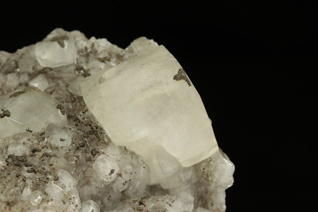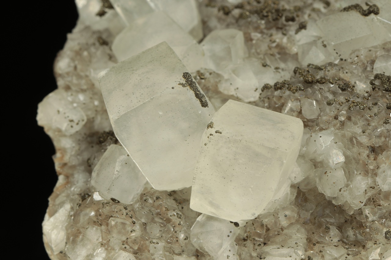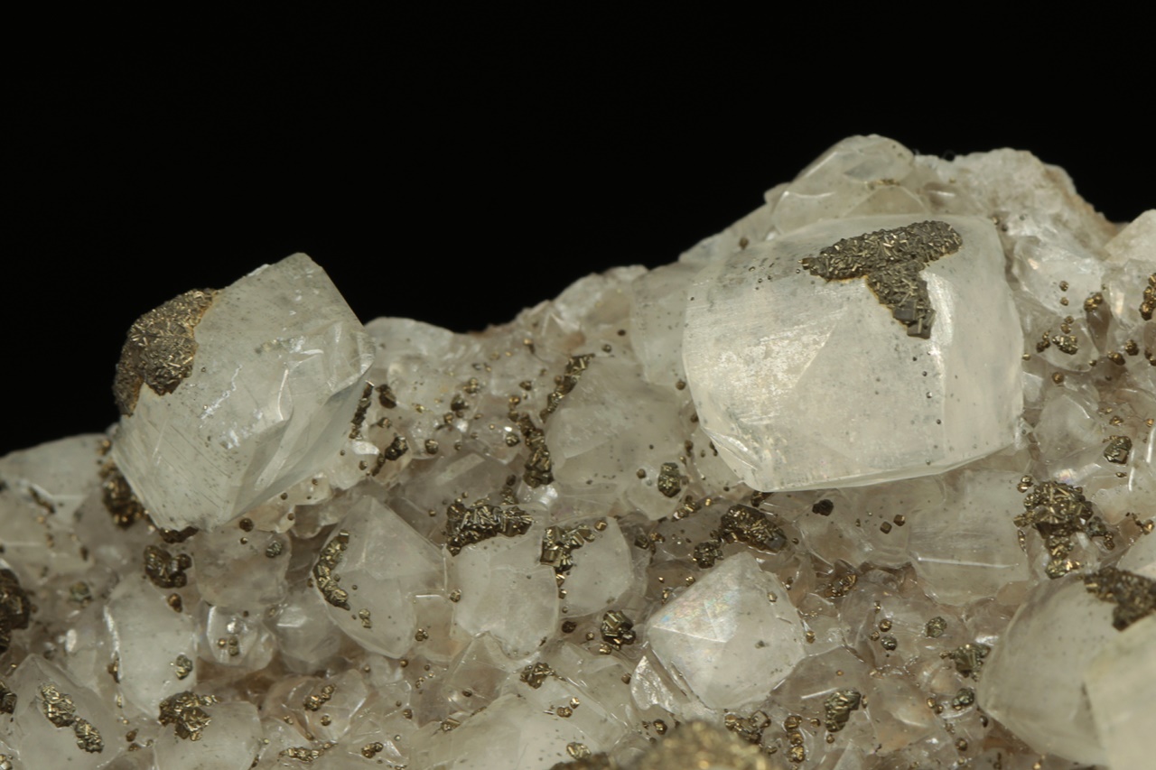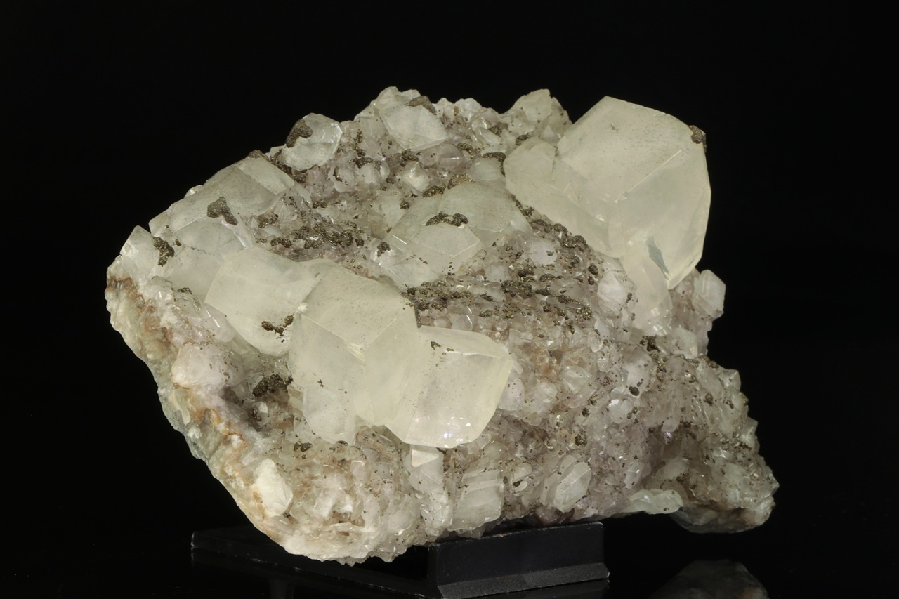 Drúza estetických, průsvitných krystalů kalcitu až pseudokubického vzhledu každý na nejvrchnějším rohu porostlý drobným pyritem. Největší krystal je 4 cm velký.