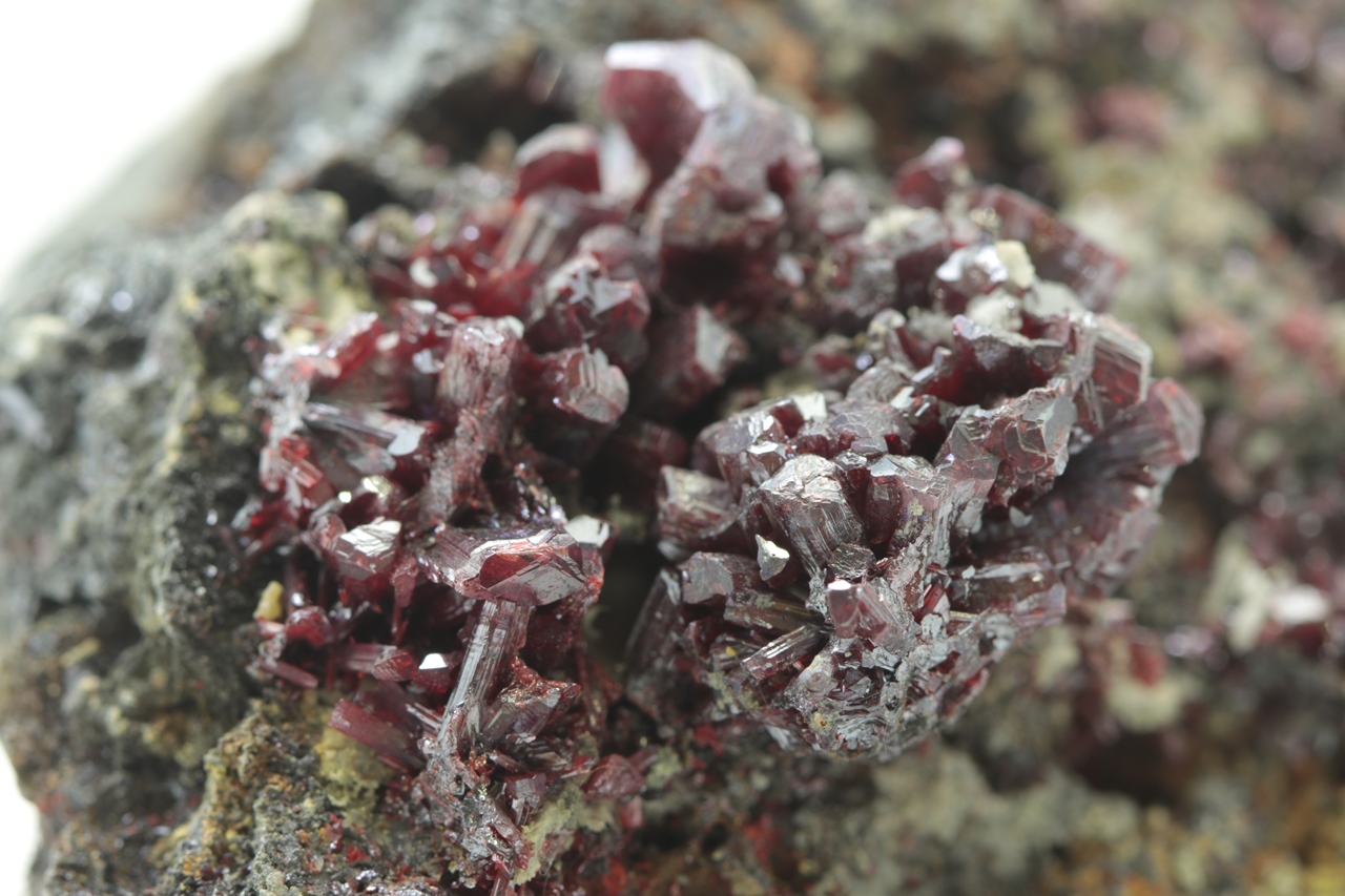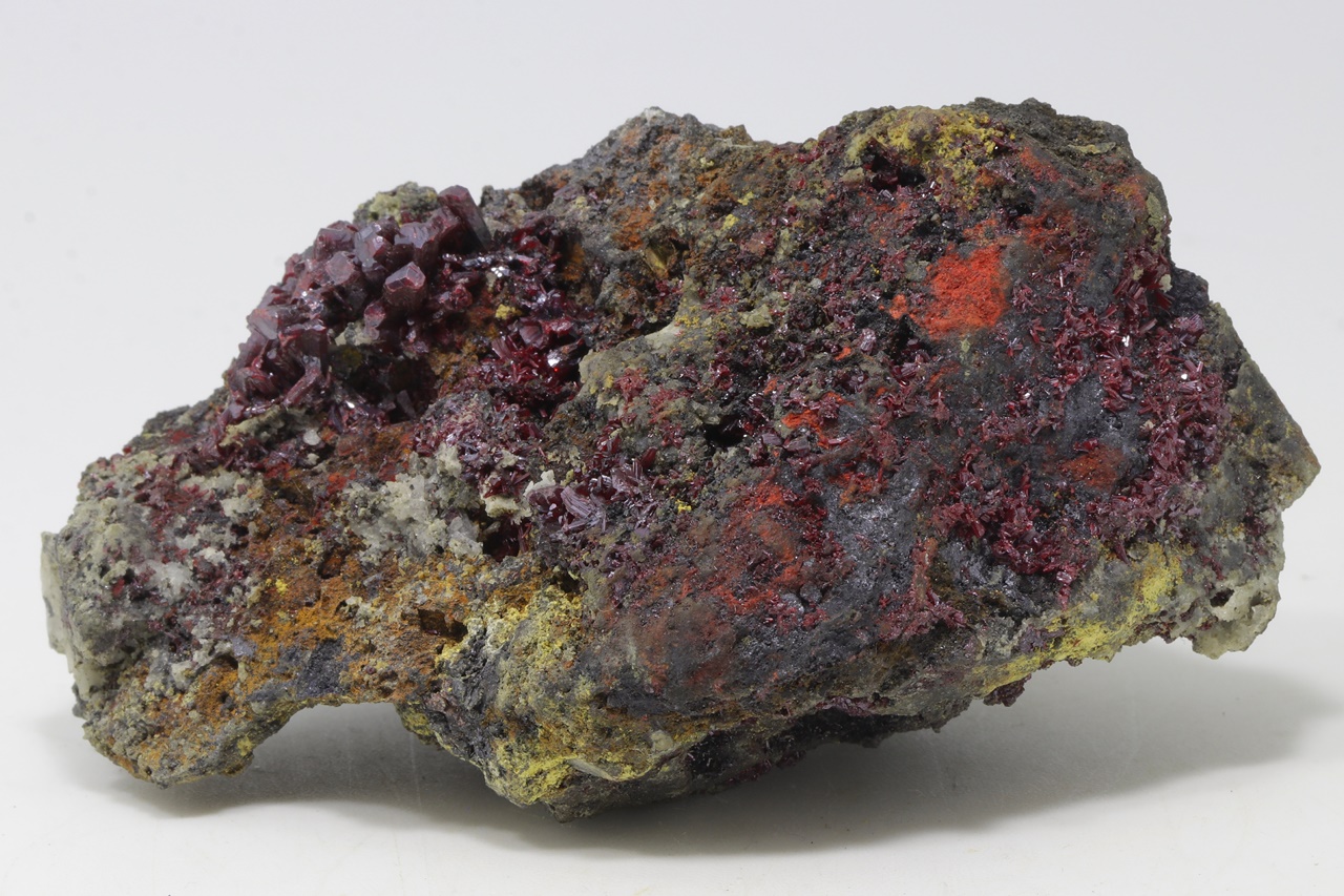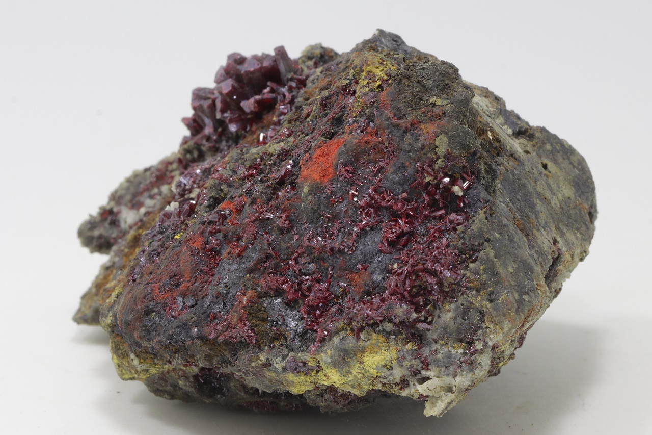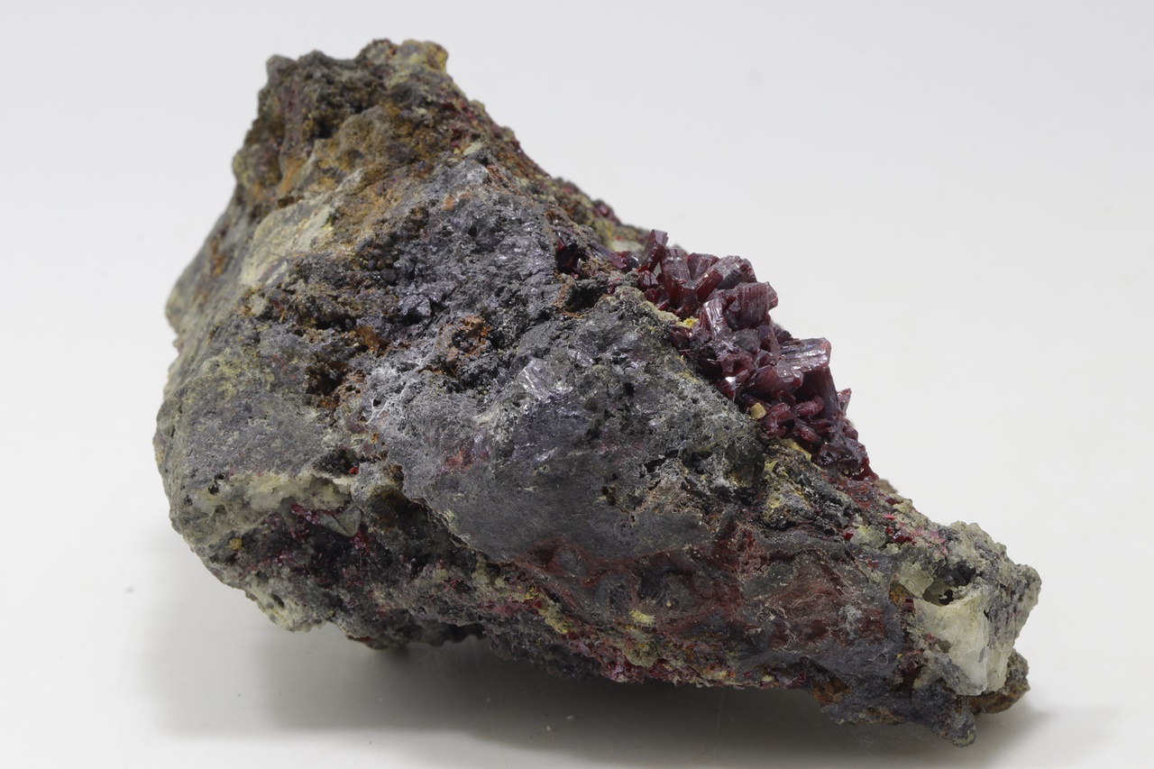 Mimořádná a sbírková ukázka proustitu z lokality Imiter, Maroko. Proustit na vzorku vytváří dlouze protažené, průsvitné, světle až tmavě červené drobné krystaly. Ovšem vzorek je na tento sulfid velmi bohatý. Jedná se o pěknou ukázku tohoto minerálu. Proustit v jedné části vytváří velký agregát, který dosahuje velikosti 2, 5 cm. Na tomto vzorku se kromě proustitu vyskytují kovově lesklé, ocelově šedé krystalky polybazitu.