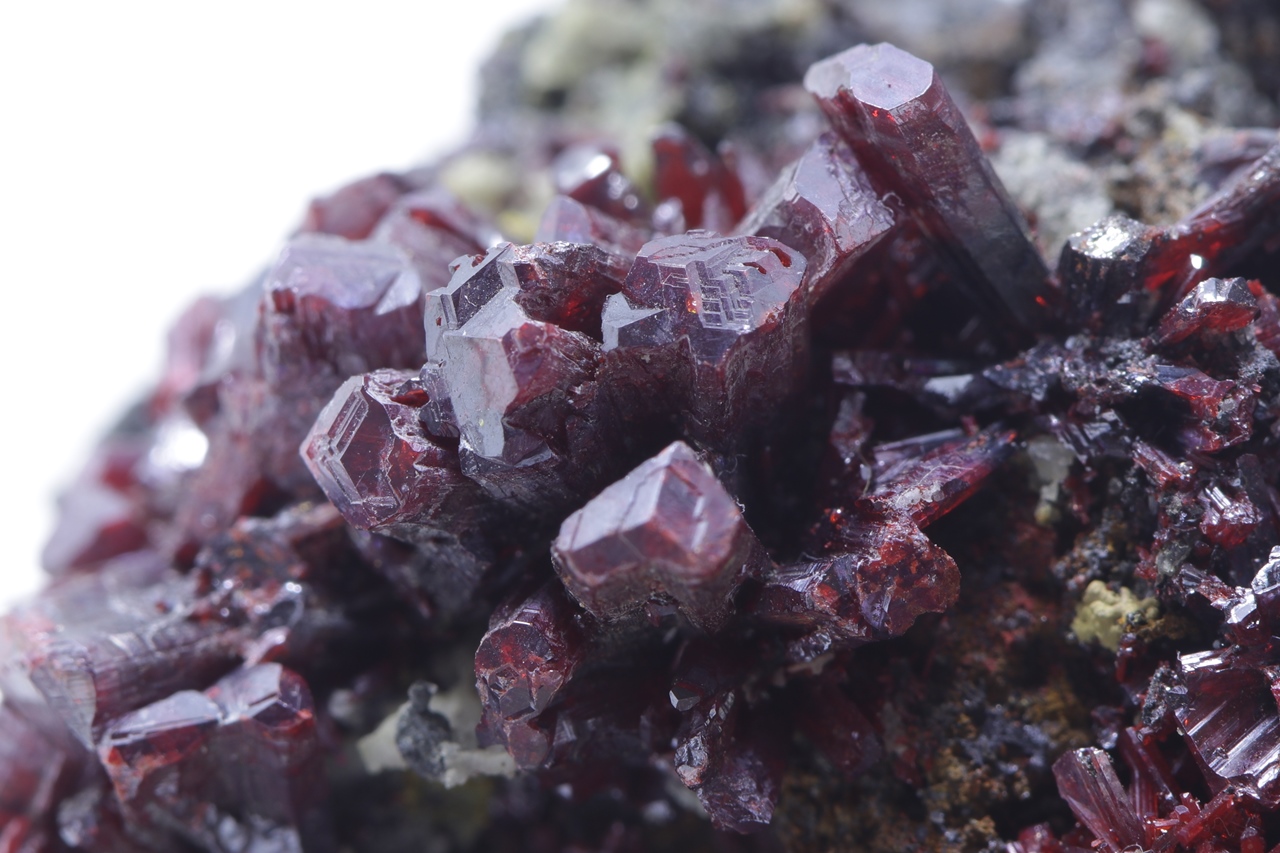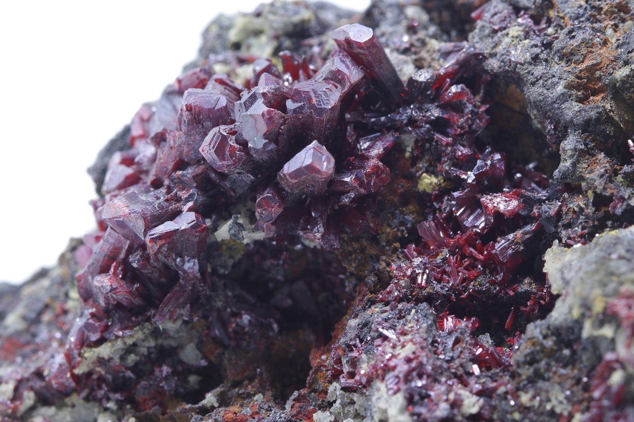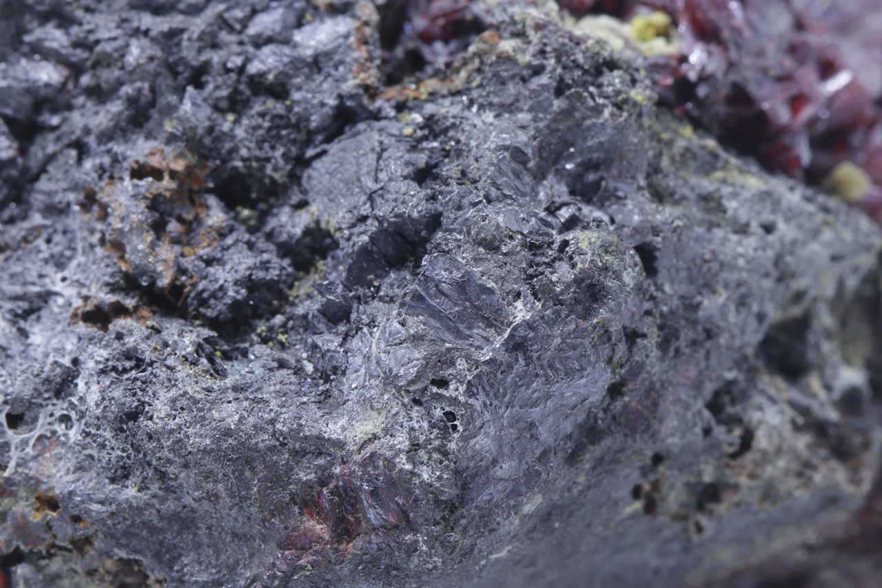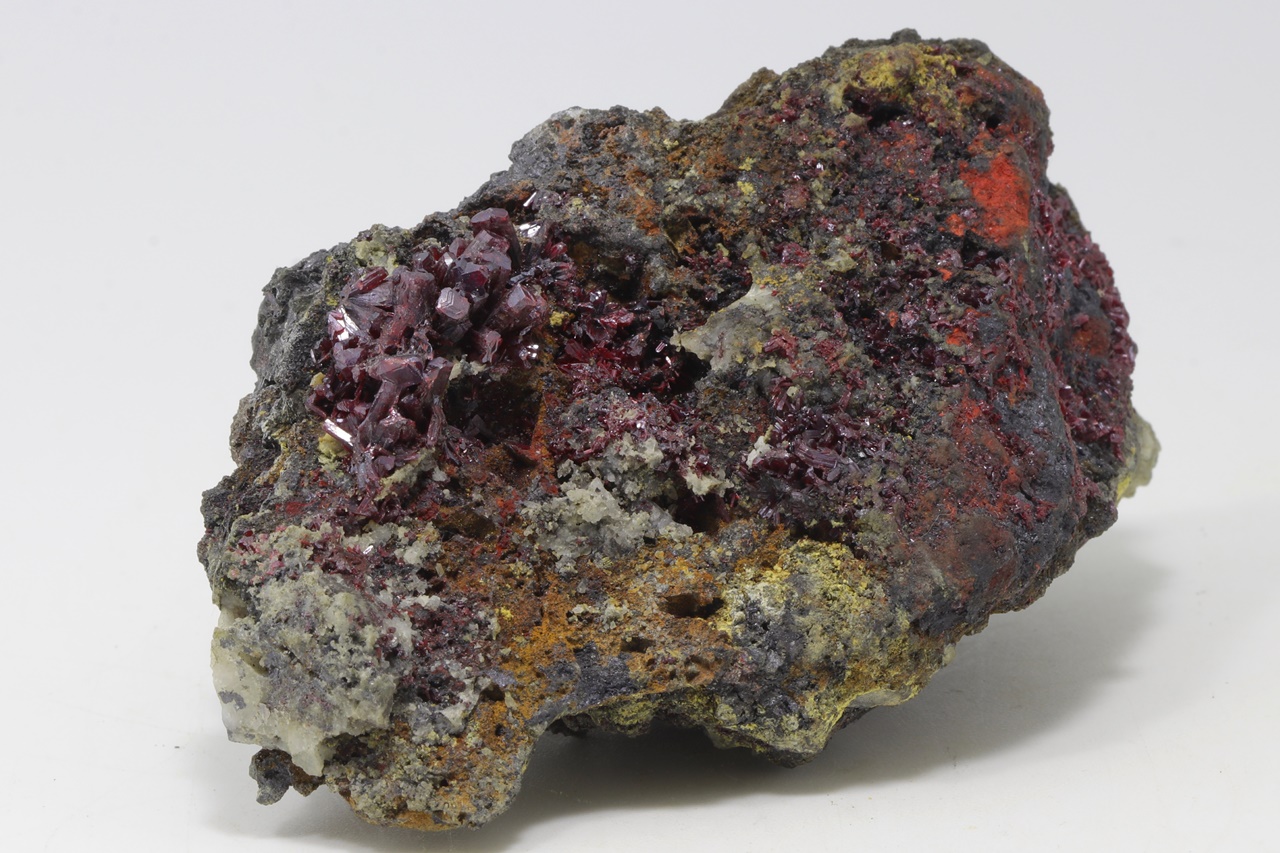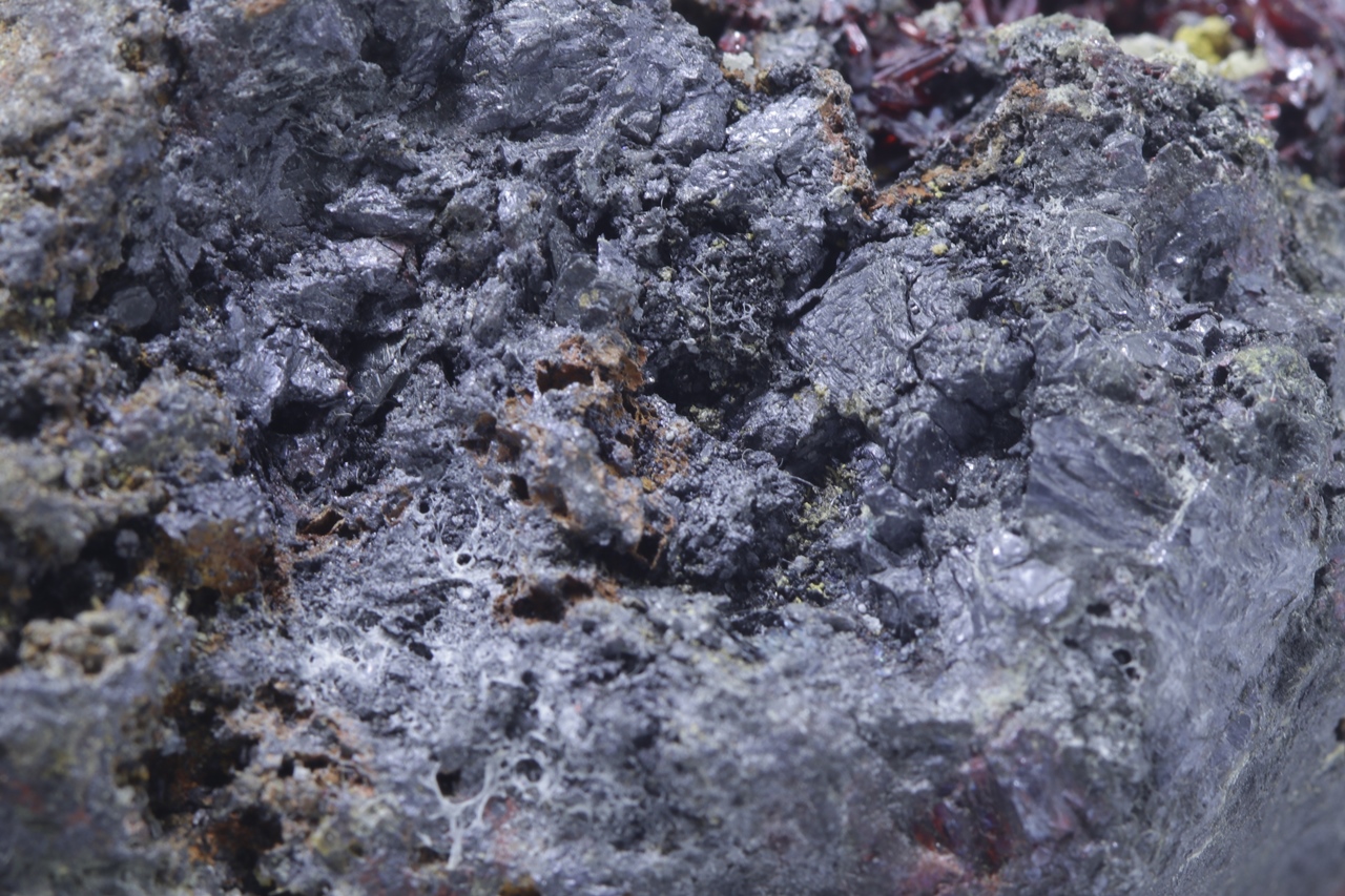 Mimořádná a sbírková ukázka proustitu z lokality Imiter, Maroko. Proustit na vzorku vytváří dlouze protažené, průsvitné, světle až tmavě červené drobné krystaly. Ovšem vzorek je na tento sulfid velmi bohatý. Jedná se o pěknou ukázku tohoto minerálu. Proustit v jedné části vytváří velký agregát, který dosahuje velikosti 2, 5 cm. Na tomto vzorku se kromě proustitu vyskytují kovově lesklé, ocelově šedé krystalky polybazitu.