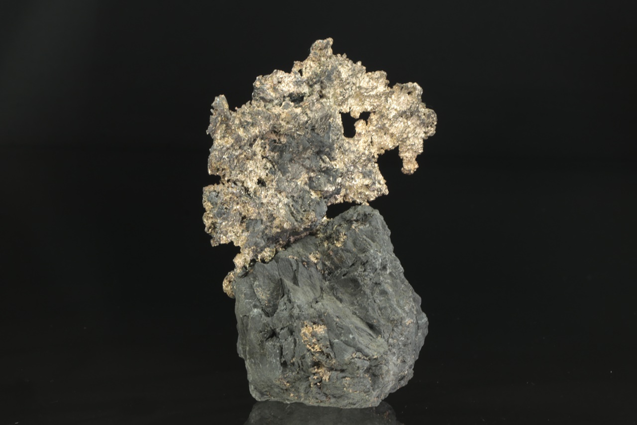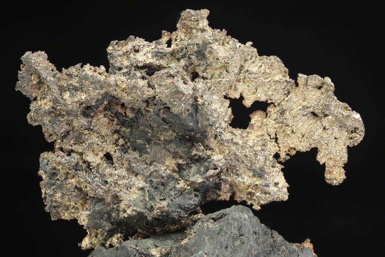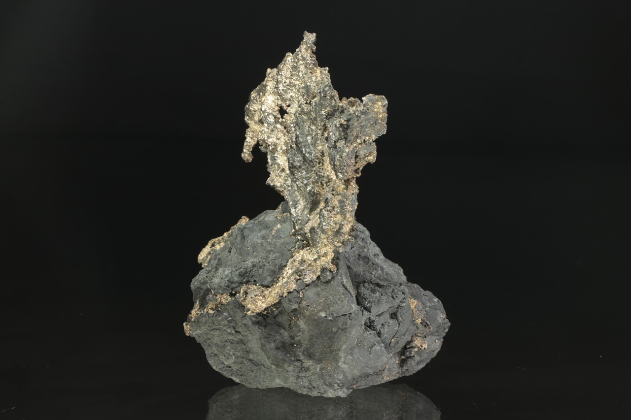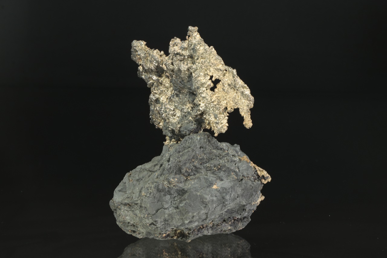Velký, estetický vzorek plátku stříbra vystupujícího a prorůstajícího do černé podložky. Část vystupující do prostoru má rozměry 10 × 6 cm.