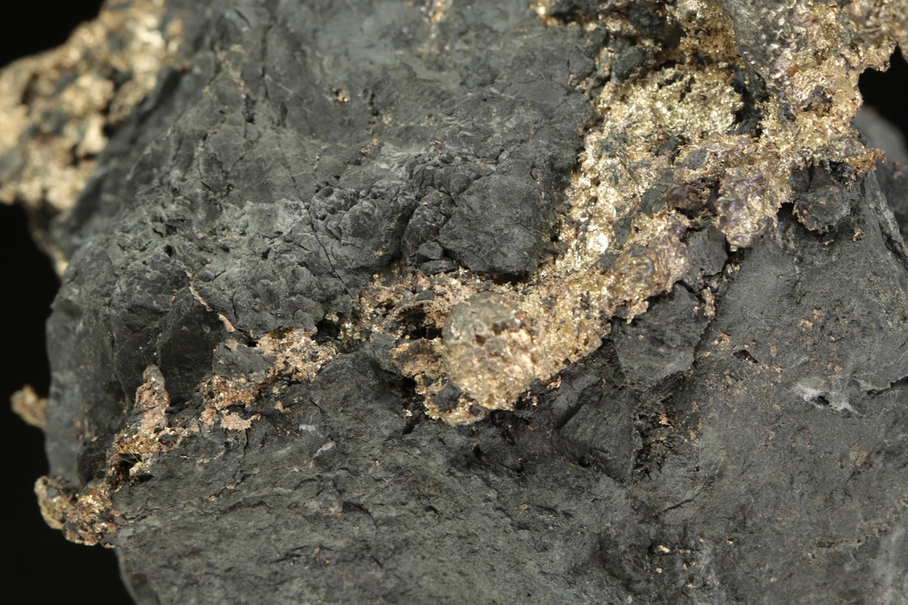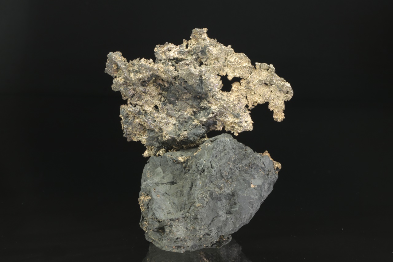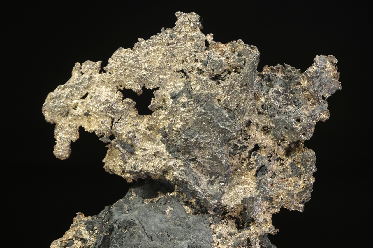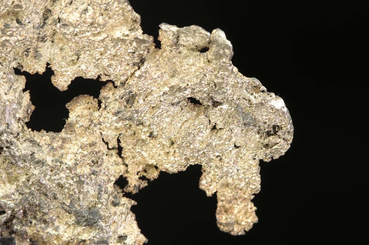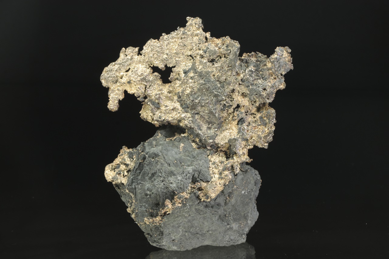 Velký, estetický vzorek plátku stříbra vystupujícího a prorůstajícího do černé podložky. Část vystupující do prostoru má rozměry 10 × 6 cm.