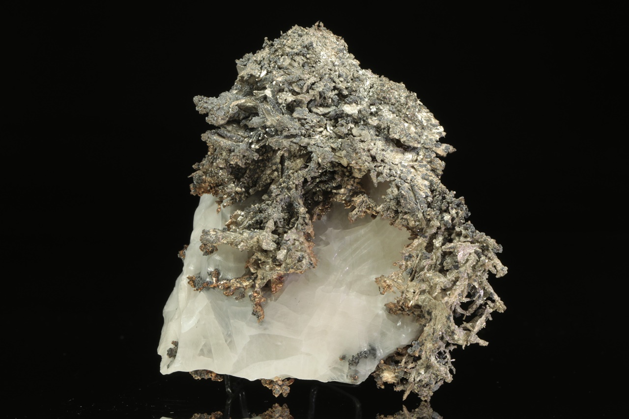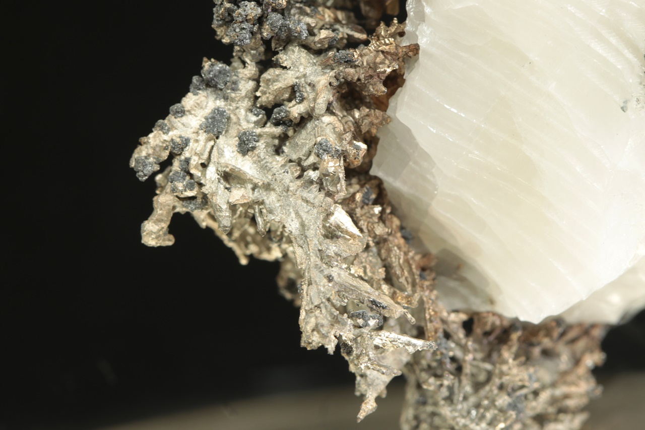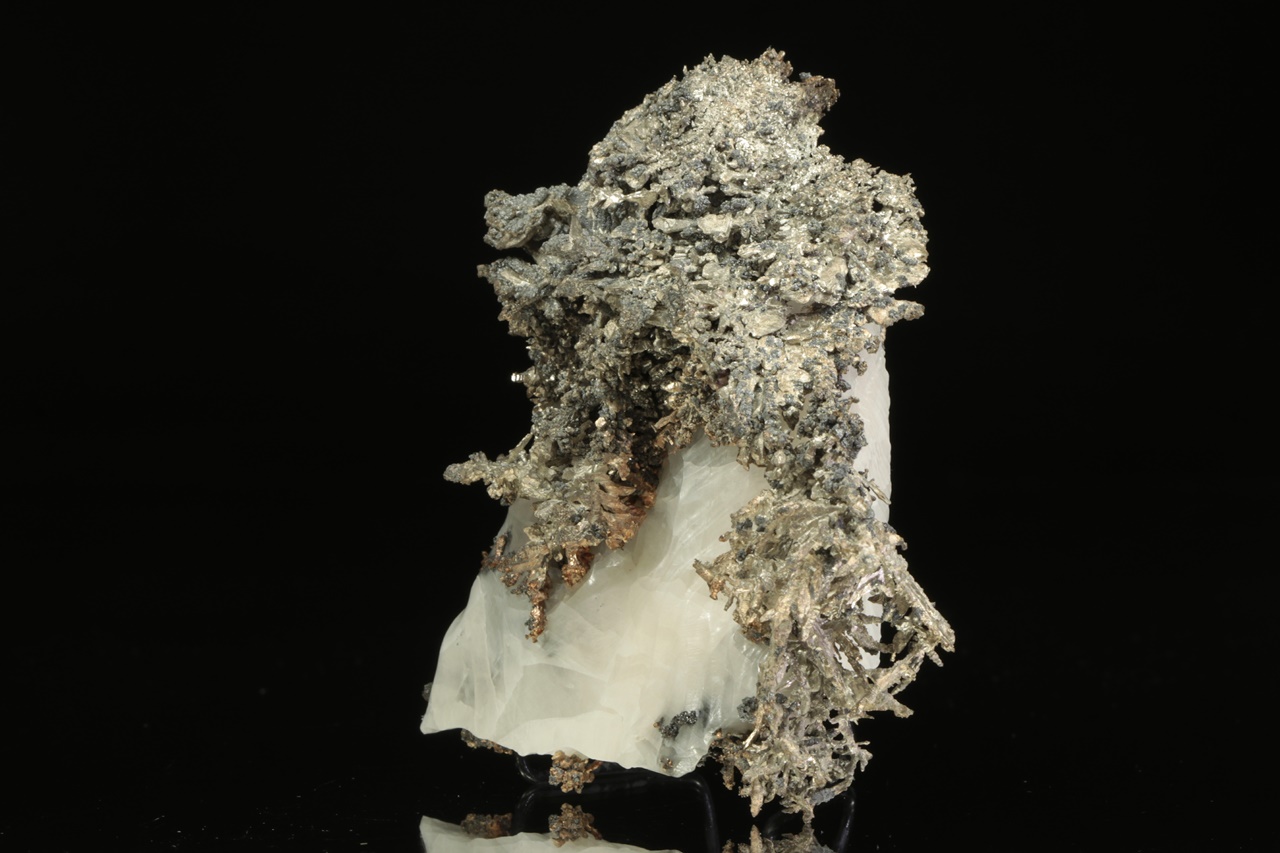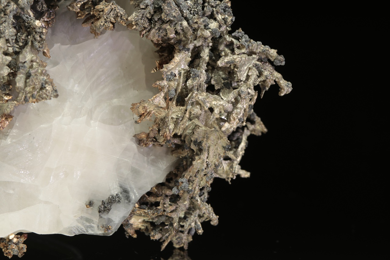 Přenádherný vzorek dendriticky narostlého krystalovaného zlata vytvářející zcela mimořádné, zpletité větvičky. Stříbro je místy porostlé tmavým akantitem.