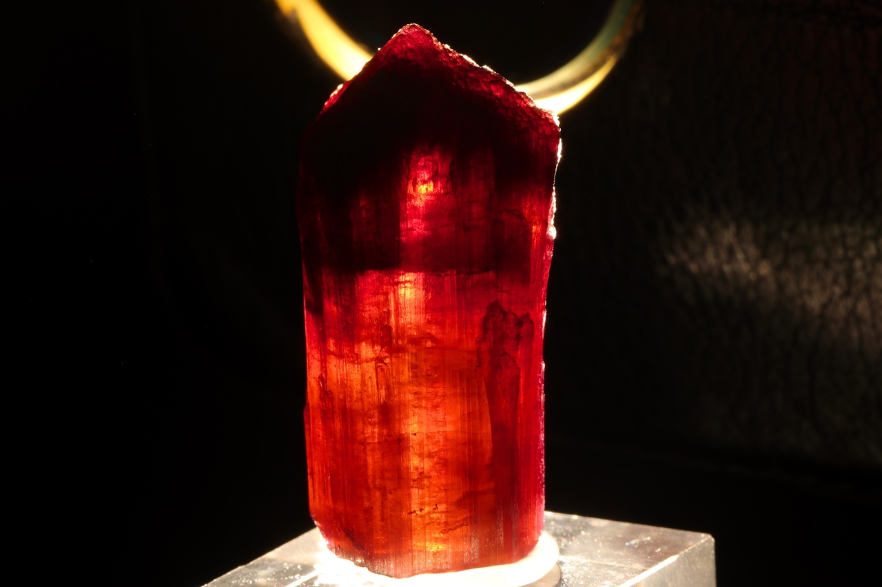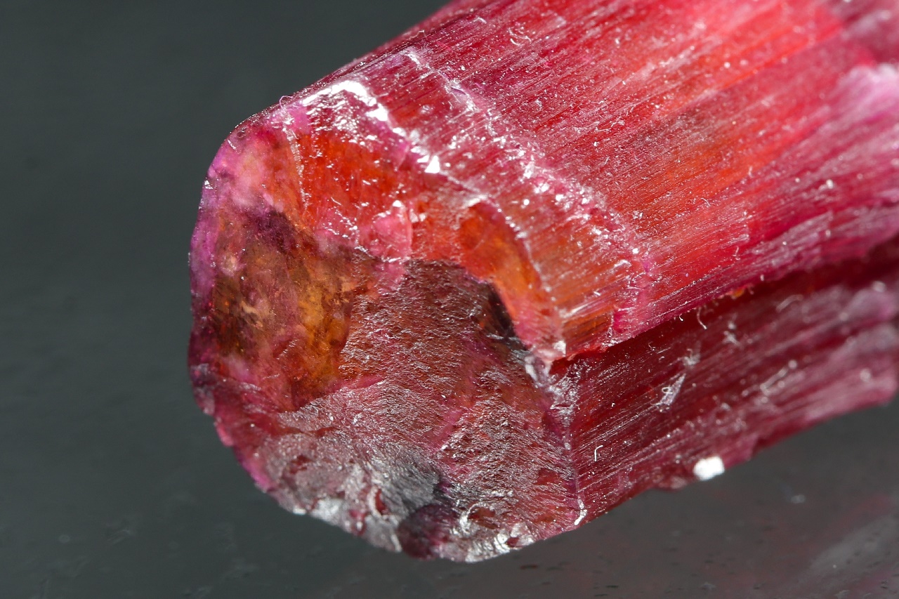 Beautiful crystal of zonal tourmaline, with an orange core at the bottom, which is overgrown on the outside and at the top by intensely red tourmaline. The crystal is healed from the bottom.