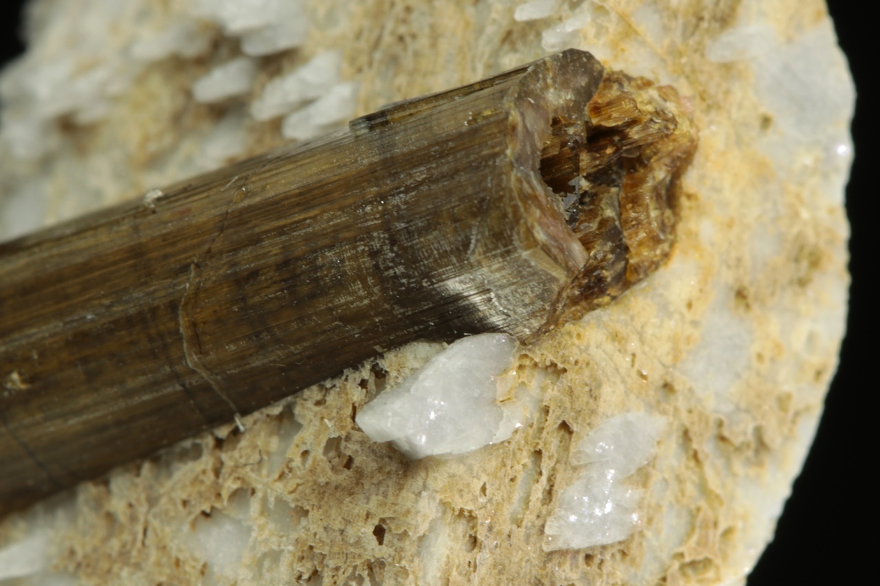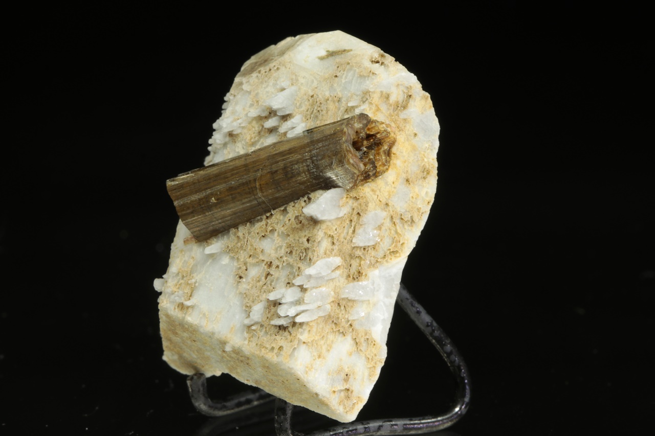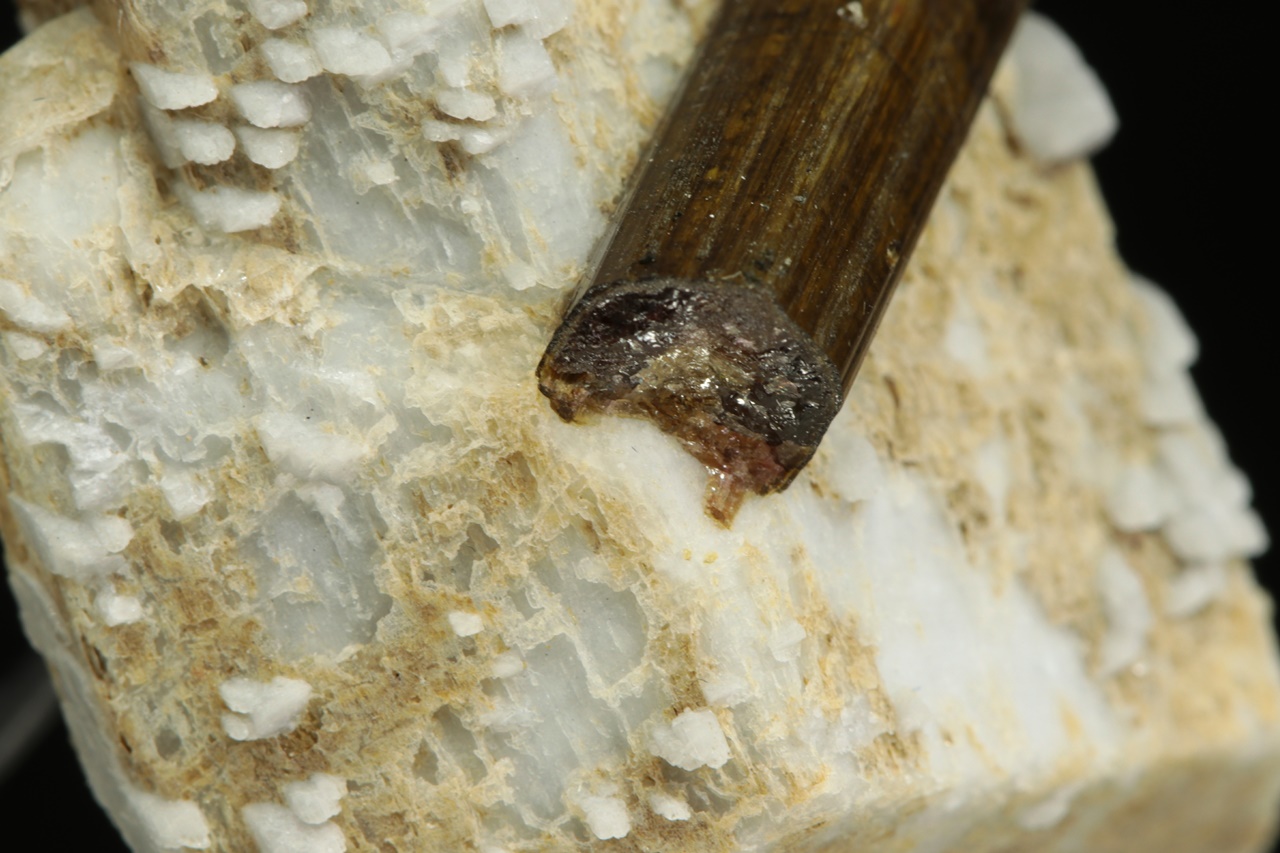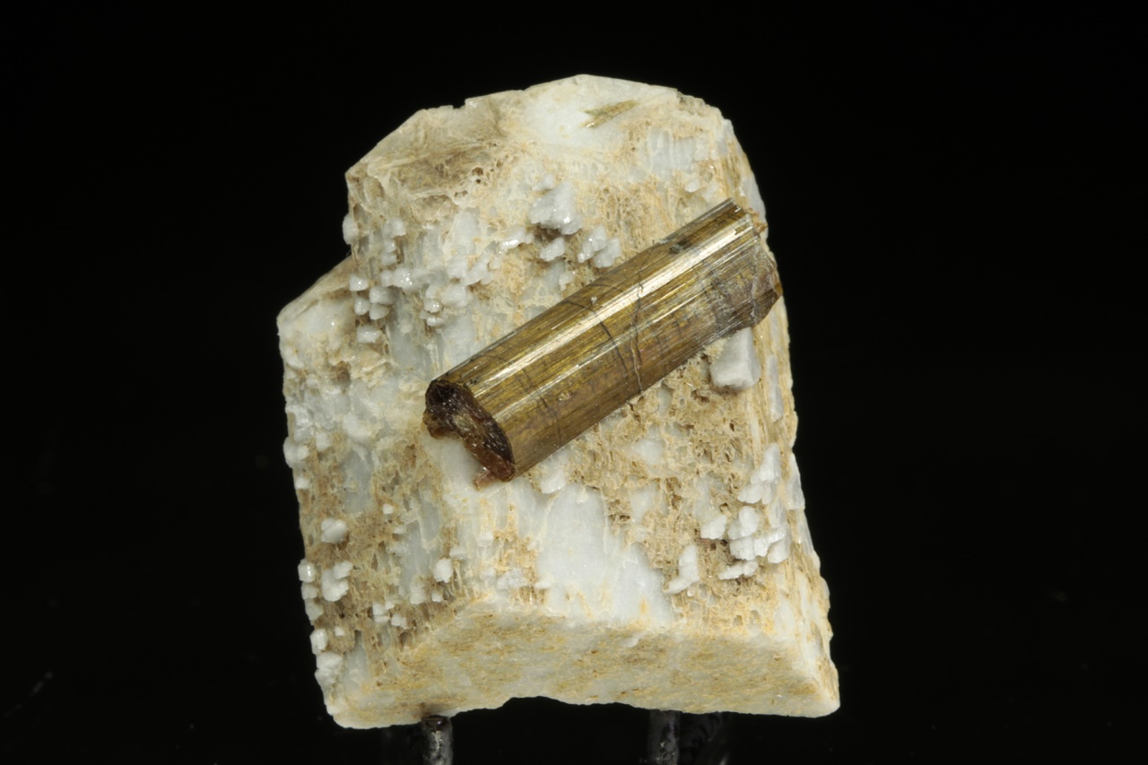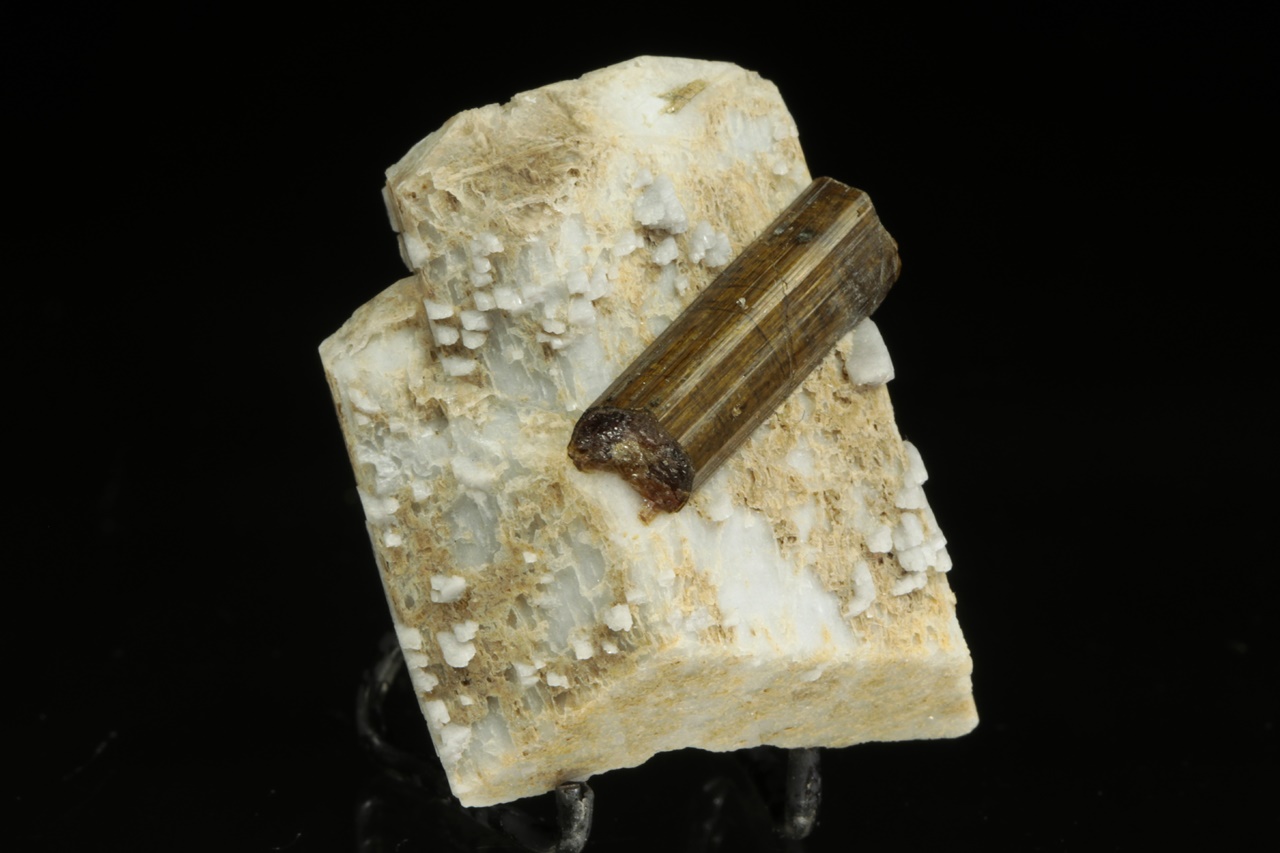 Two-centimeter tall column of brown tourmaline grown on a gray-white orthoclase.