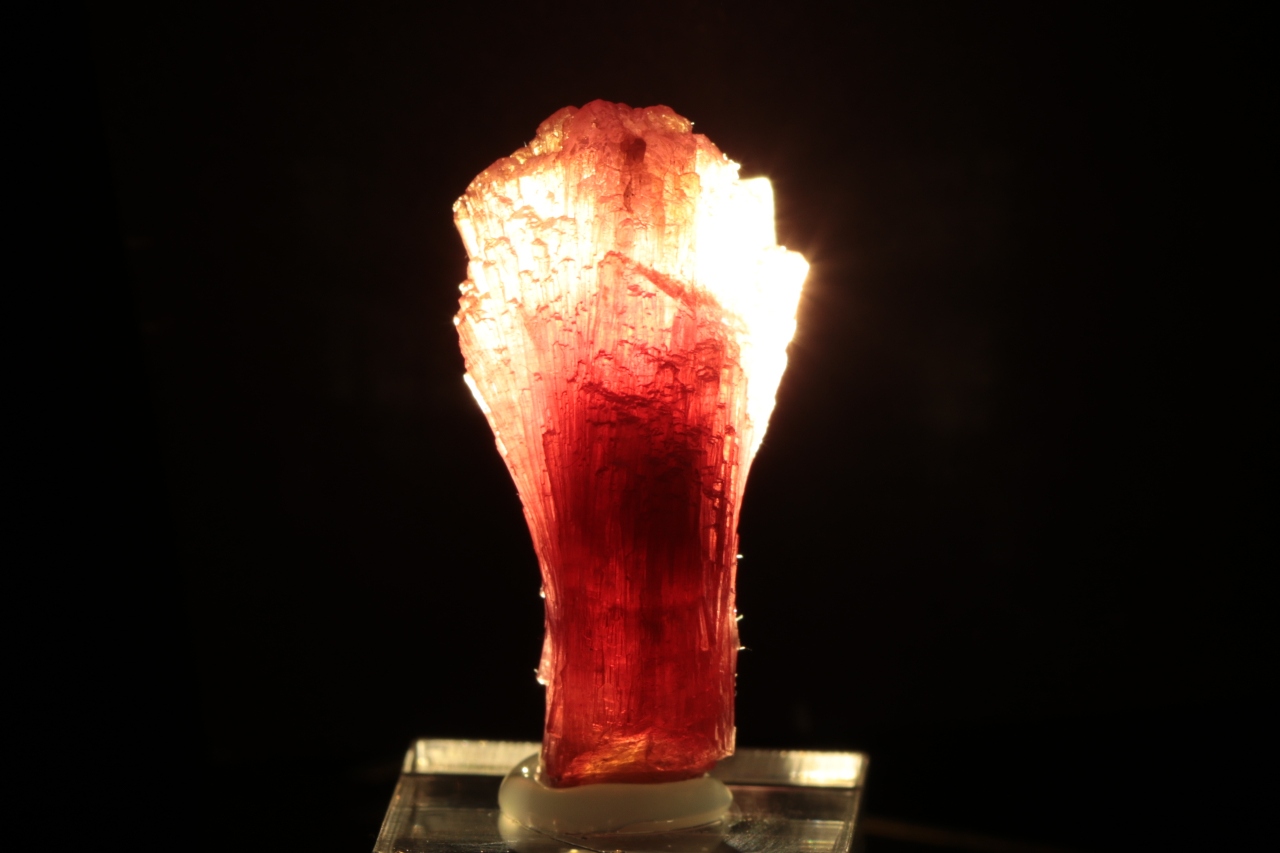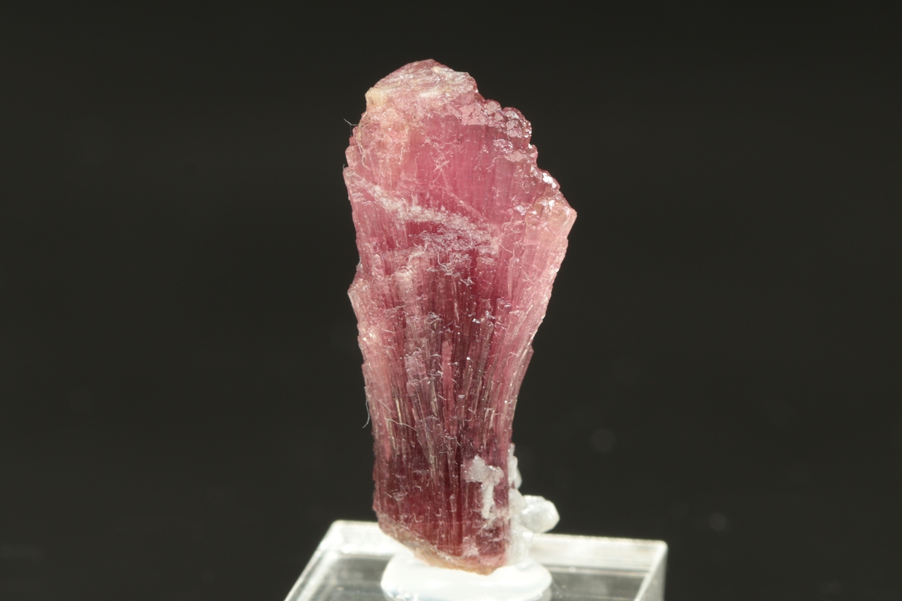 Krystal červeného, tzv. houbového turmalínu s vějířovitě narostlým vrškem krystalu.