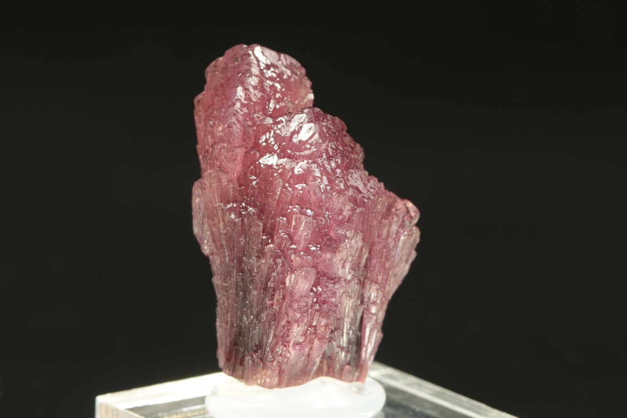 Srostlice tří krystalů červeného, tzv. houbového turmalínu s vějířovitě narostlými vršky krystalů.