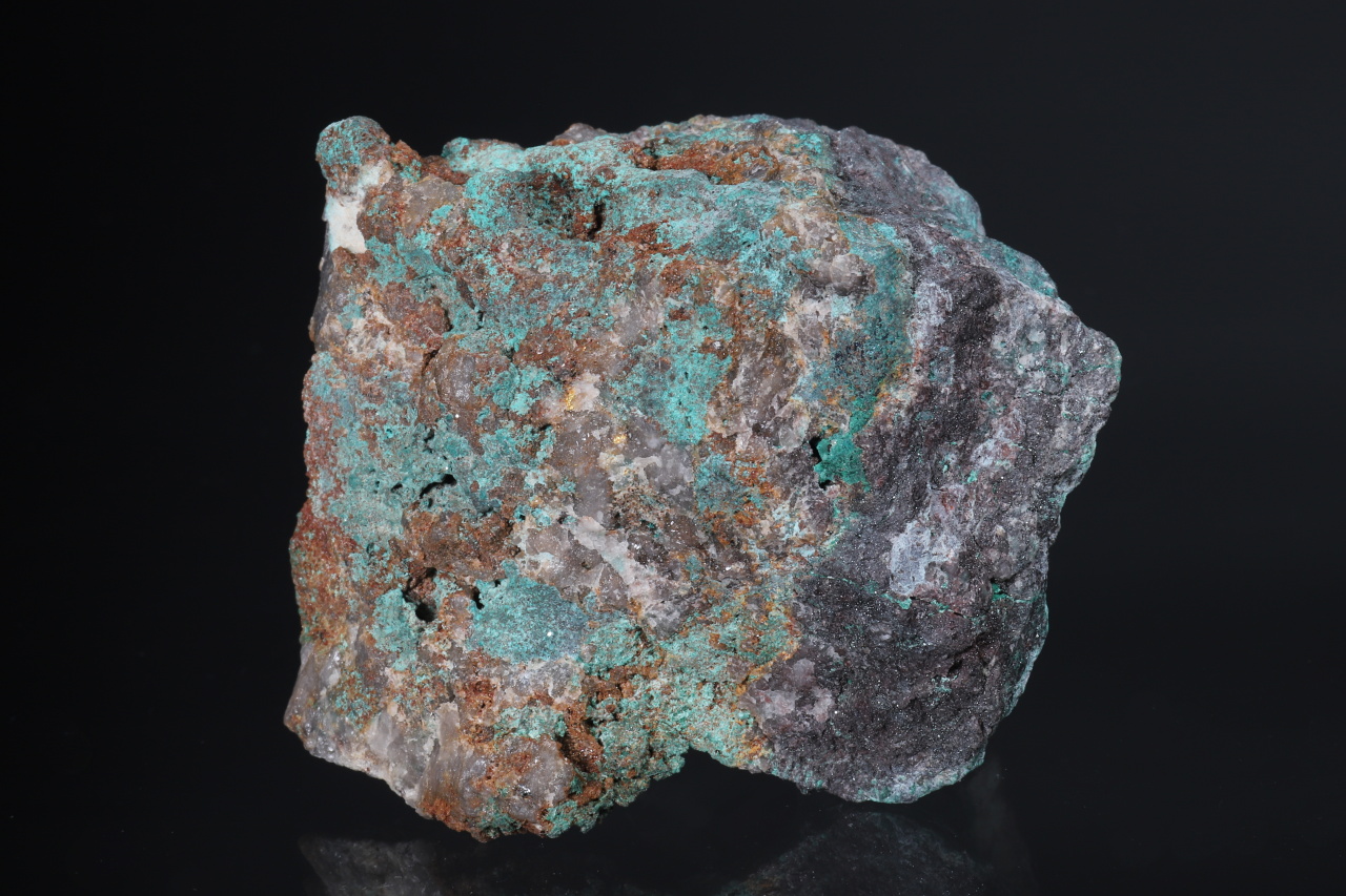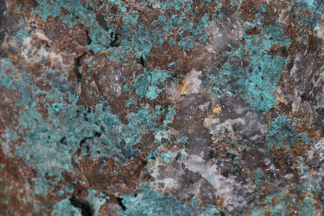 Ukázka zrn zlata do velikosti 2 mm na vzorku křemene s malachitem a dalšími Cu minerály.