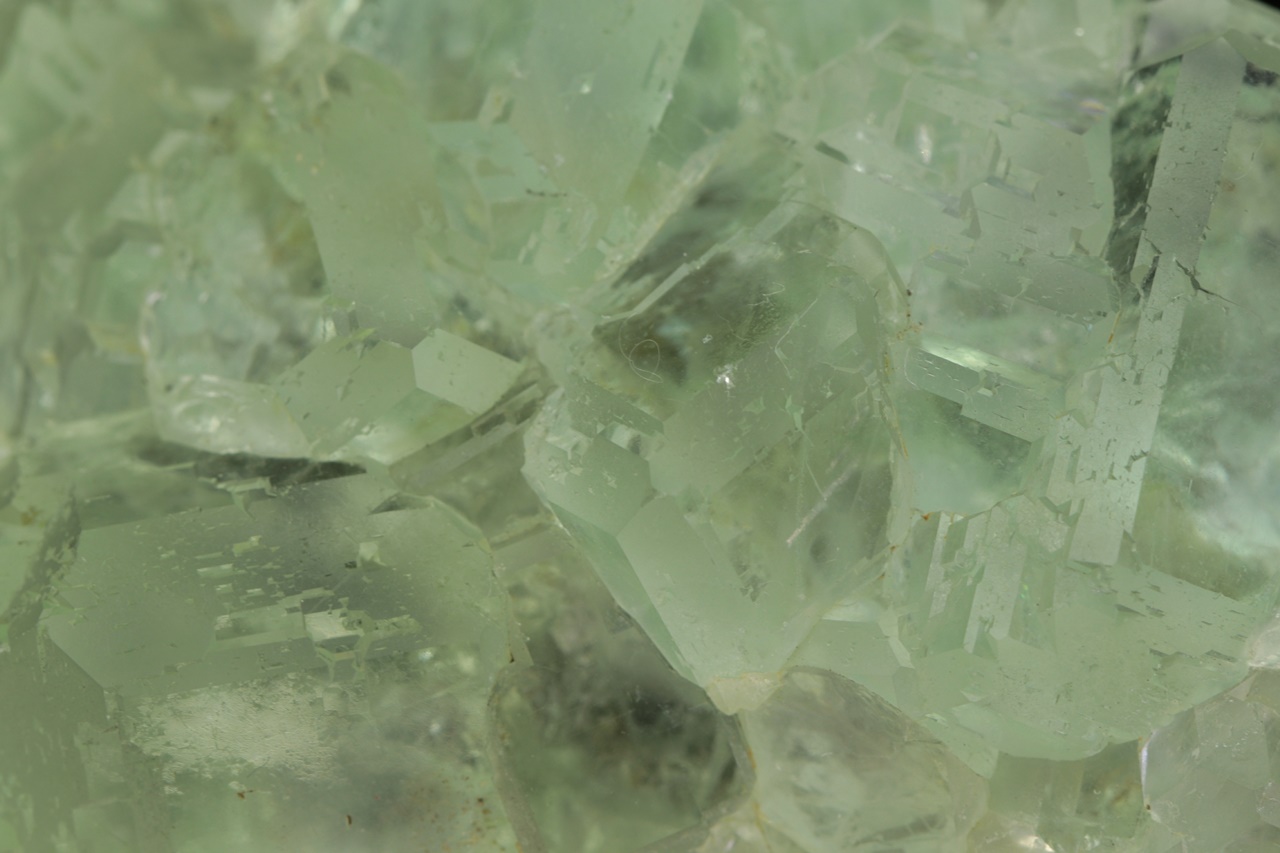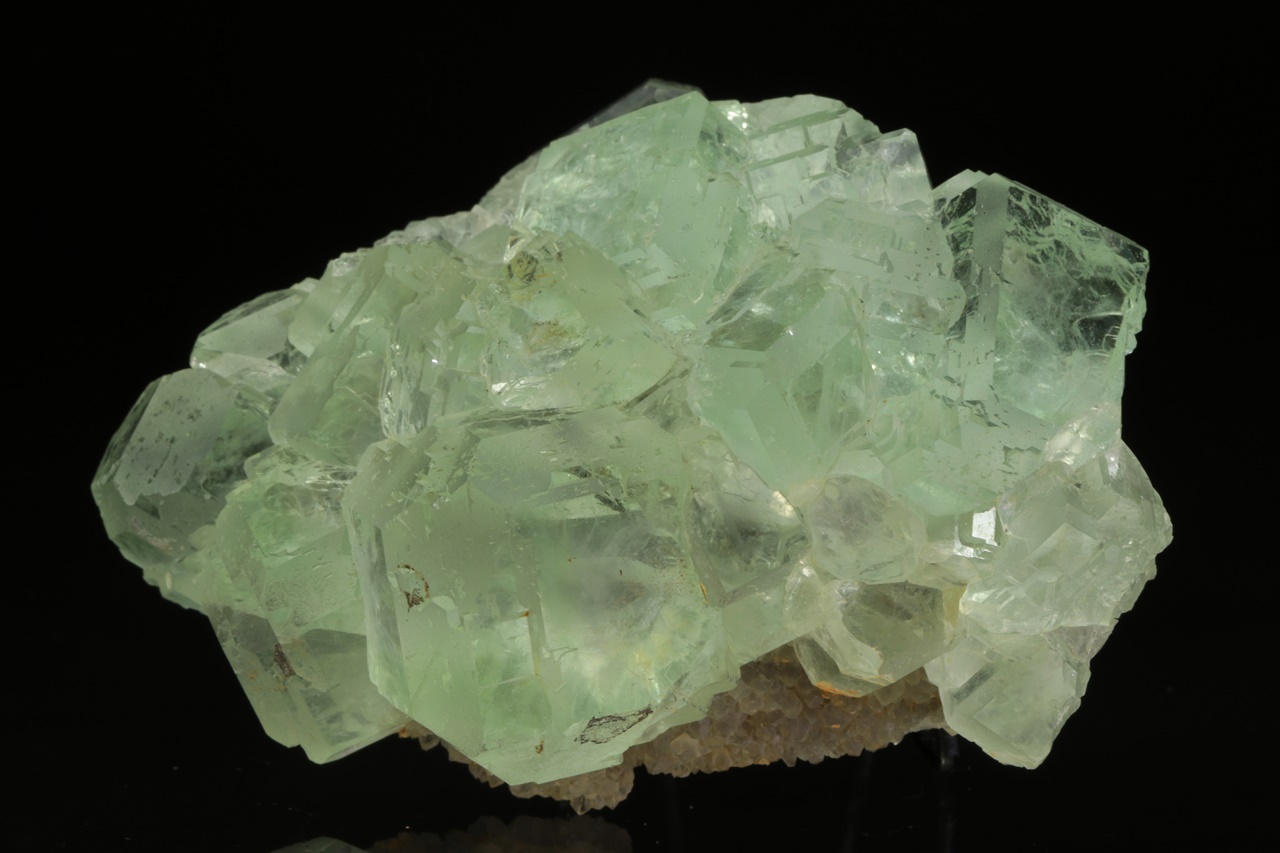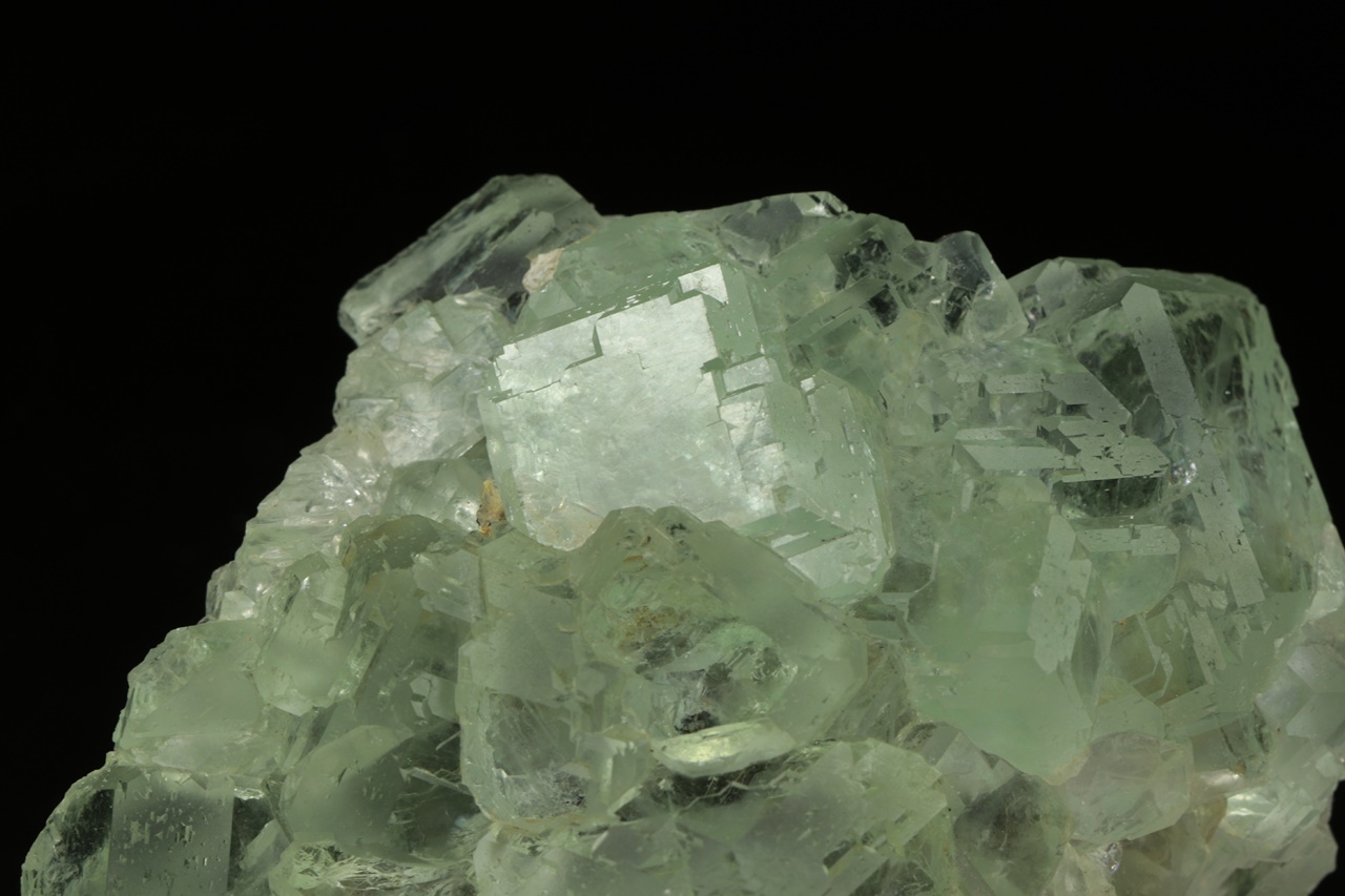 Nádherná drúza světle zelených krystalů průzračného, velmi lesklého fluoritu tvořených spojkami krychle a osmistěnu. Největší krystal je 2,5 cm velký.