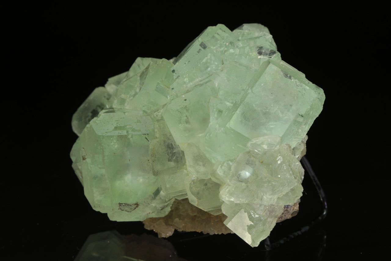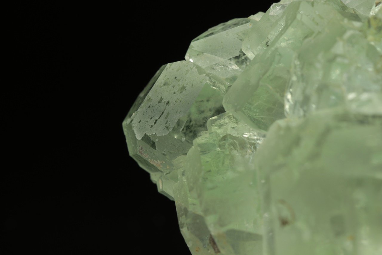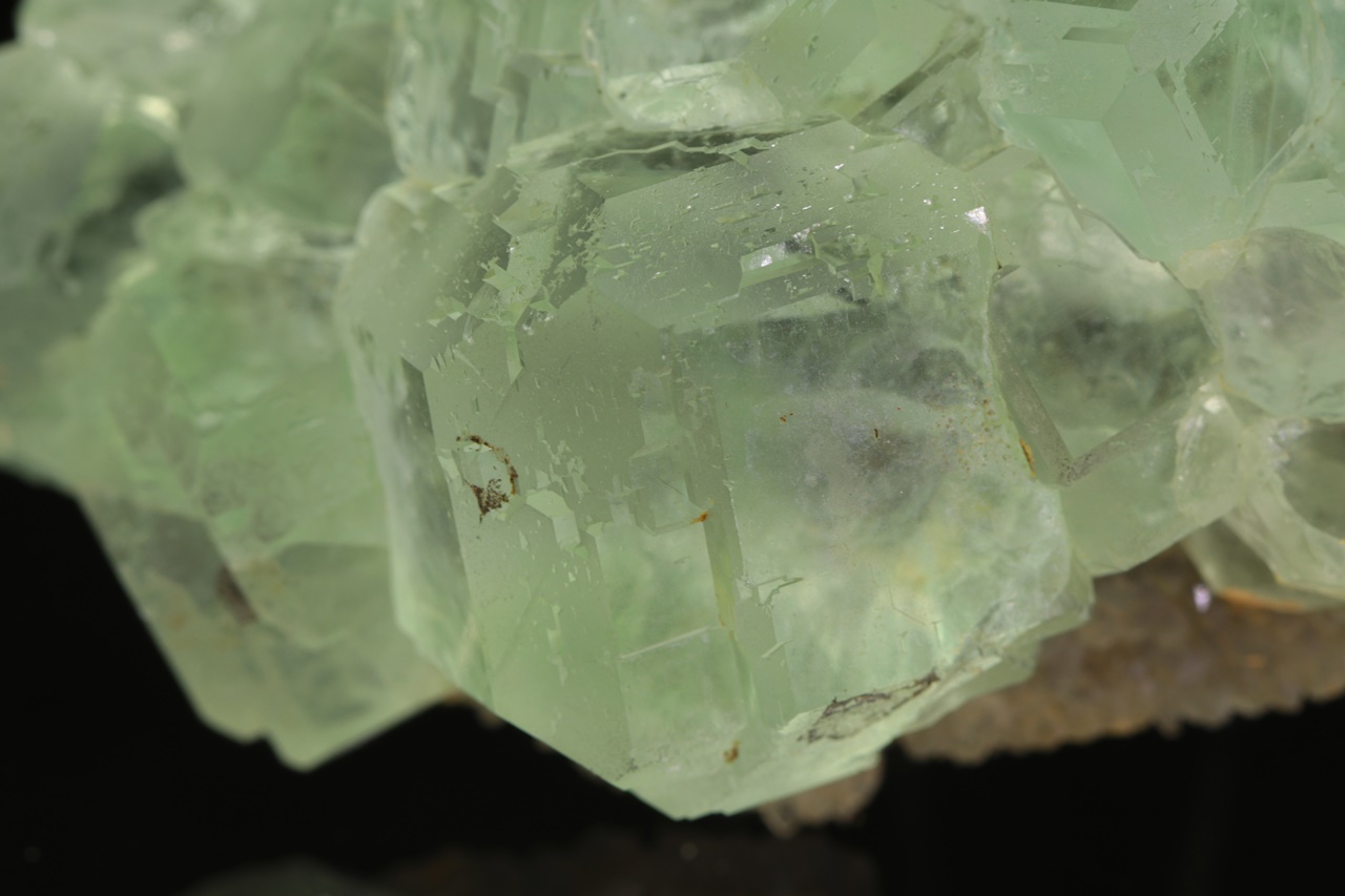 Nádherná drúza světle zelených krystalů průzračného, velmi lesklého fluoritu tvořených spojkami krychle a osmistěnu. Největší krystal je 2,5 cm velký.