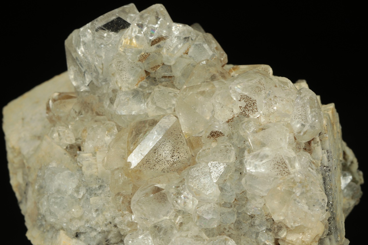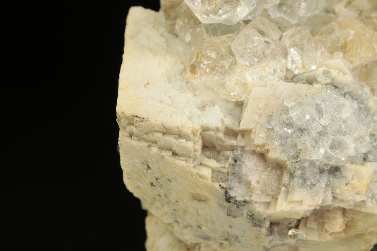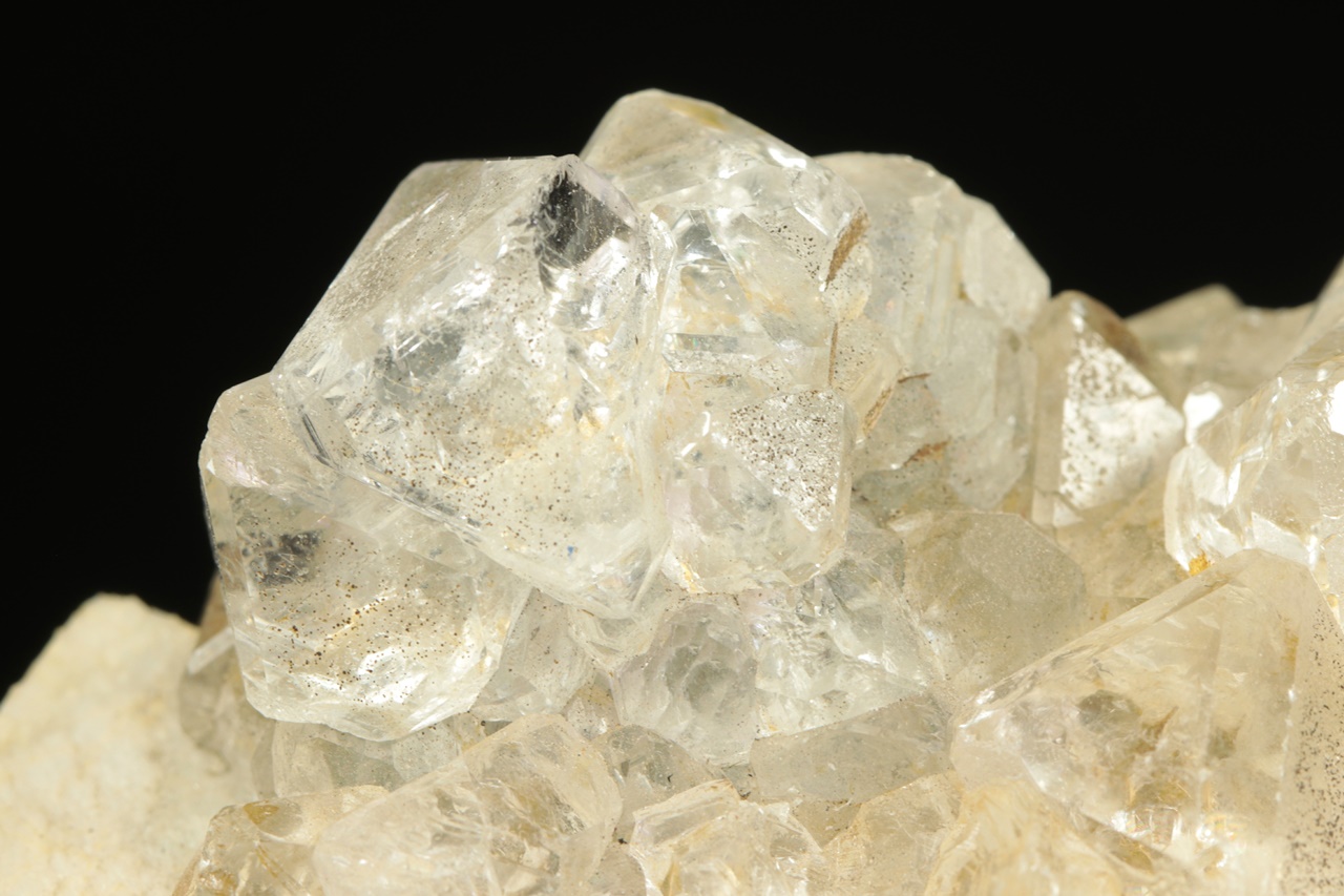 Čiré průhledné krystaly fluoritu tvořené spojkami oktaedru a rombododekaedru narostlé na béžovo bílém kalcitu. Největší krystal fluoritu je 1,5 cm velký.
