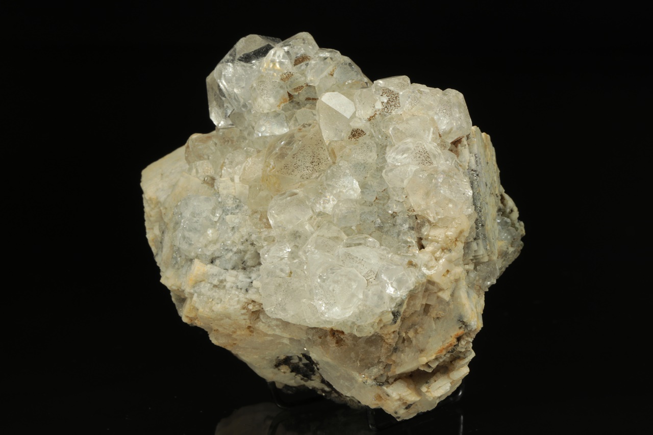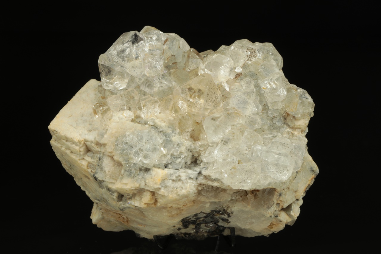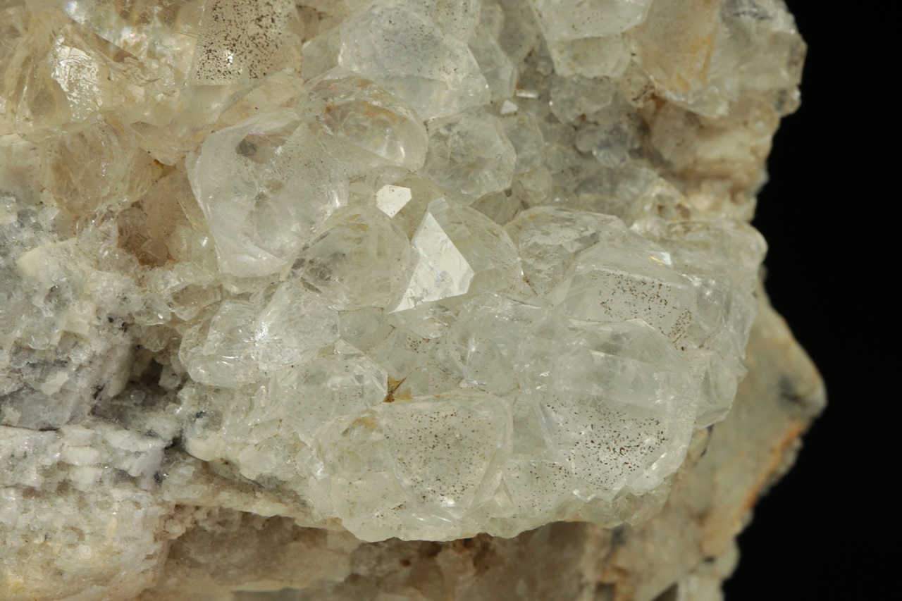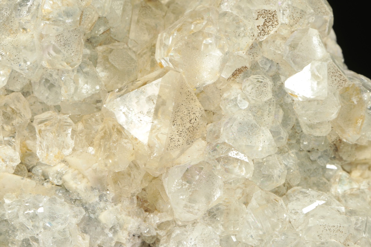 Čiré průhledné krystaly fluoritu tvořené spojkami oktaedru a rombododekaedru narostlé na béžovo bílém kalcitu. Největší krystal fluoritu je 1,5 cm velký.