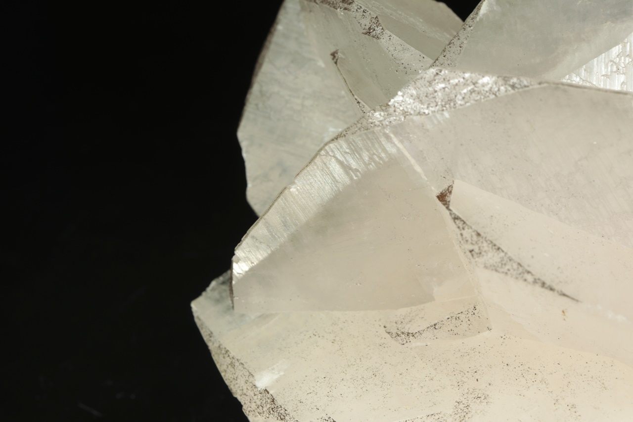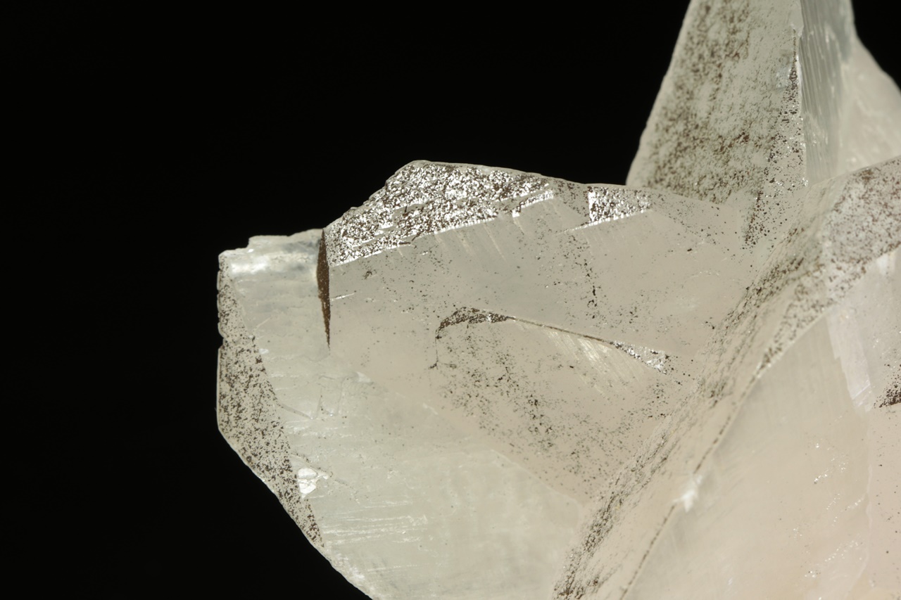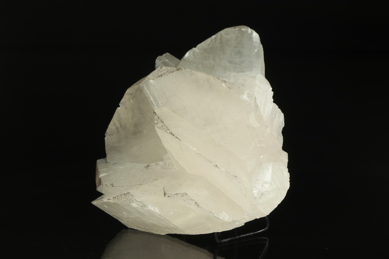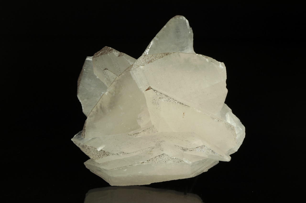 Nádherná srostlice až 9 cm velkých krystalů čirého, průsvitného kalcitu částečně porostlého drobnými kulovitými agregátu pyritu.