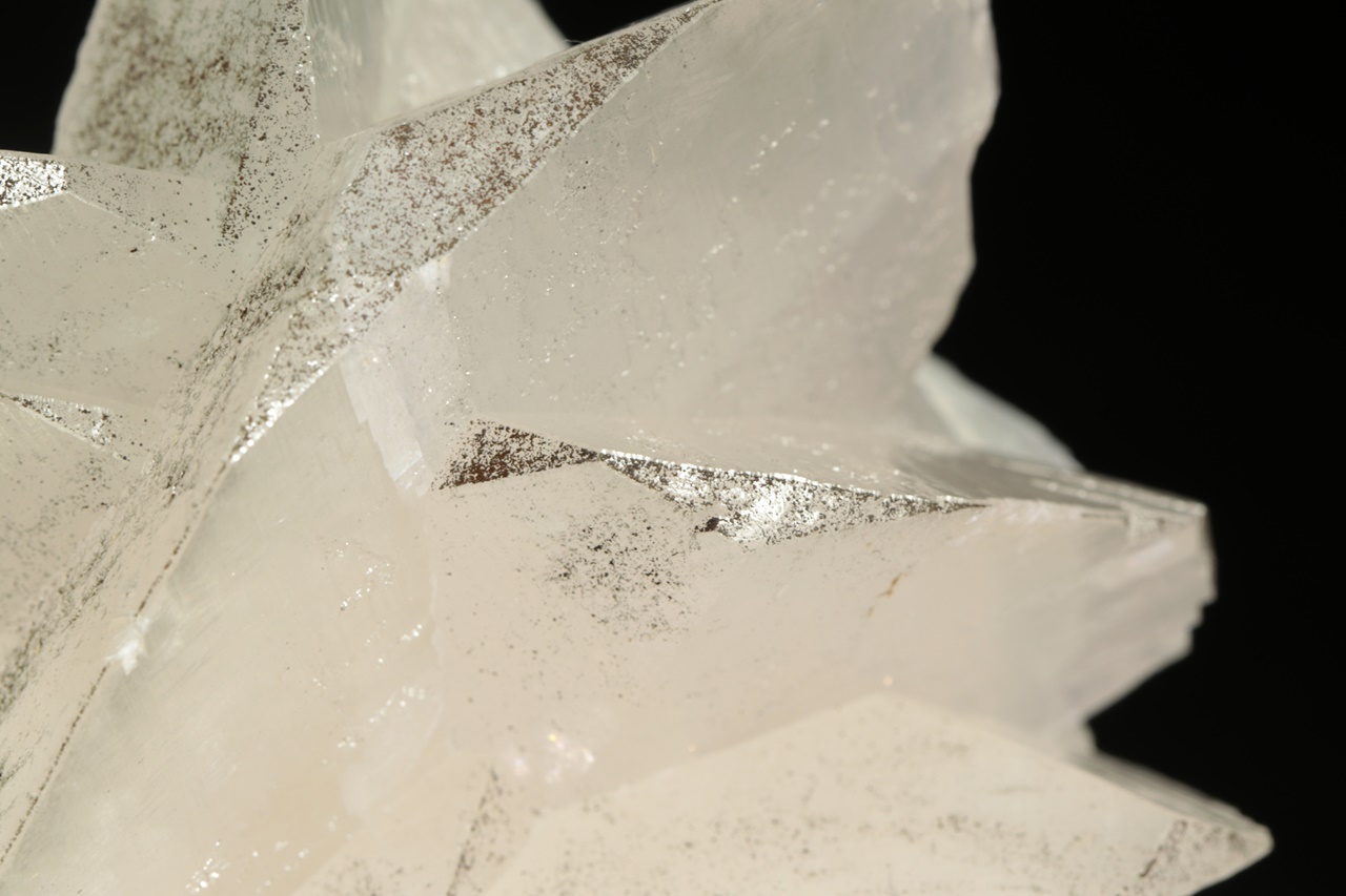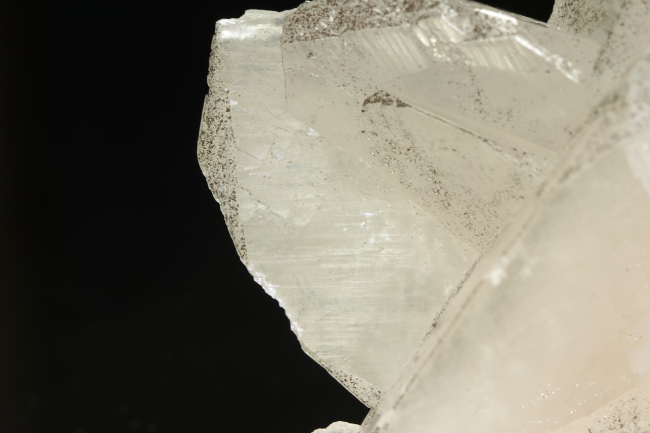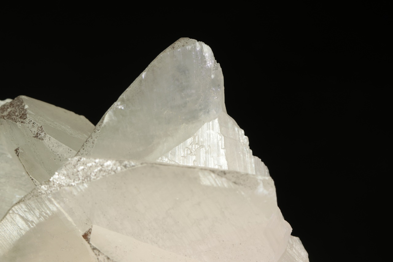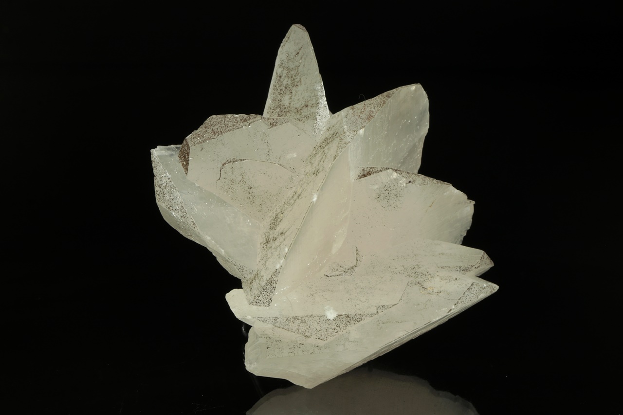 Nádherná srostlice až 9 cm velkých krystalů čirého, průsvitného kalcitu částečně porostlého drobnými kulovitými agregátu pyritu.
