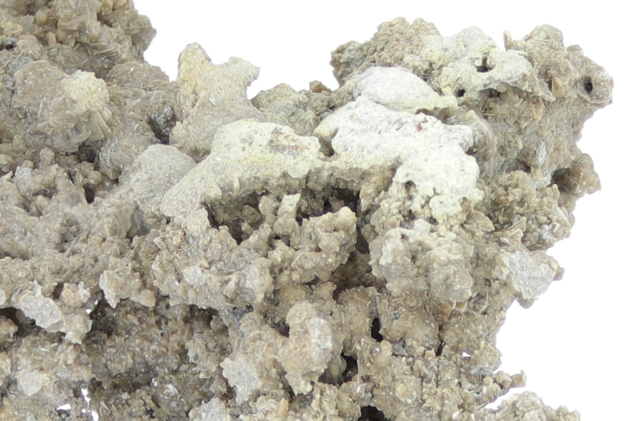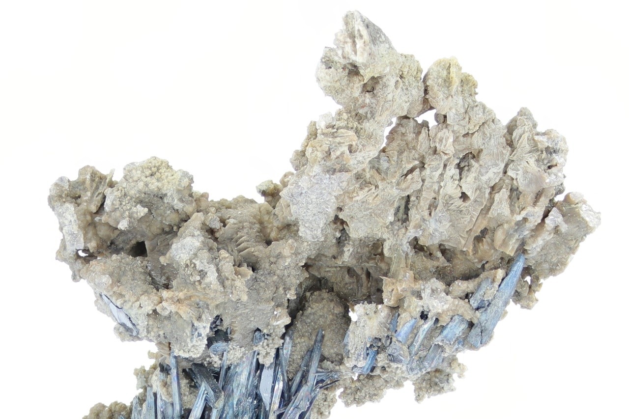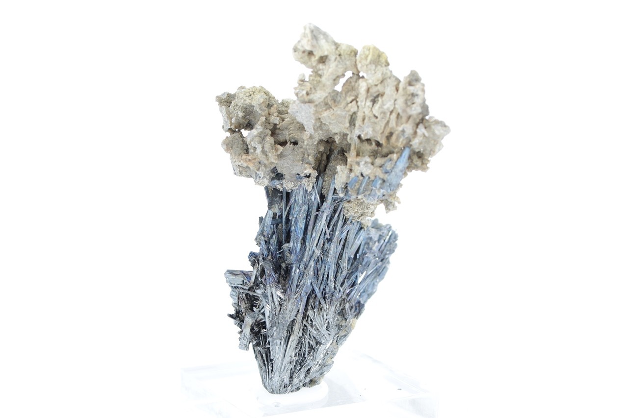 Radiating cluster of metallically lustrous antimonite crystals overlaid by a radial aggregate of beige Valentinite.