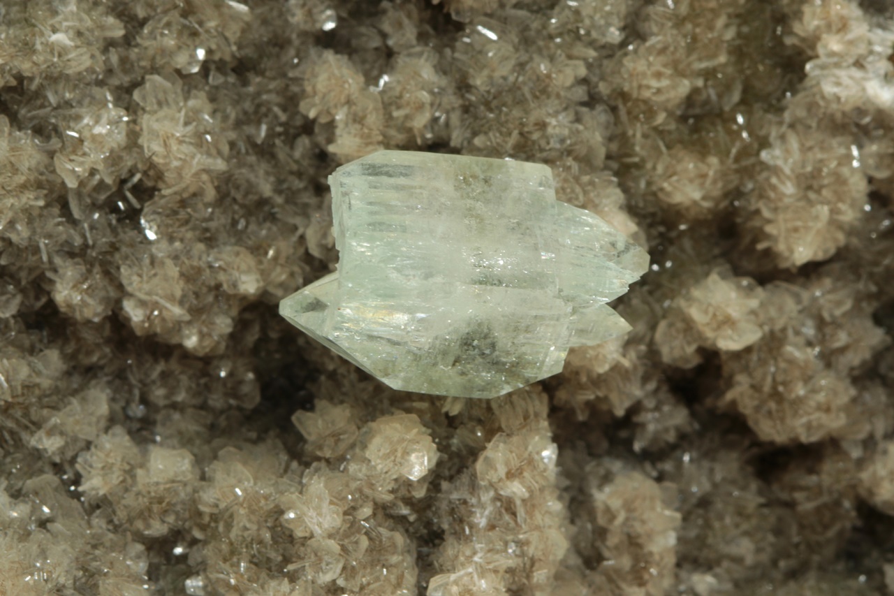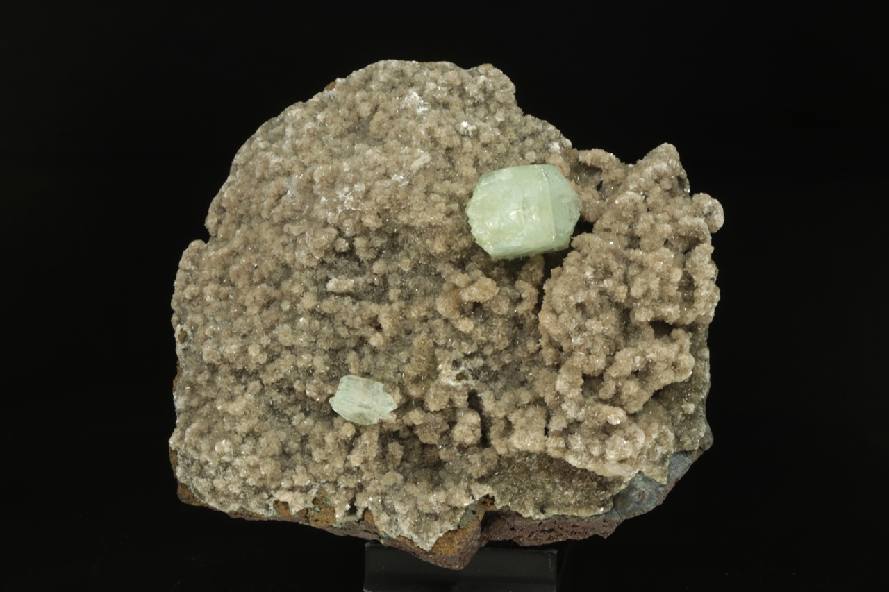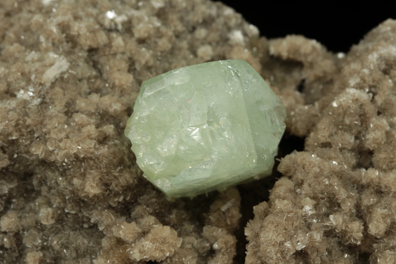 Krystaly světle zeleného apofylitu narostlé na hroznovitých agregátech béžového stilbitu. Větší krystal apofylitu je 2 cm velký.