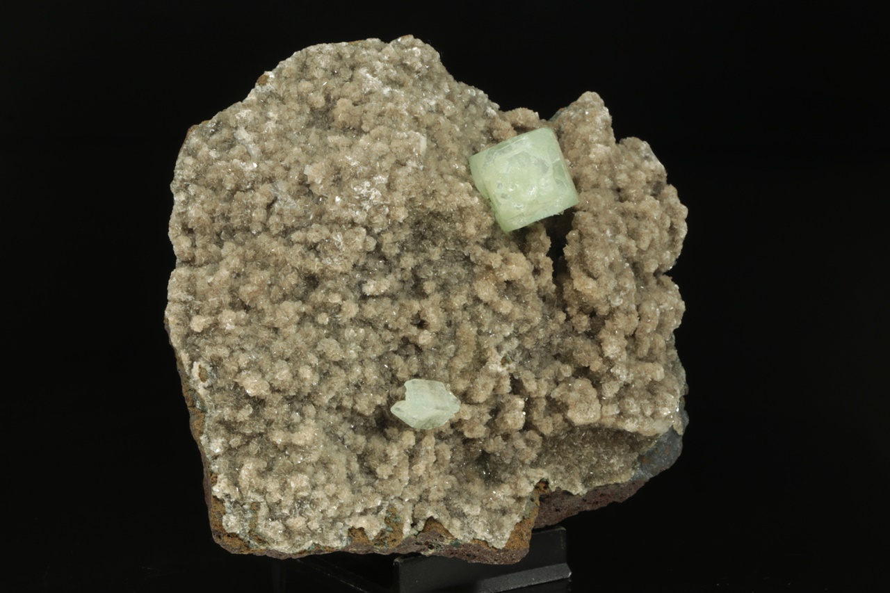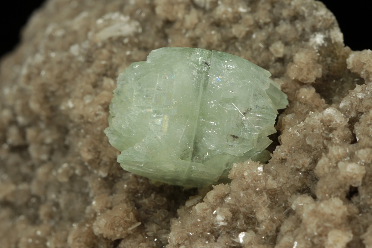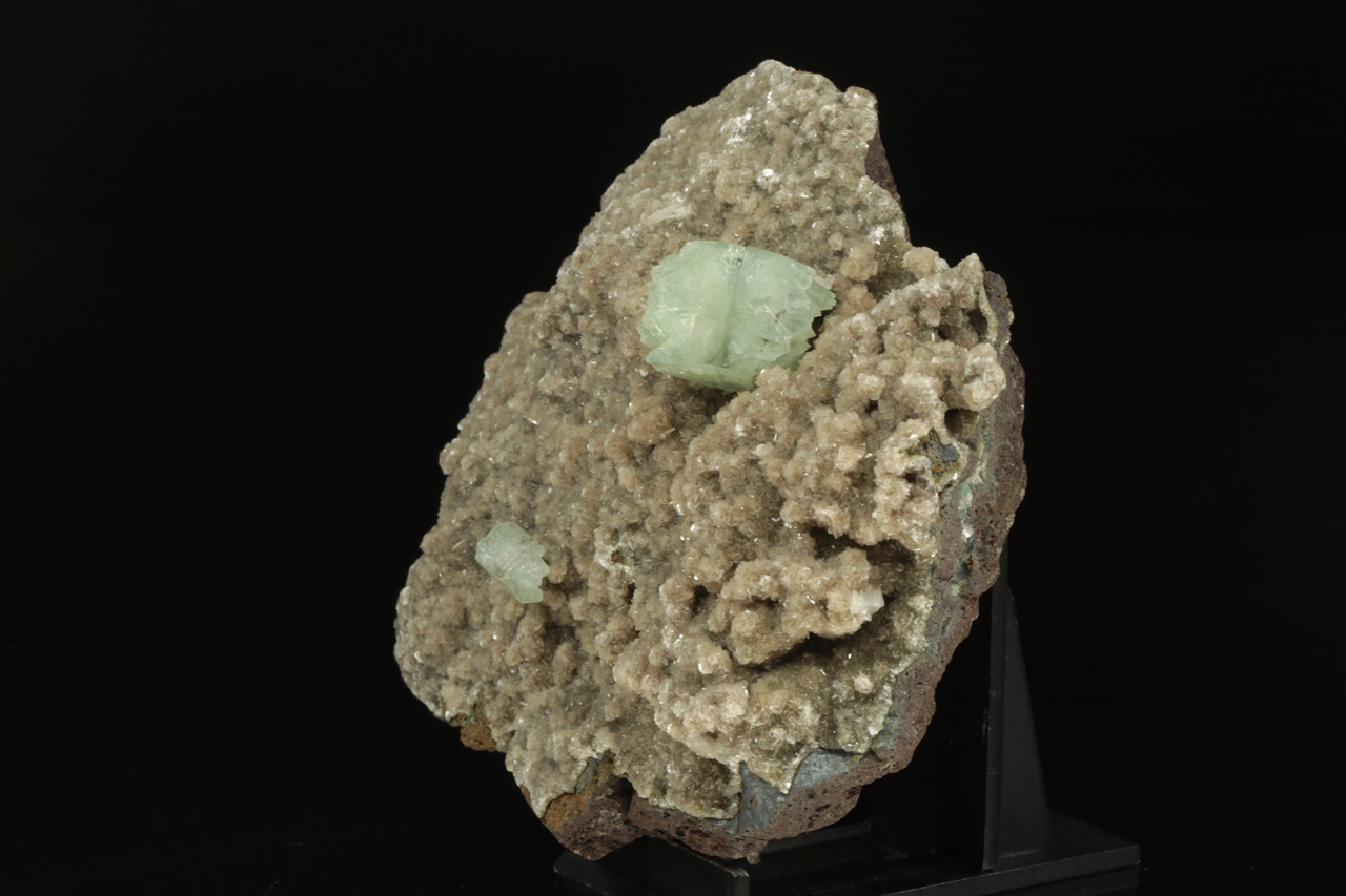 Krystaly světle zeleného apofylitu narostlé na hroznovitých agregátech béžového stilbitu. Větší krystal apofylitu je 2 cm velký.