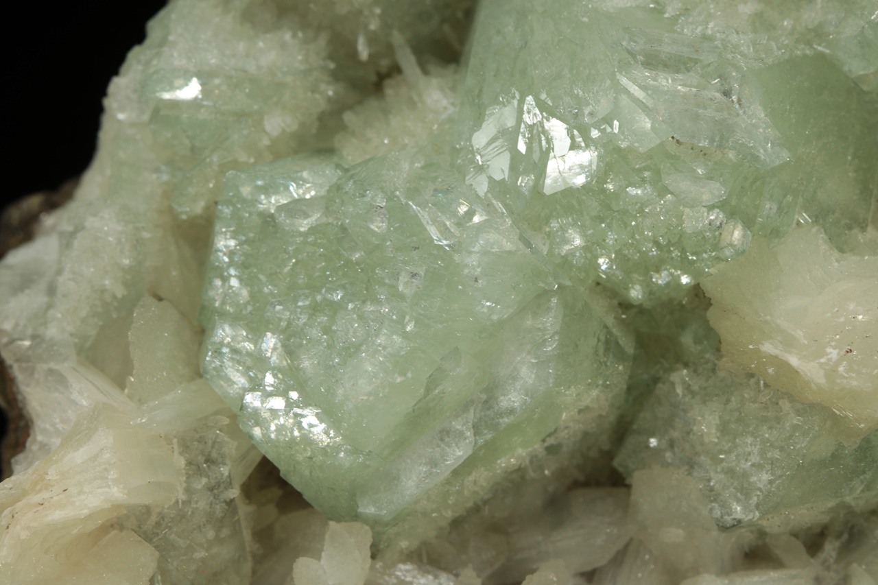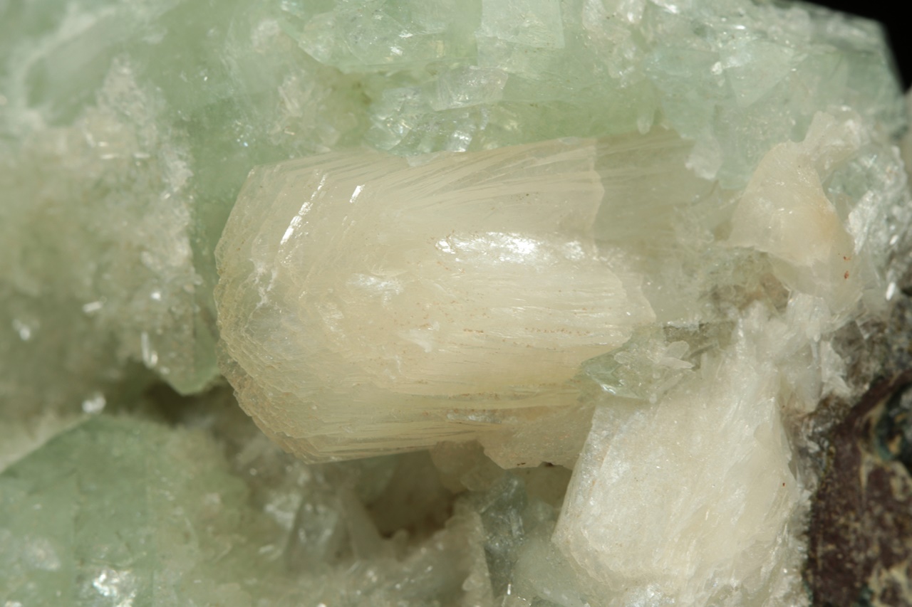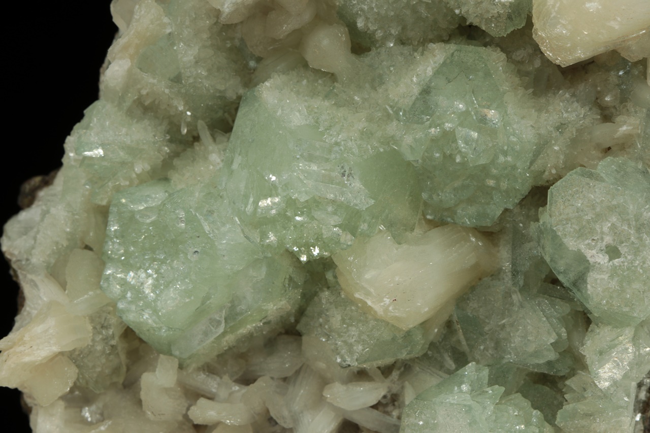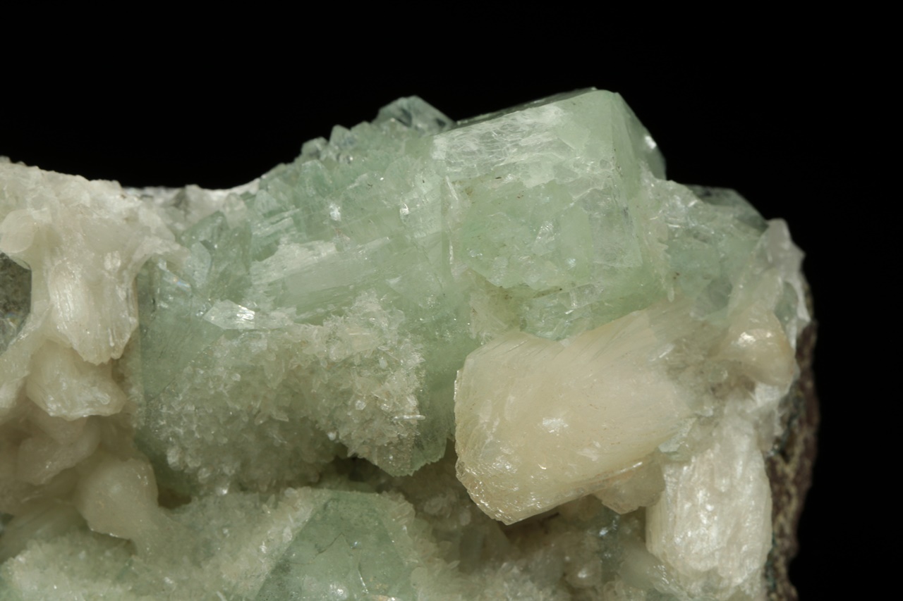 Až dva centimetry velké krystaly světle zeleného apofylitu s bílým lištovitým stilbitem ze známé indické lokality.