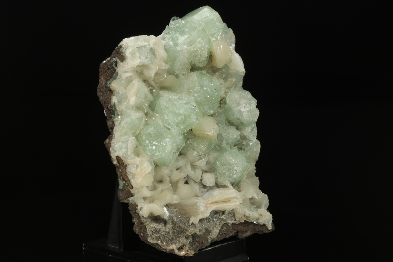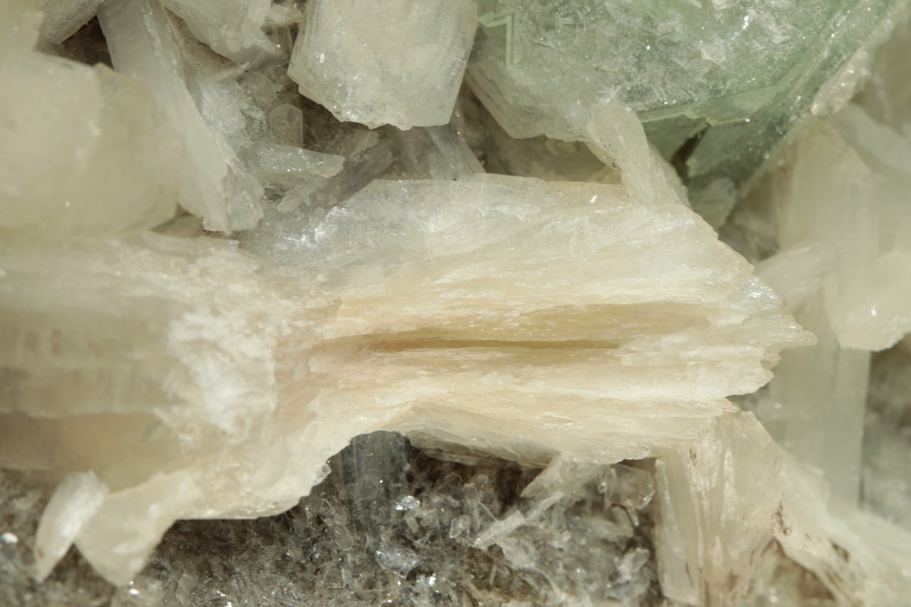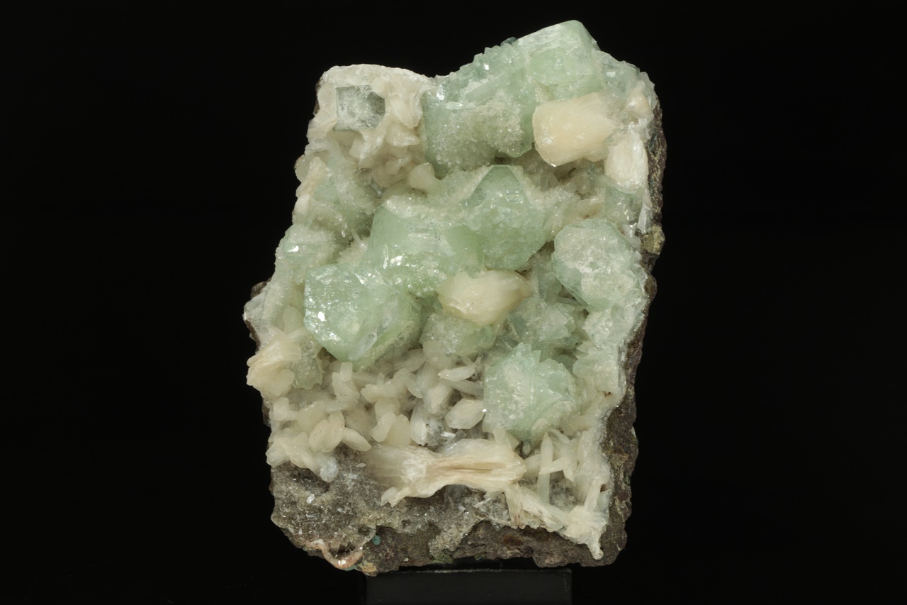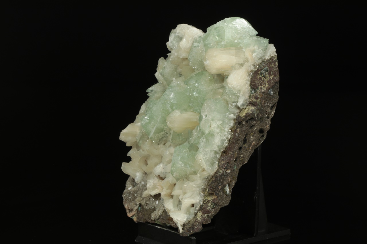 Až dva centimetry velké krystaly světle zeleného apofylitu s bílým lištovitým stilbitem ze známé indické lokality.