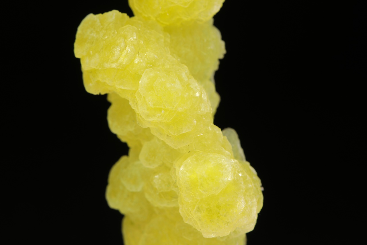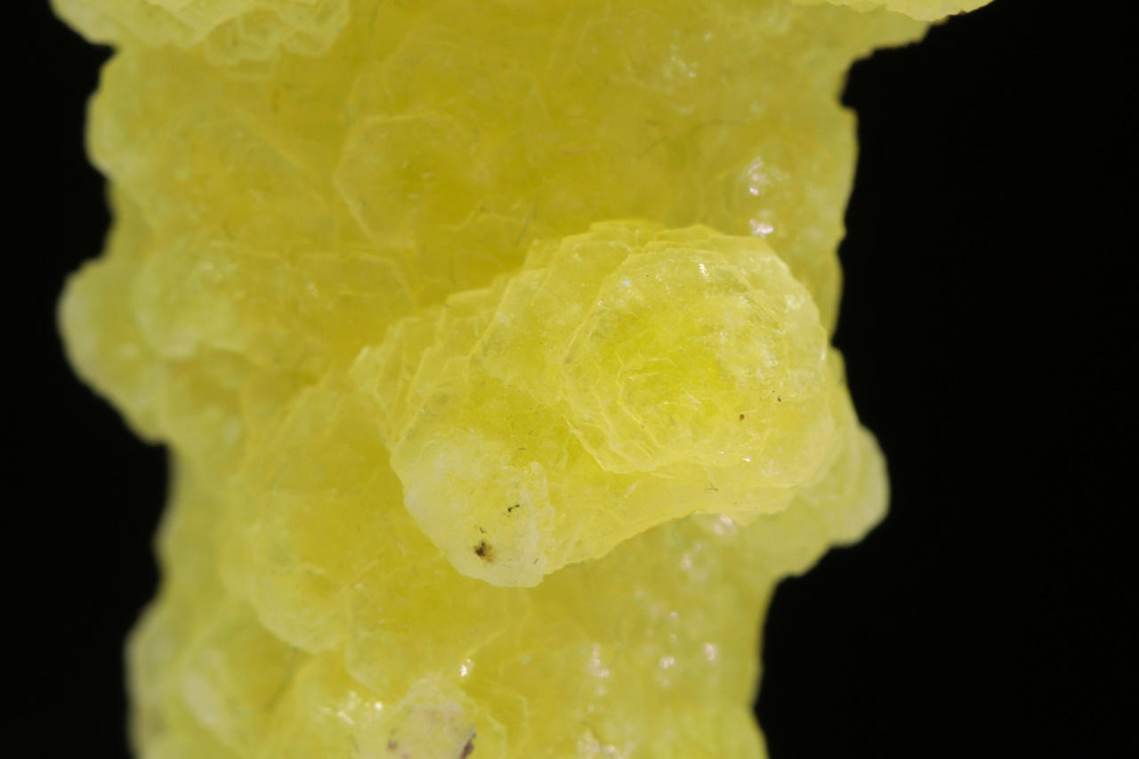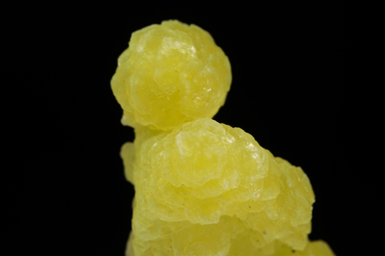 Kidney-shaped aggregates of intensely yellow, waxy-luster magnesium hydroxide.