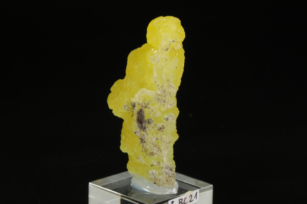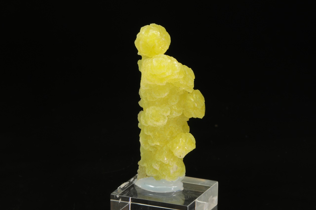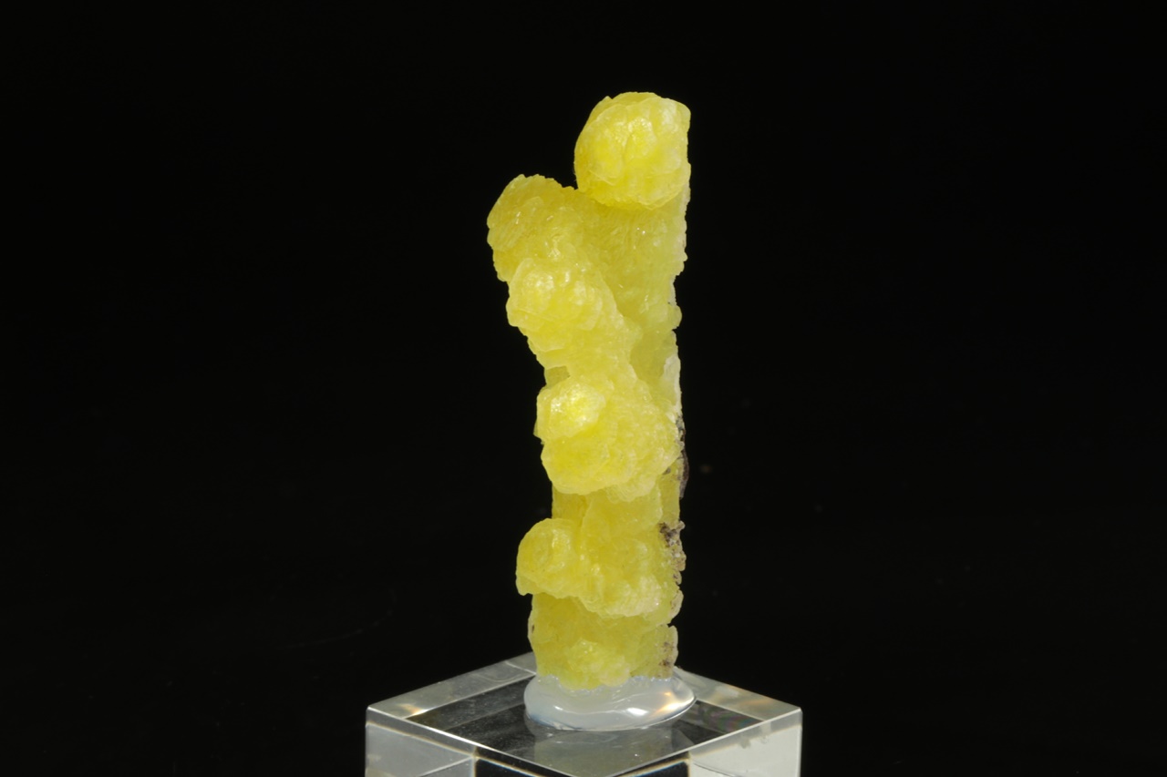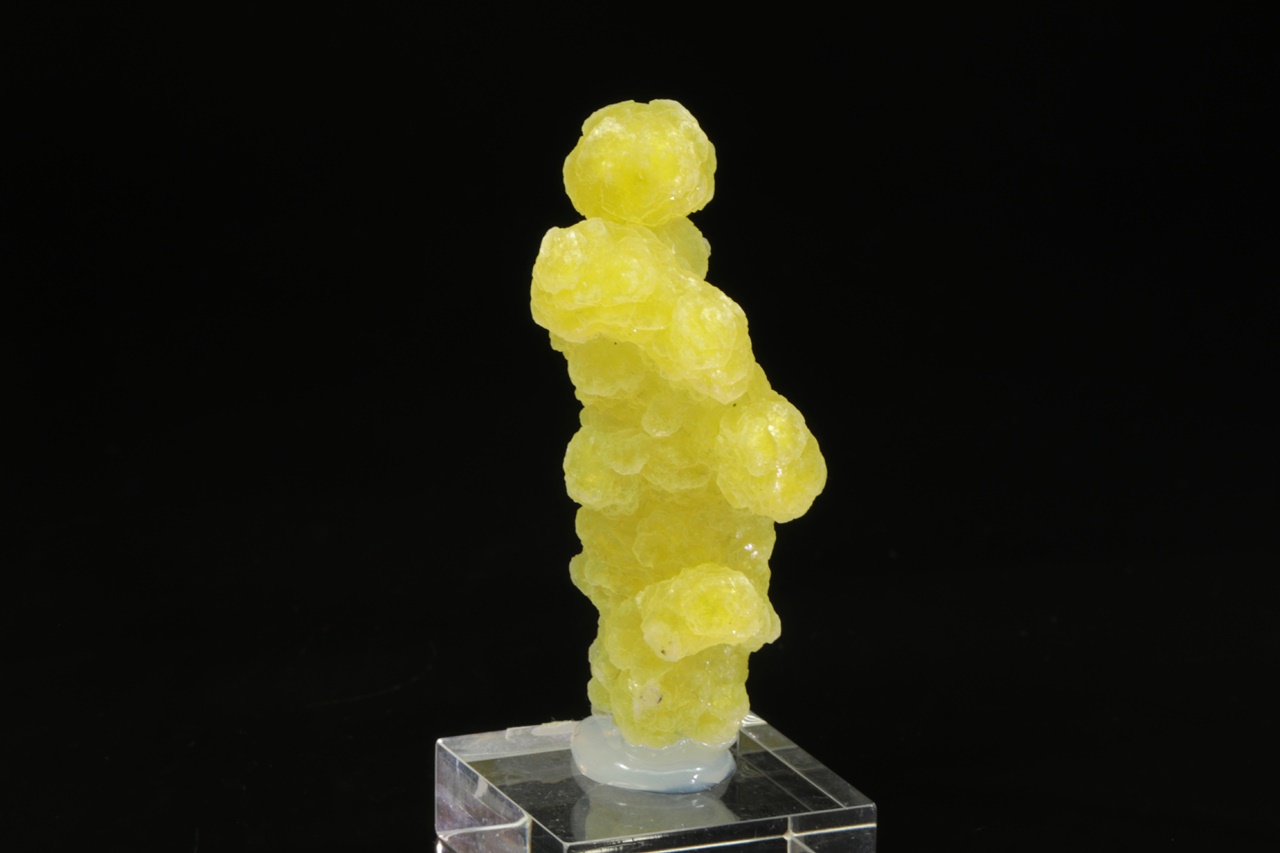 Kidney-shaped aggregates of intensely yellow, waxy-luster magnesium hydroxide.