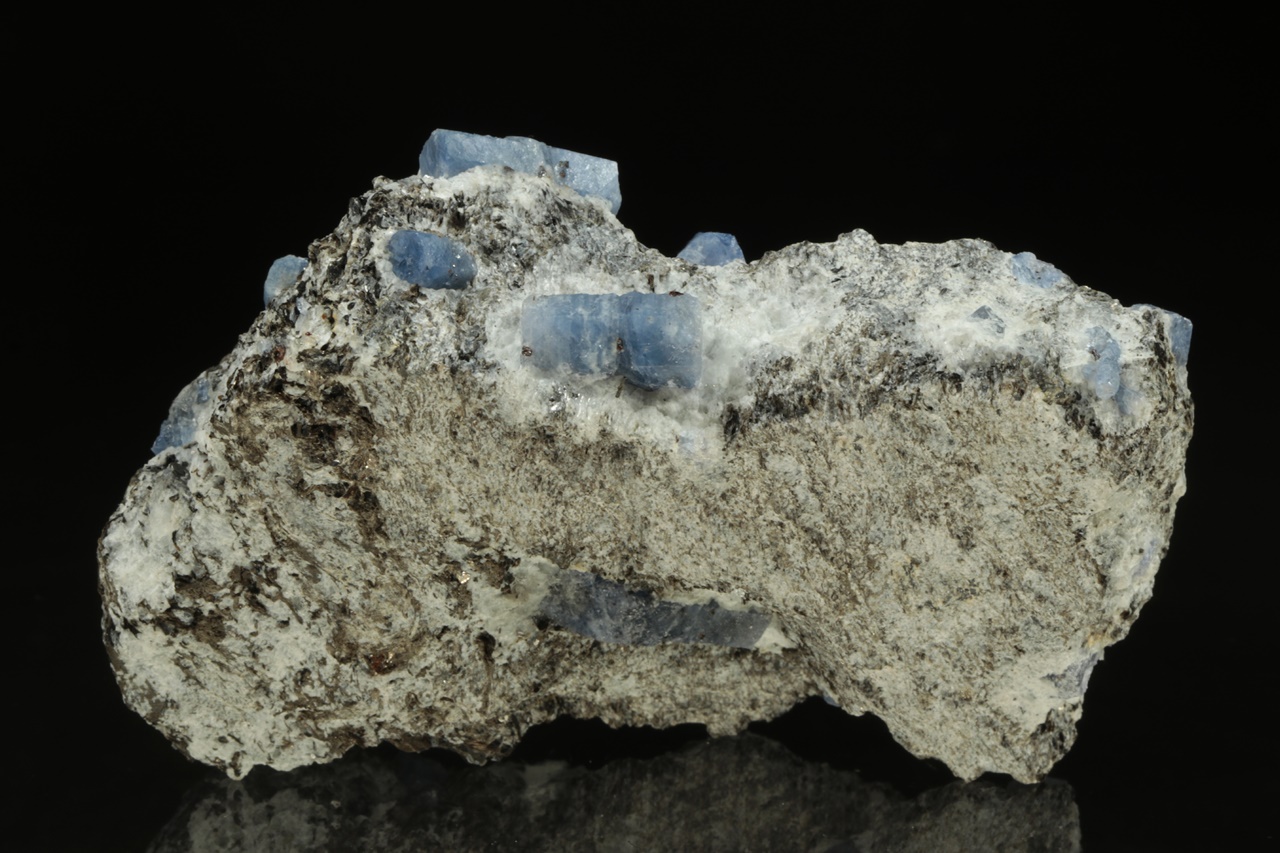 Sloupcovité, dobře omezené krystaly modrého safíru bohatě narostlé v mateční hornině. Největší krystal je 18 mm velký.