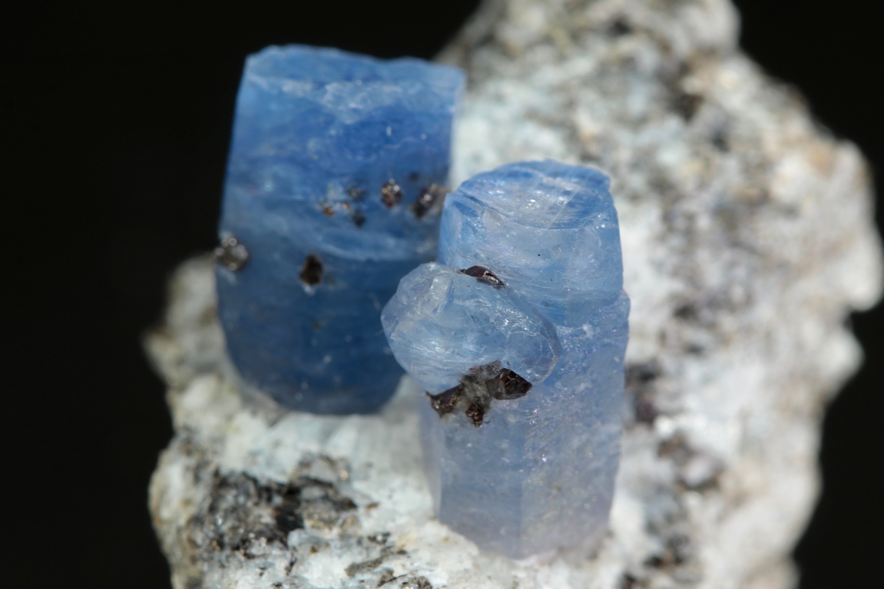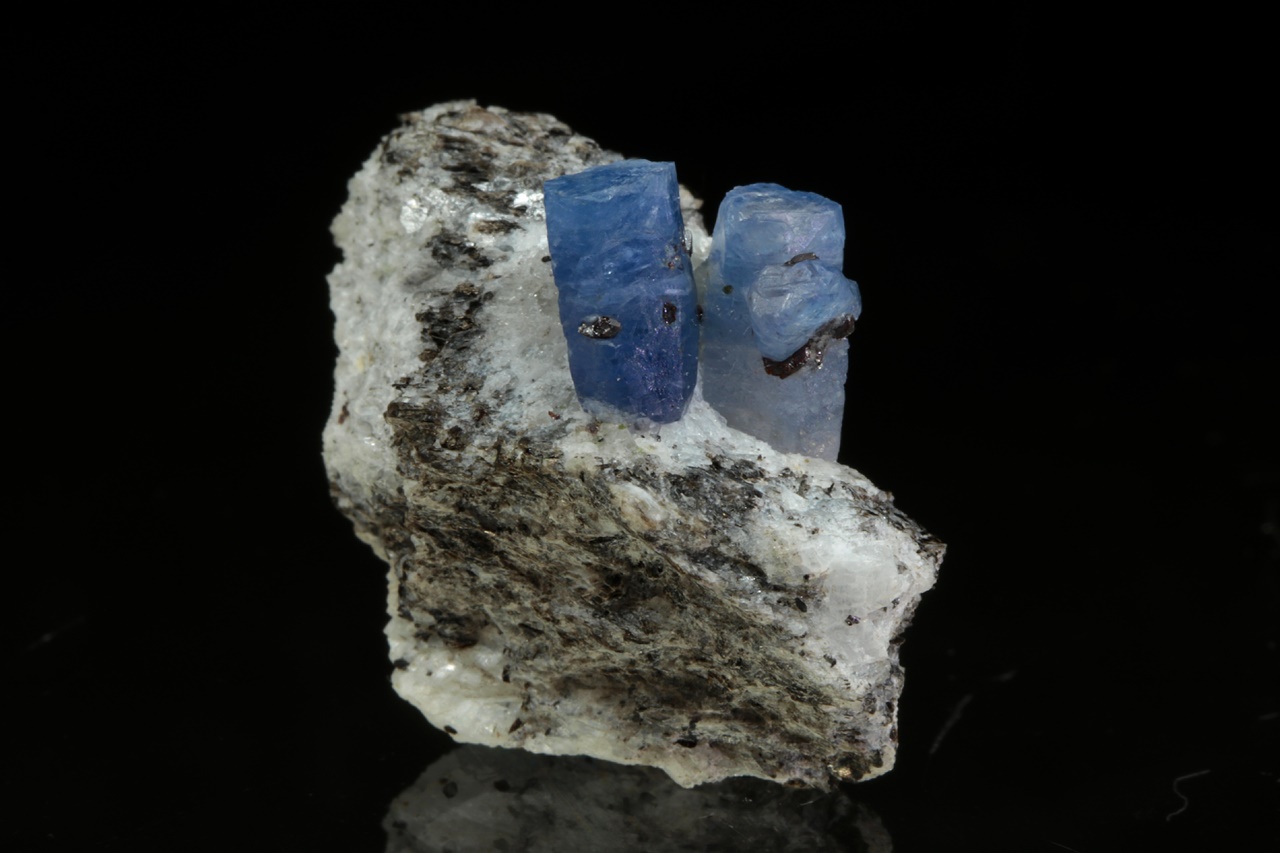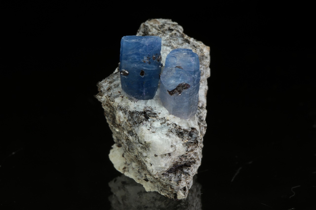 Menší, zato ale velmi estetický vzorek dvou krystalů modrého safíru v různých odstínech. Velikost krystalů je 8 a 10 mm.