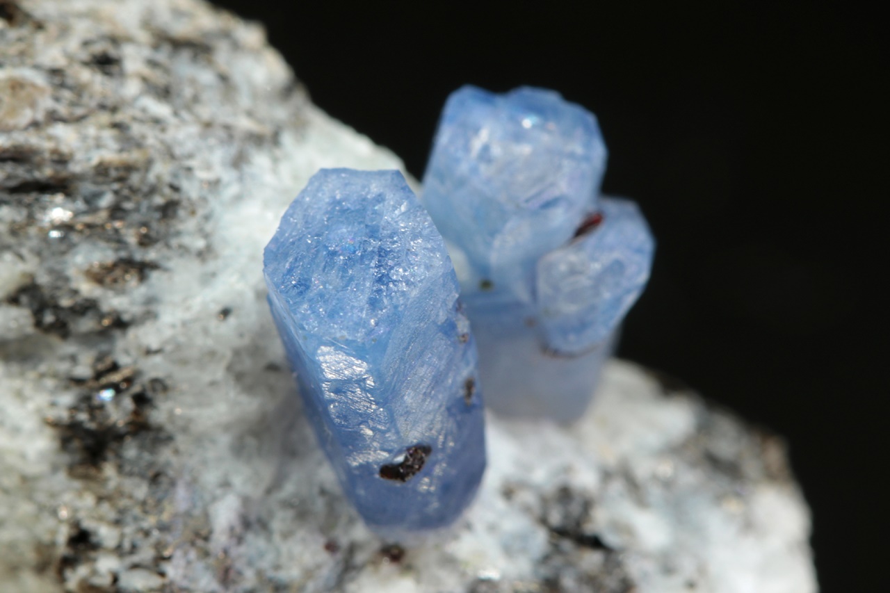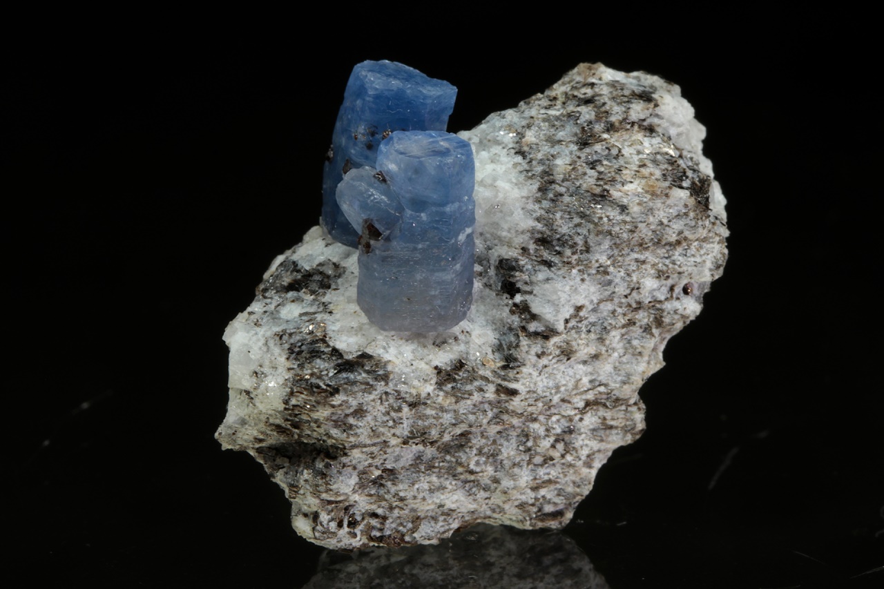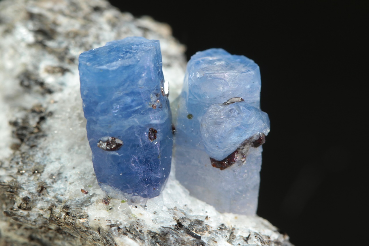 Menší, zato ale velmi estetický vzorek dvou krystalů modrého safíru v různých odstínech. Velikost krystalů je 8 a 10 mm.