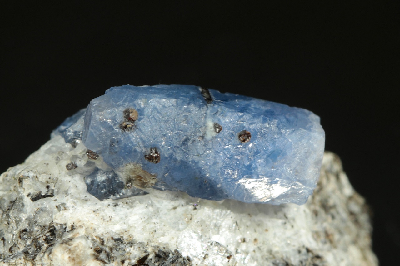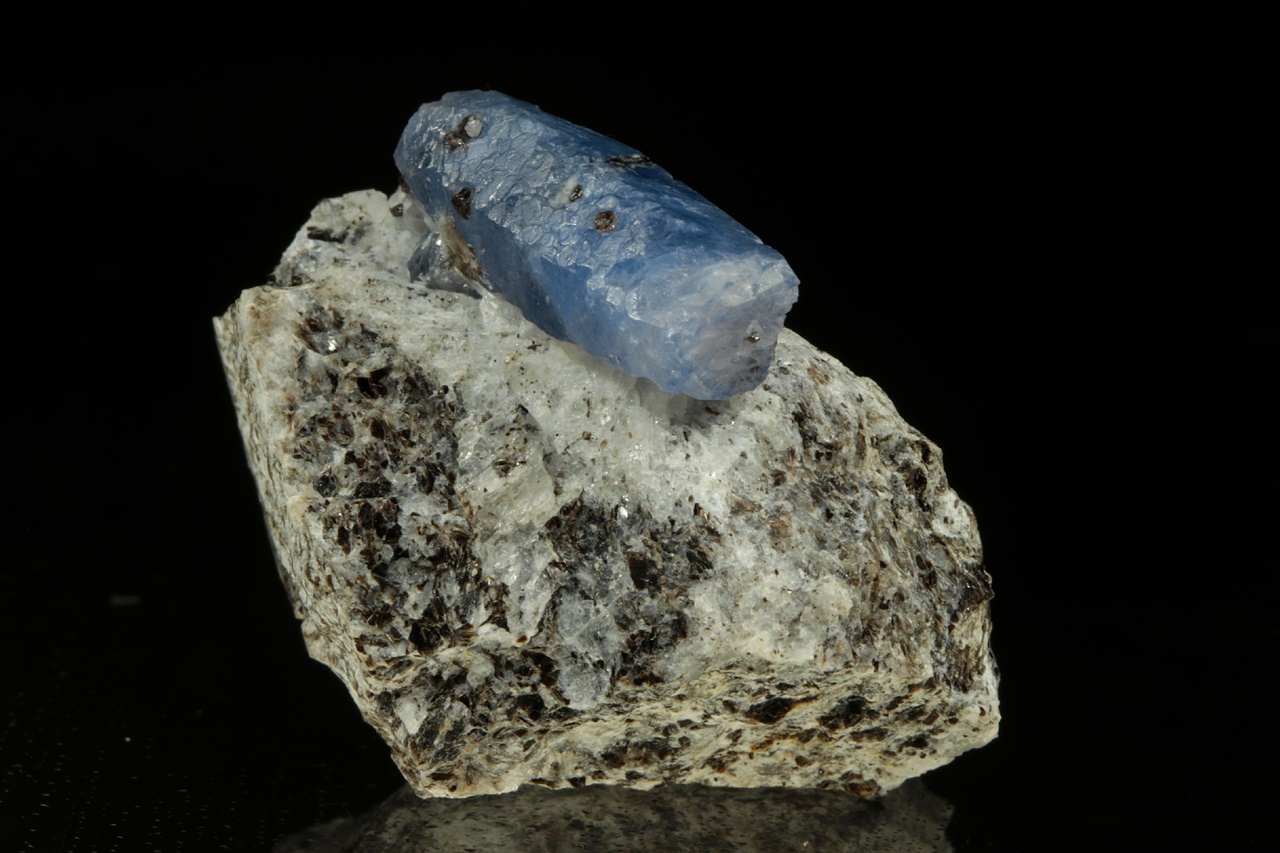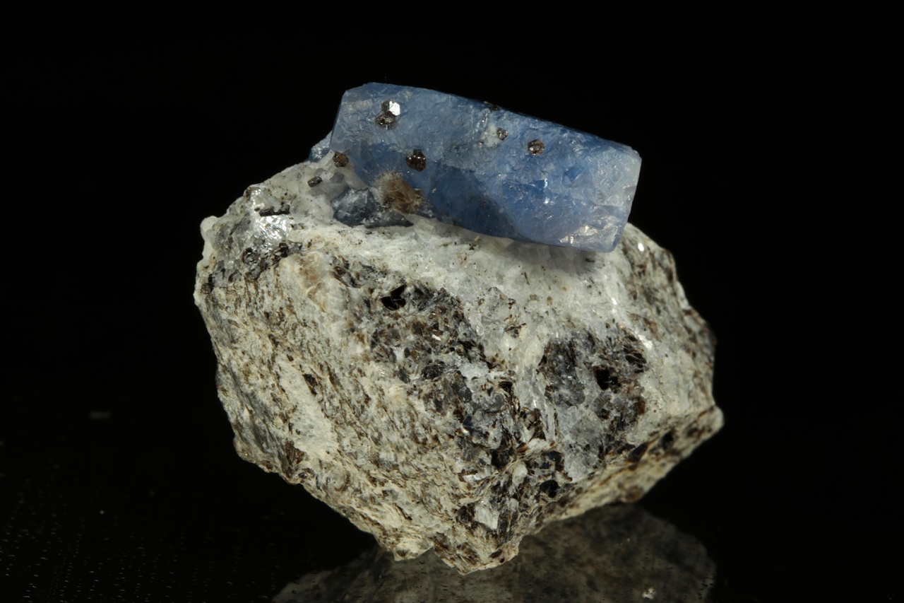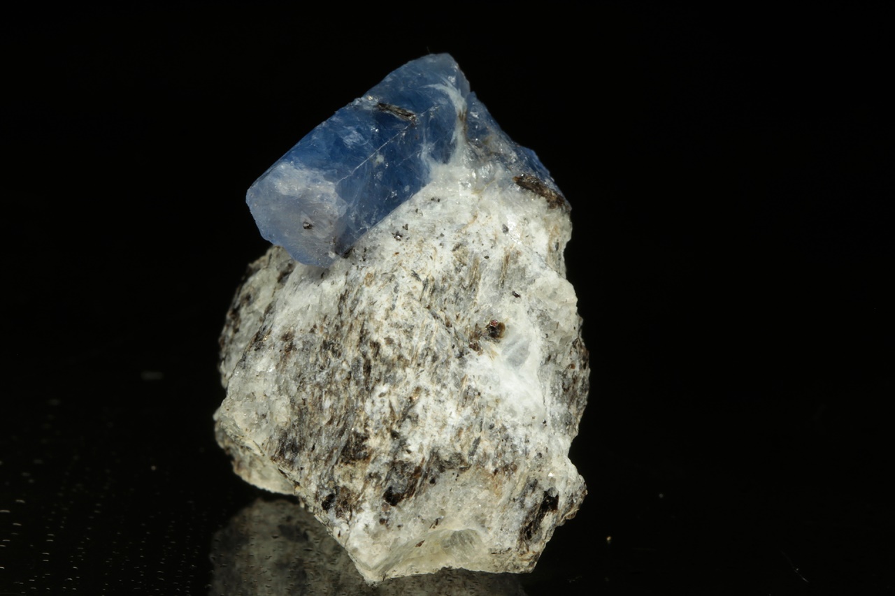 Patnáct milimetrů velký, dobře omezený krystal modrého safíru. Safír je zajímavý svou zonálností, kdy konce krystalu přecházejí lehce do růžova.