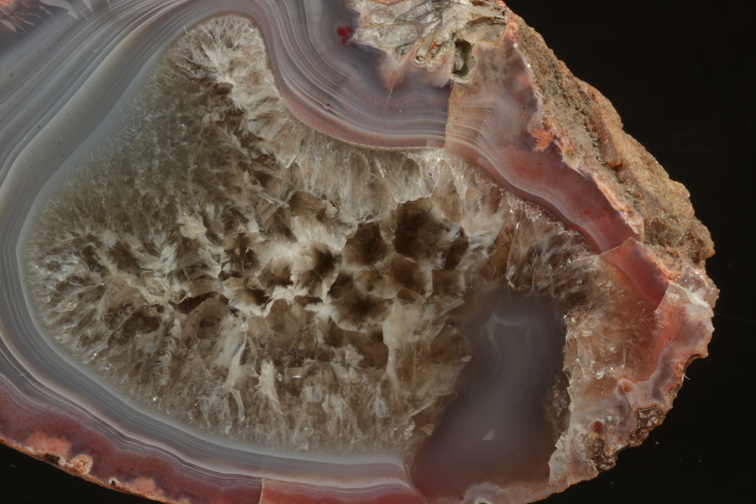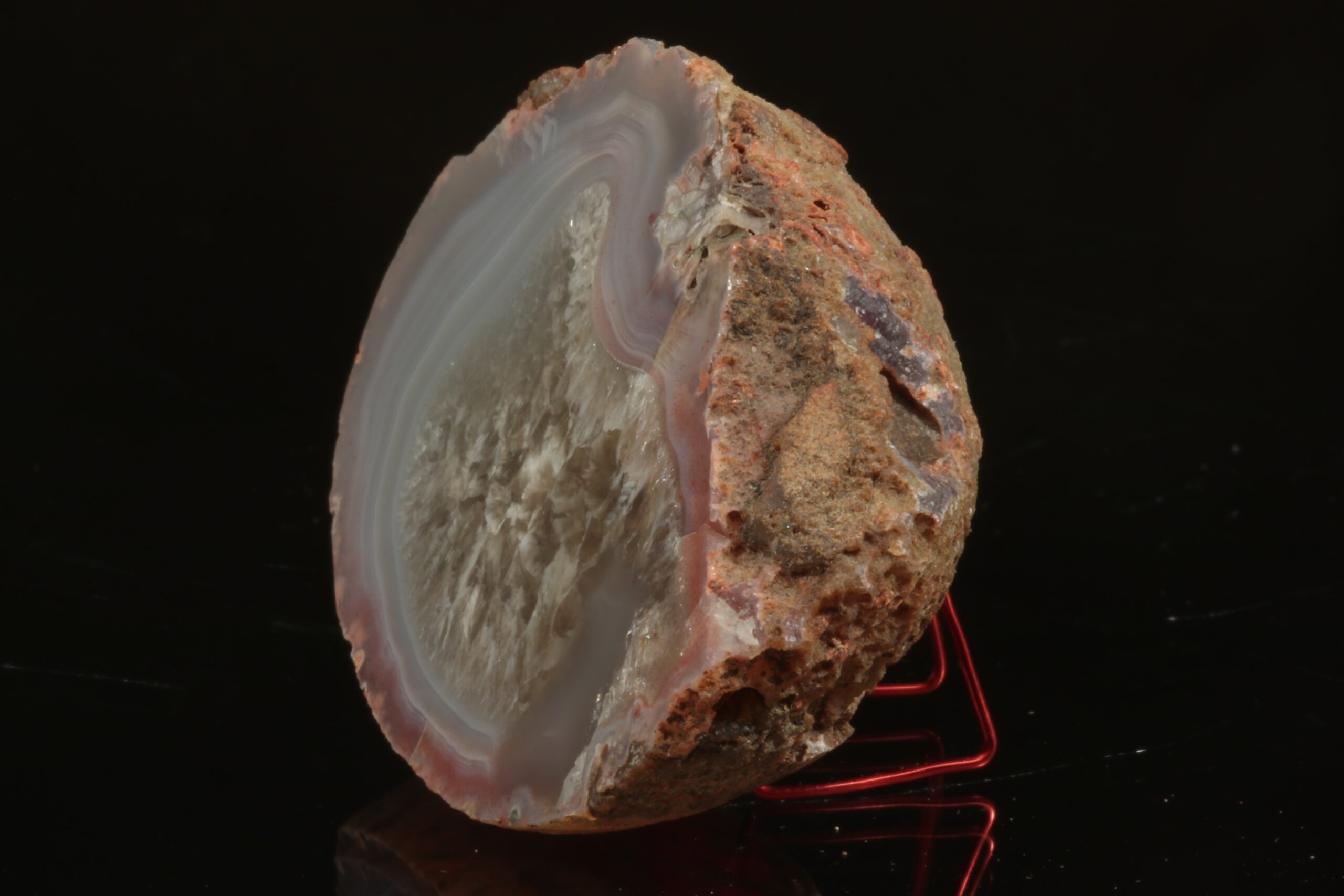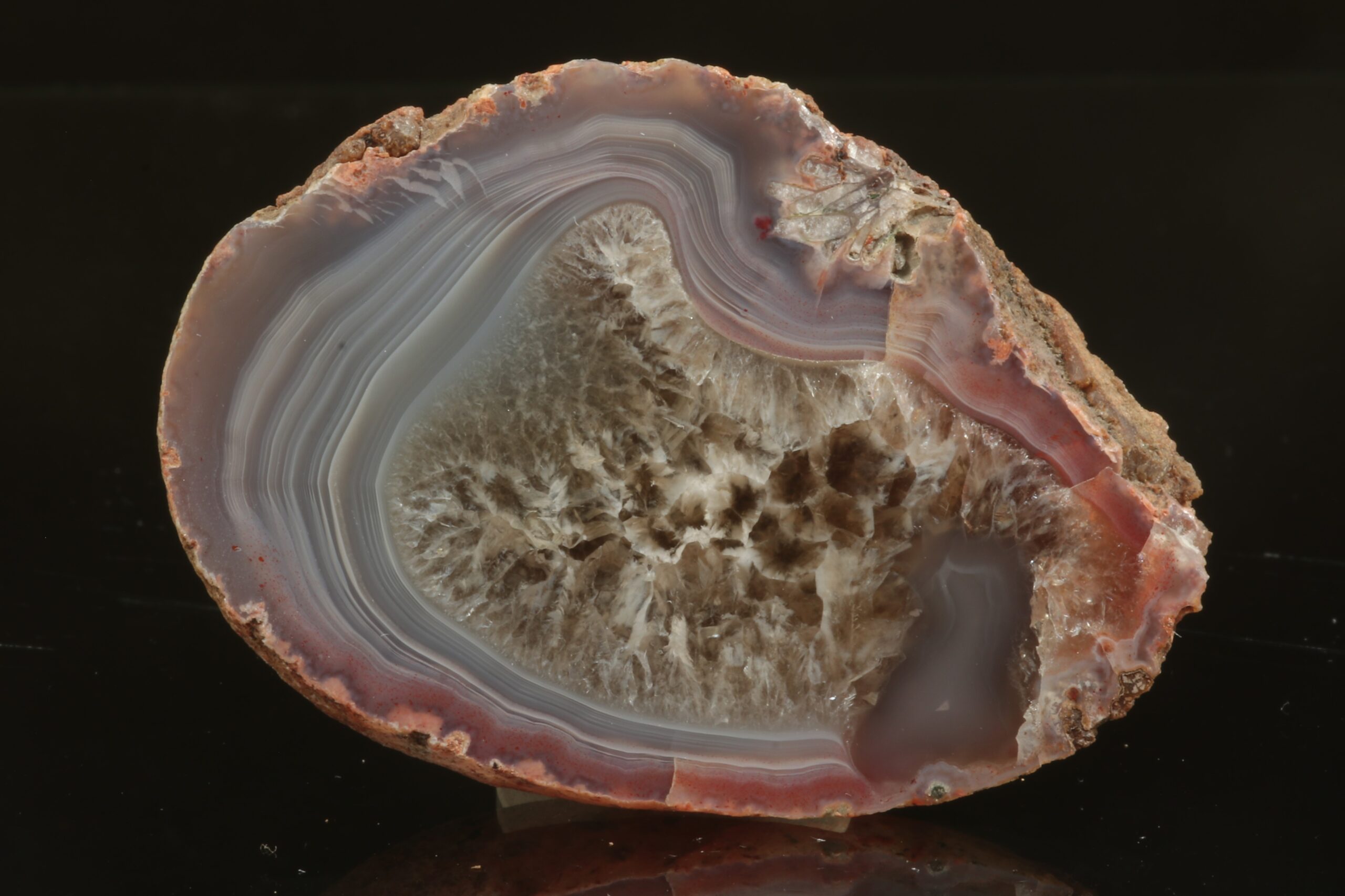 An exceptionally beautiful sample of agate from the Rašovka locality. The pattern includes a crystalline form of quartz, which is bordered by pastel-colored amorphous agate material. The stone is polished on one side and is perfectly terminated on the other.