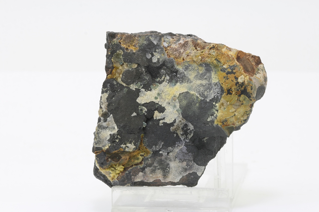 Ledvinité agregáty allemontitu porostlé skvrnami tmavě zeleného parasymplesitu.