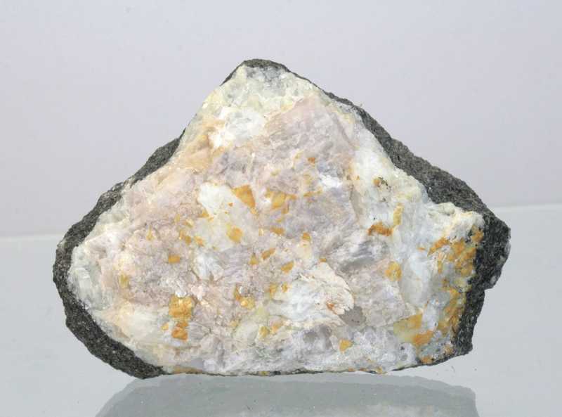 An interesting specimen of the not-so-common anhydrite from Zbýšov. A very nice specimen of pinkish to light violet crystalline aggregates of anhydrite, among which (and into which) orange crystals of dolomite are growing .
