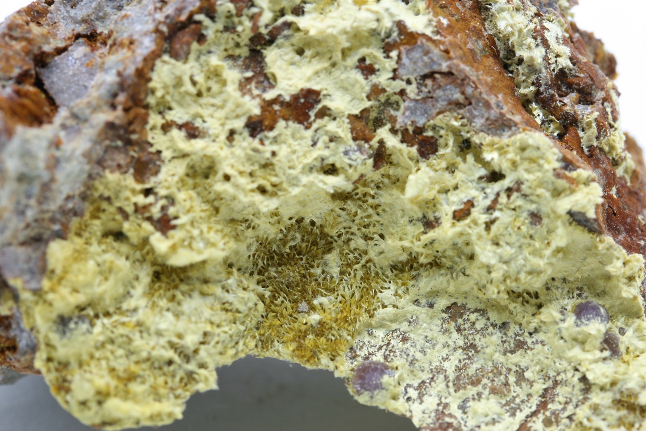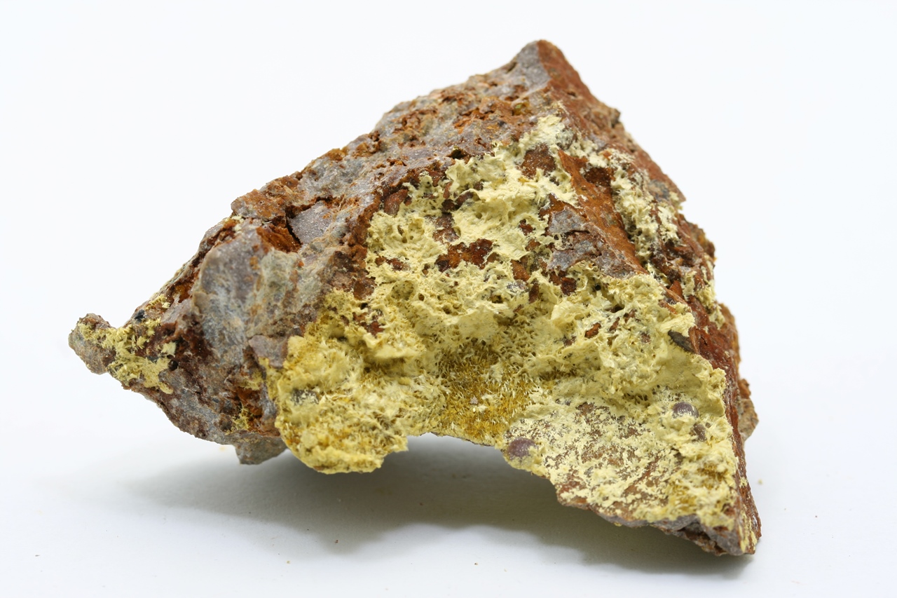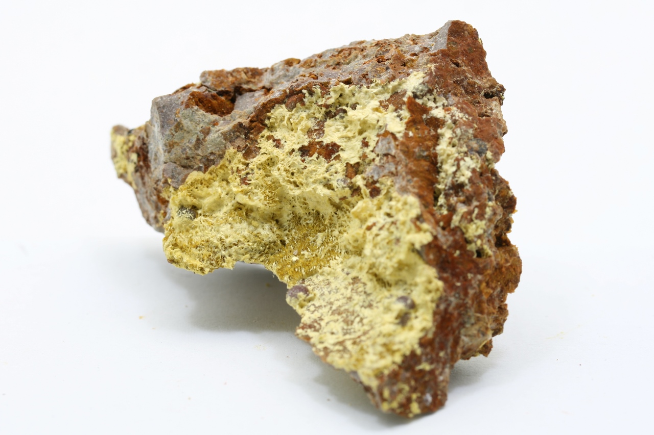 Coatings of yellow fibrous aggregates of cacoxenite. Specimen of iron phosphate from a known locality.