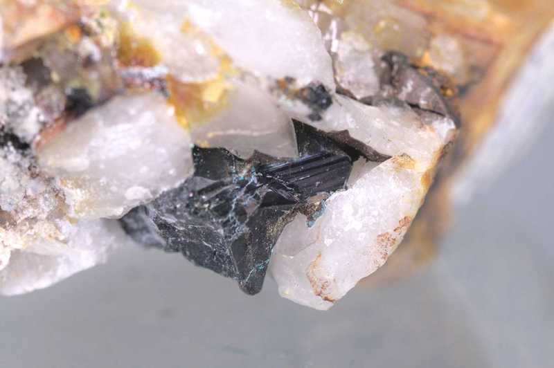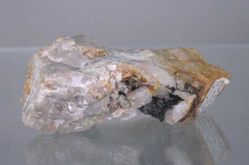 Classic specimen of cassiterite from Horní Slavkov. A specimen of quartz with a cavity, in which there are black shiny crystals of cassiterite; weathered apatites are located in the adjacent cavity.