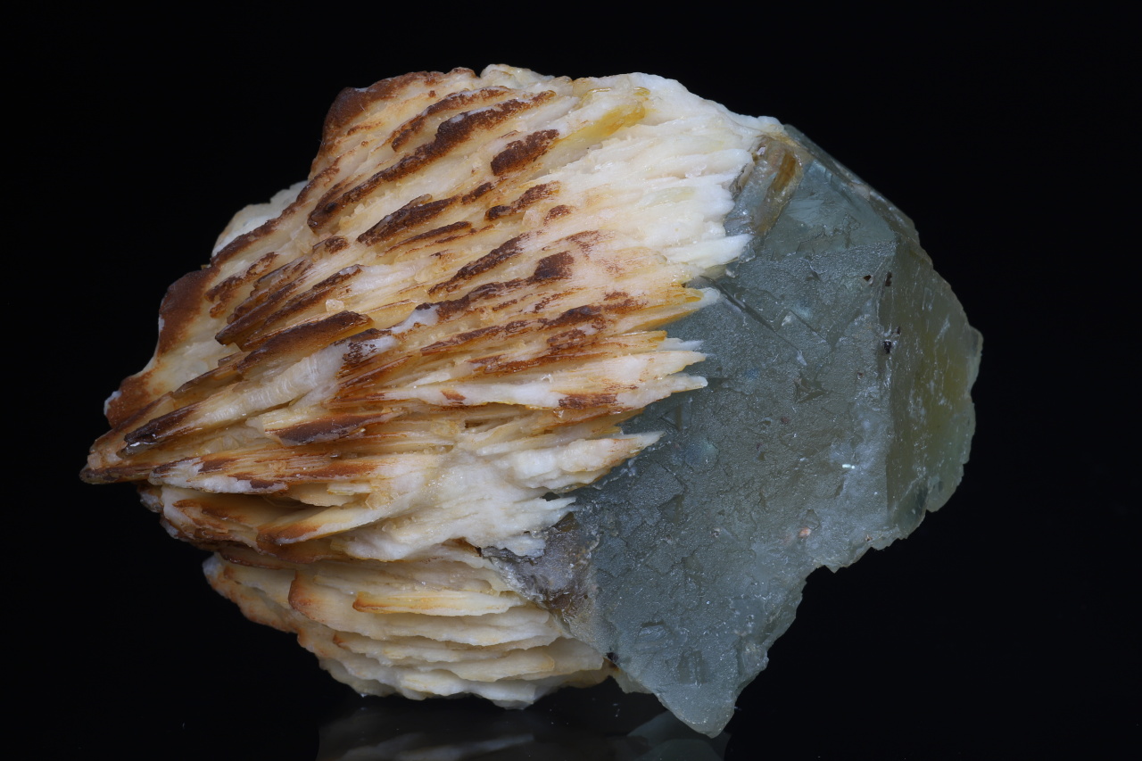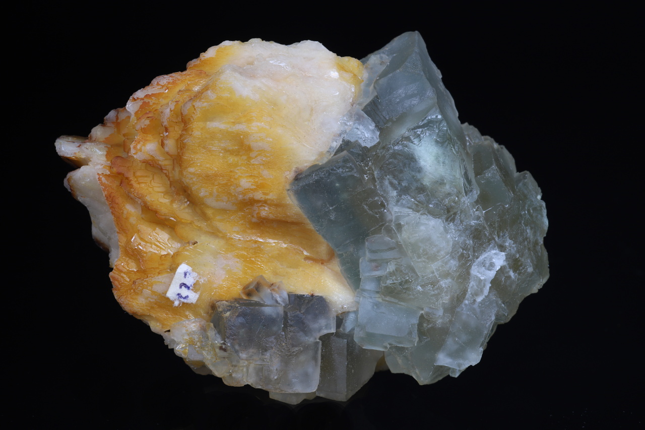 An aesthetic “floater” composed of tabular barite crystals with cubic crystals on the surface of bluish and inside yellow fluorite. The longest edge of the fluorite crystals reaches 4 cm. This quality specimen comes from historical finds at the fluorite-barite deposit in Harrachov in the Krkonoše Mountains.