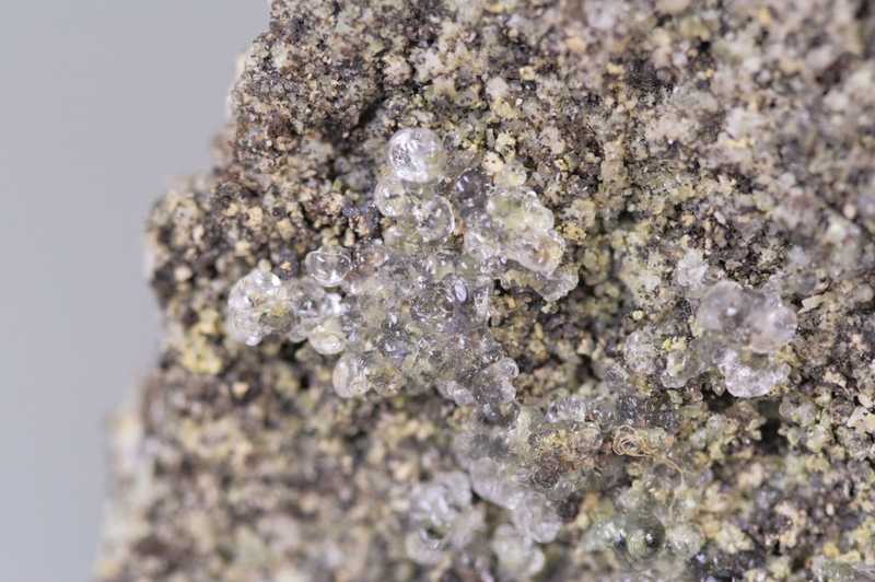 Quality specimen of hyalite – glass opal from the lesser-known locality Vicenice (1976). A nice specimen of hyalite resembling drops of water on the parent platy rock.