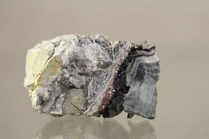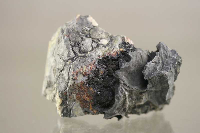 Etched specimen of minerals from the “twenty-one” of Příbram. A specimen of kidney ore arsenic with crystals of sphalerite and galena.