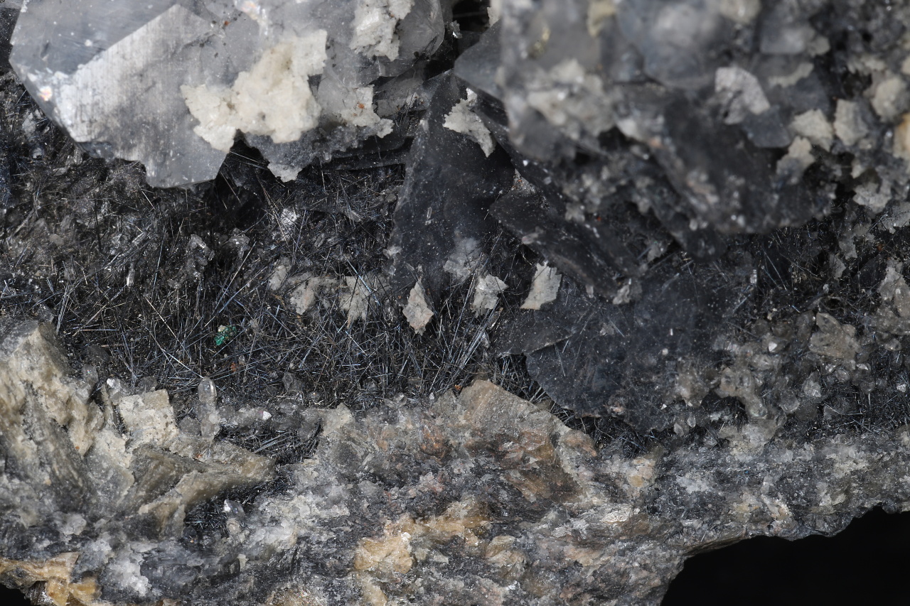 A druse of nailhead spar calcite crystals, which are growing through needle-shaped boulangerite crystals. On the calcite, there are dolomite crystals about 2 mm in size .