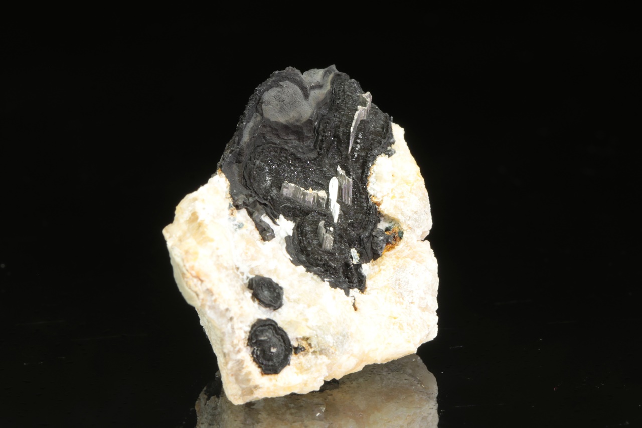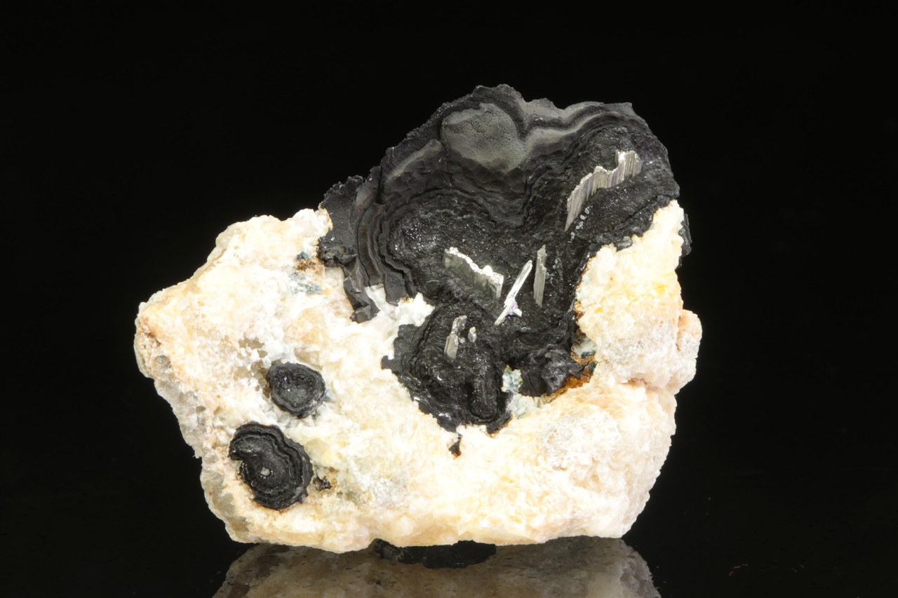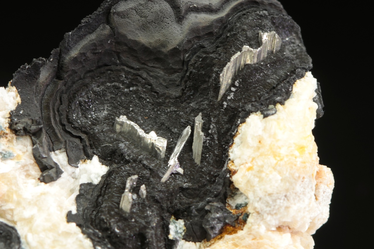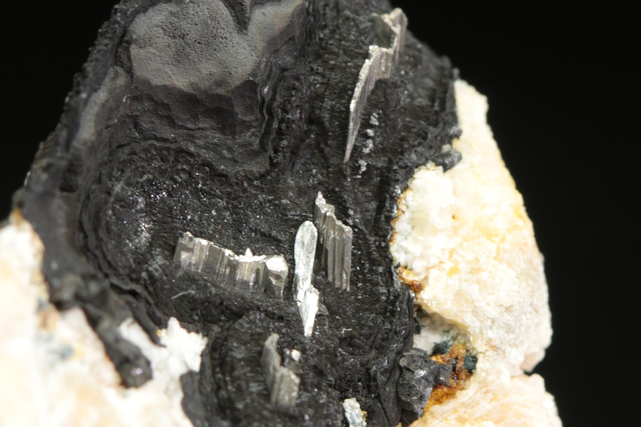 Stříbrně lesklé lištovité krystaly dyskrazitu s charakteristickým rýhováním v černém arsenu.