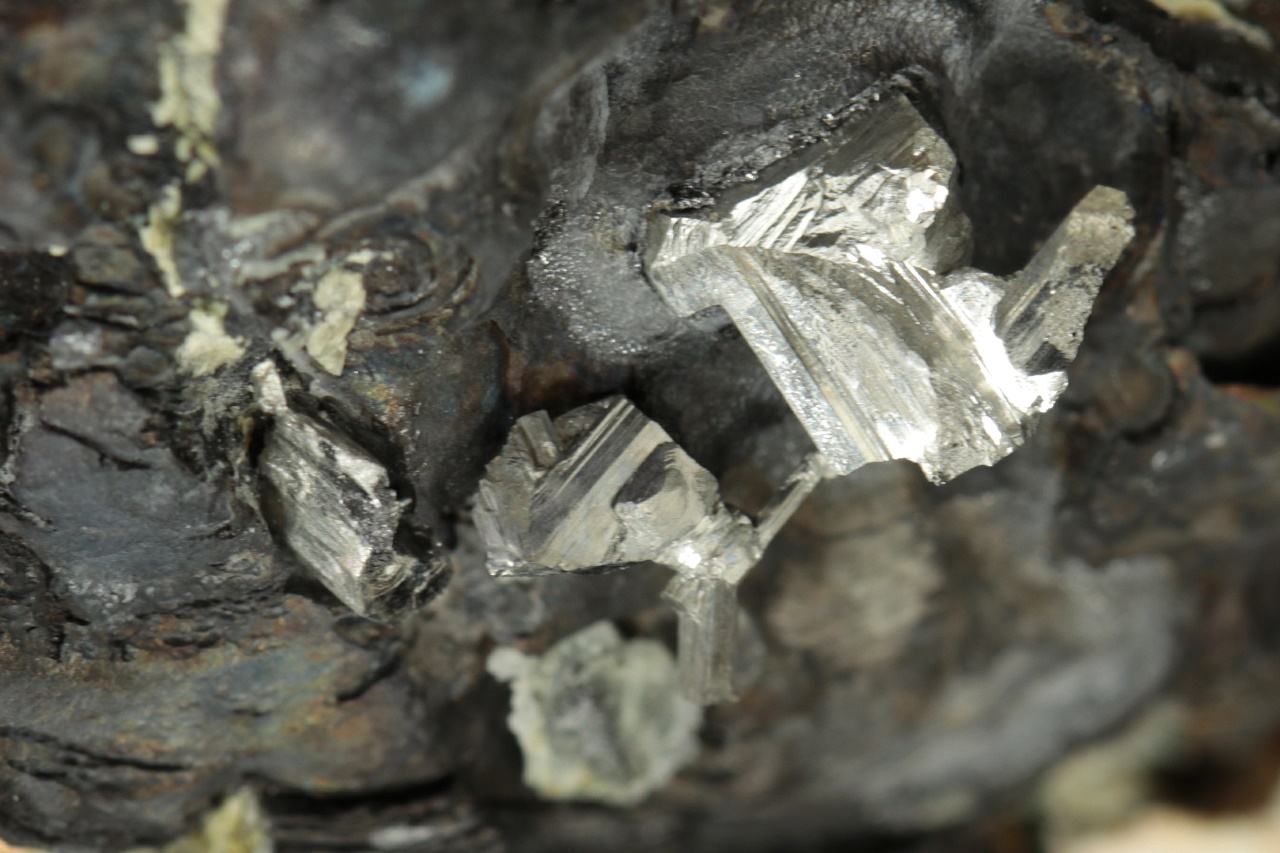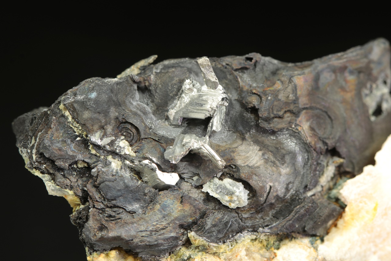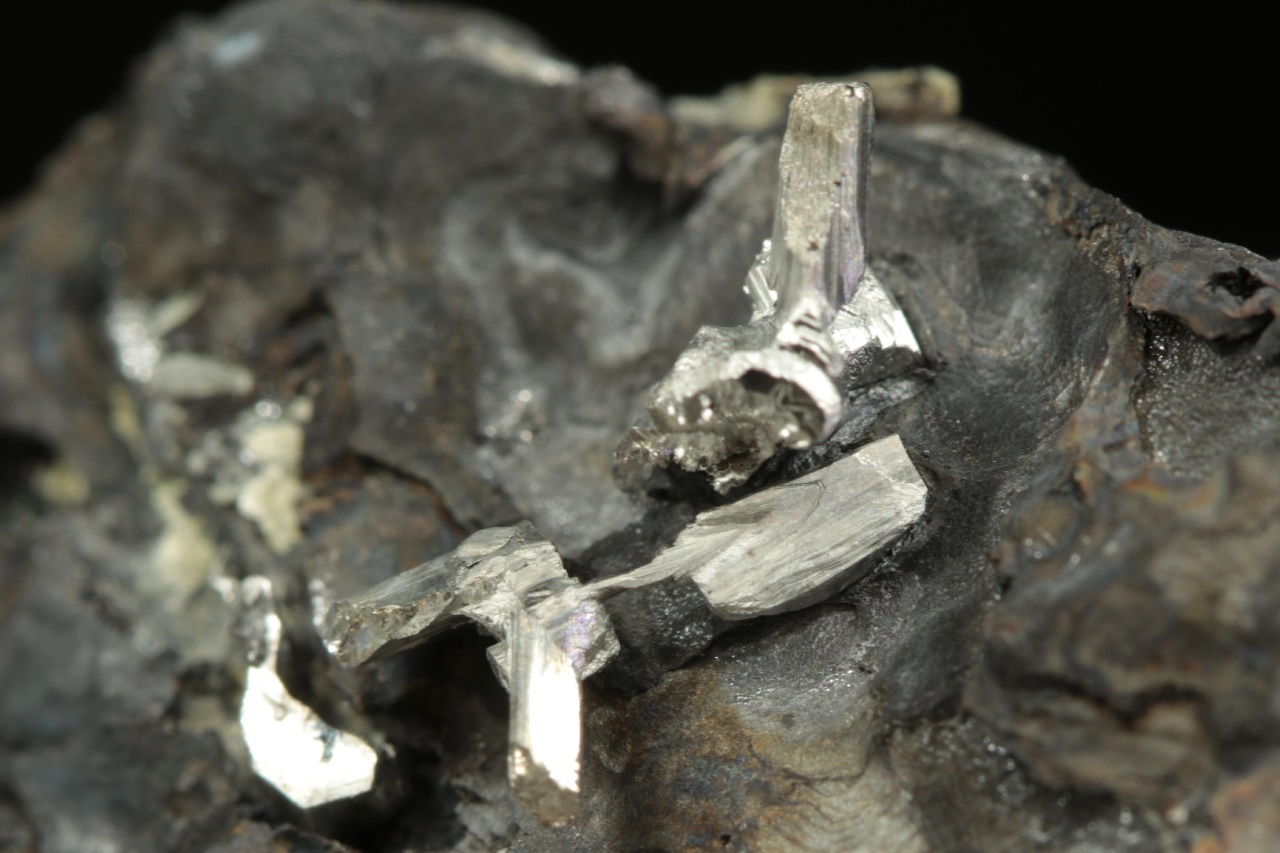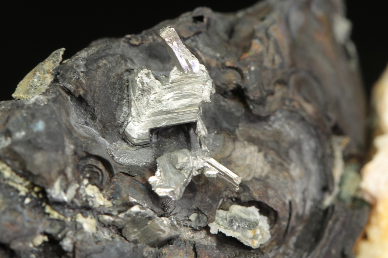 Srostlice stříbrně lesklých lištovitých krystalů dyskrazitu vystupující z masivního černého arsenu.