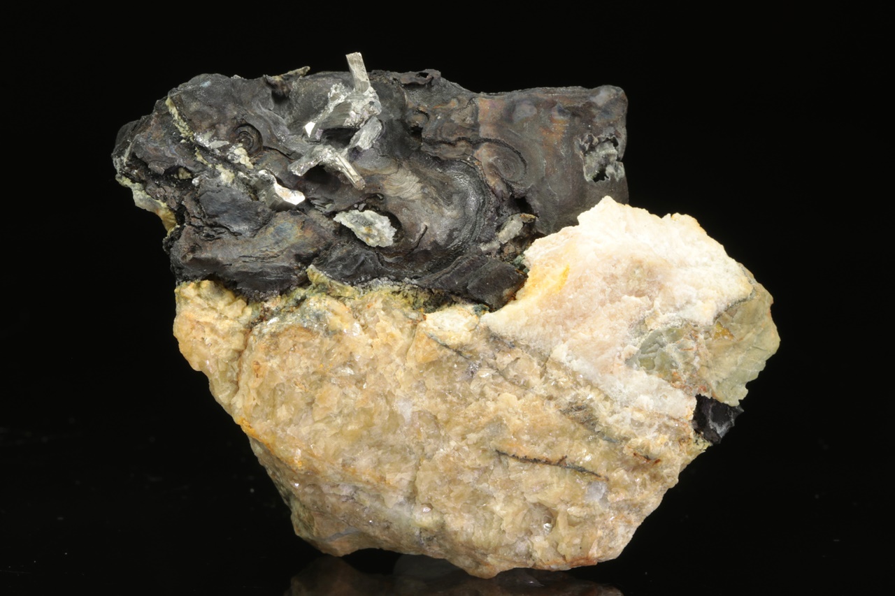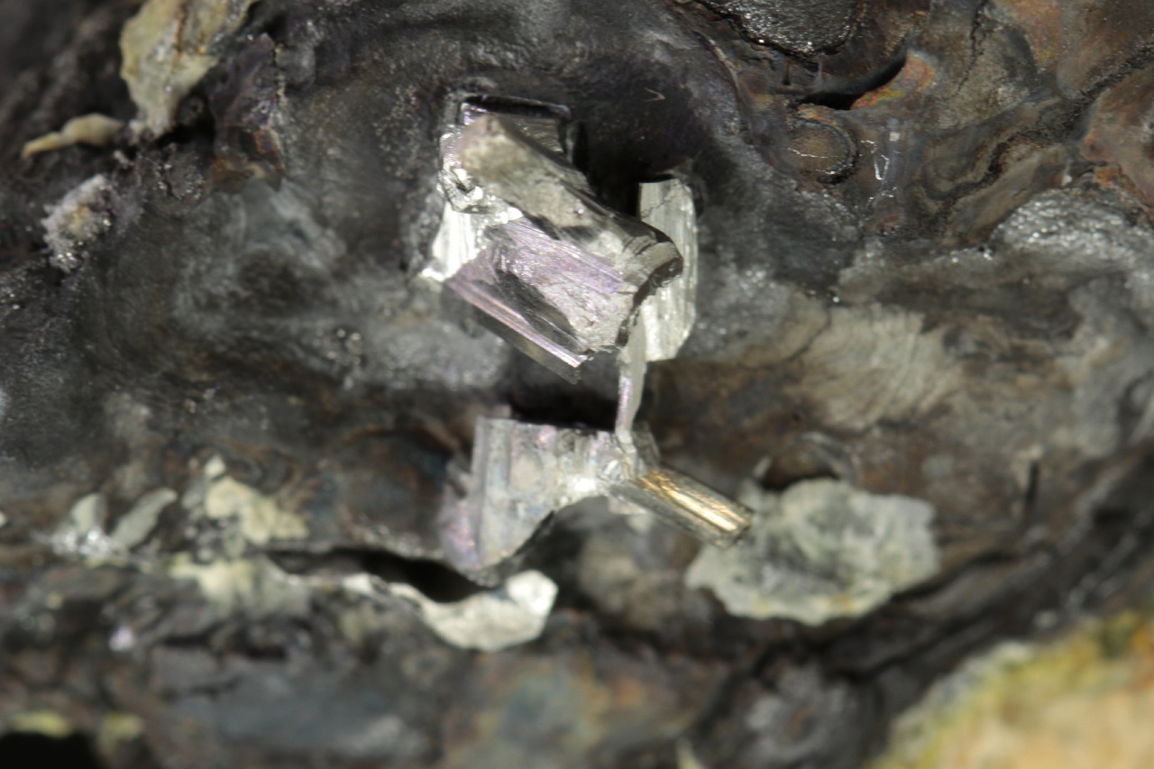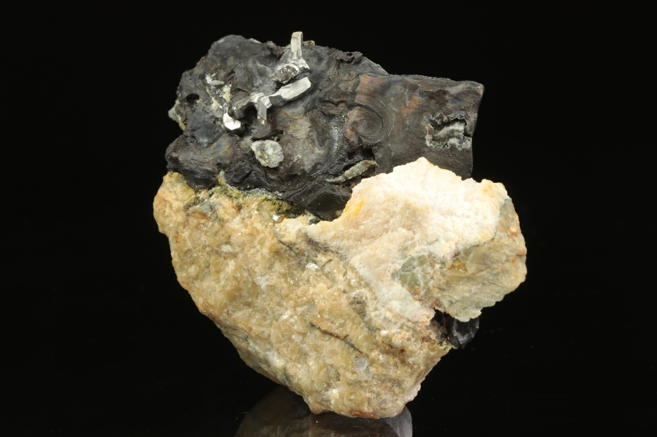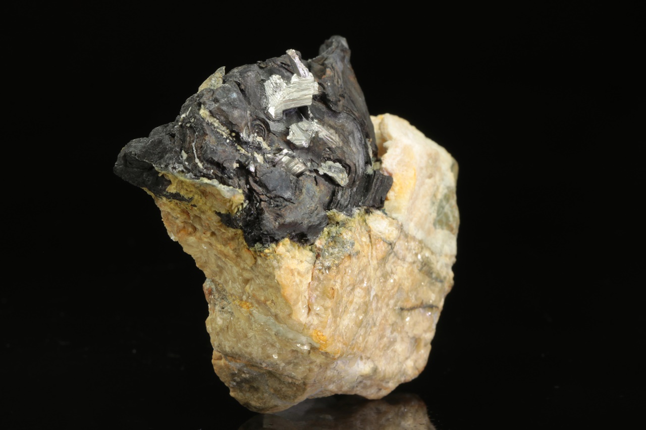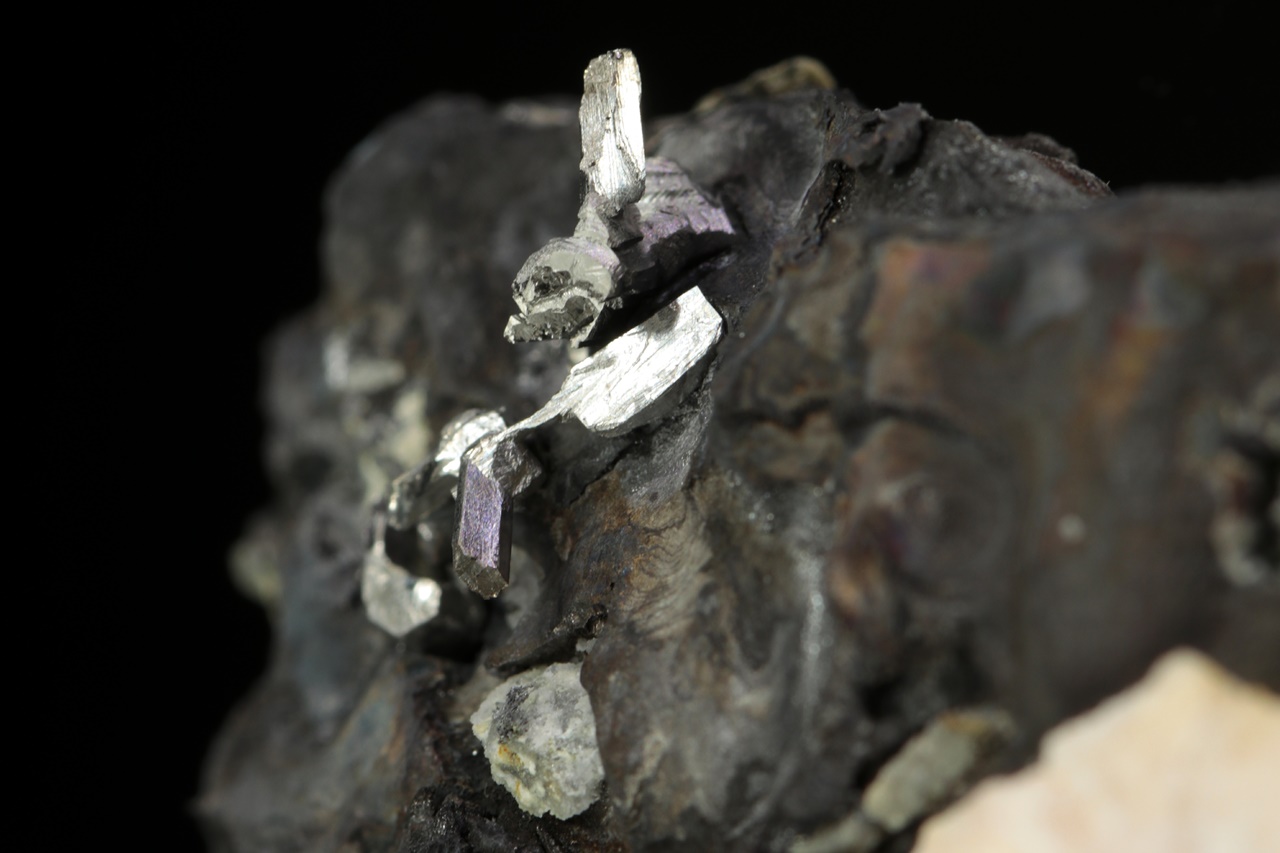 Srostlice stříbrně lesklých lištovitých krystalů dyskrazitu vystupující z masivního černého arsenu.