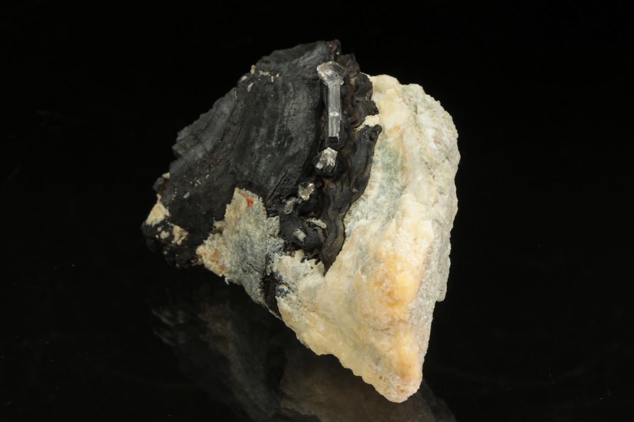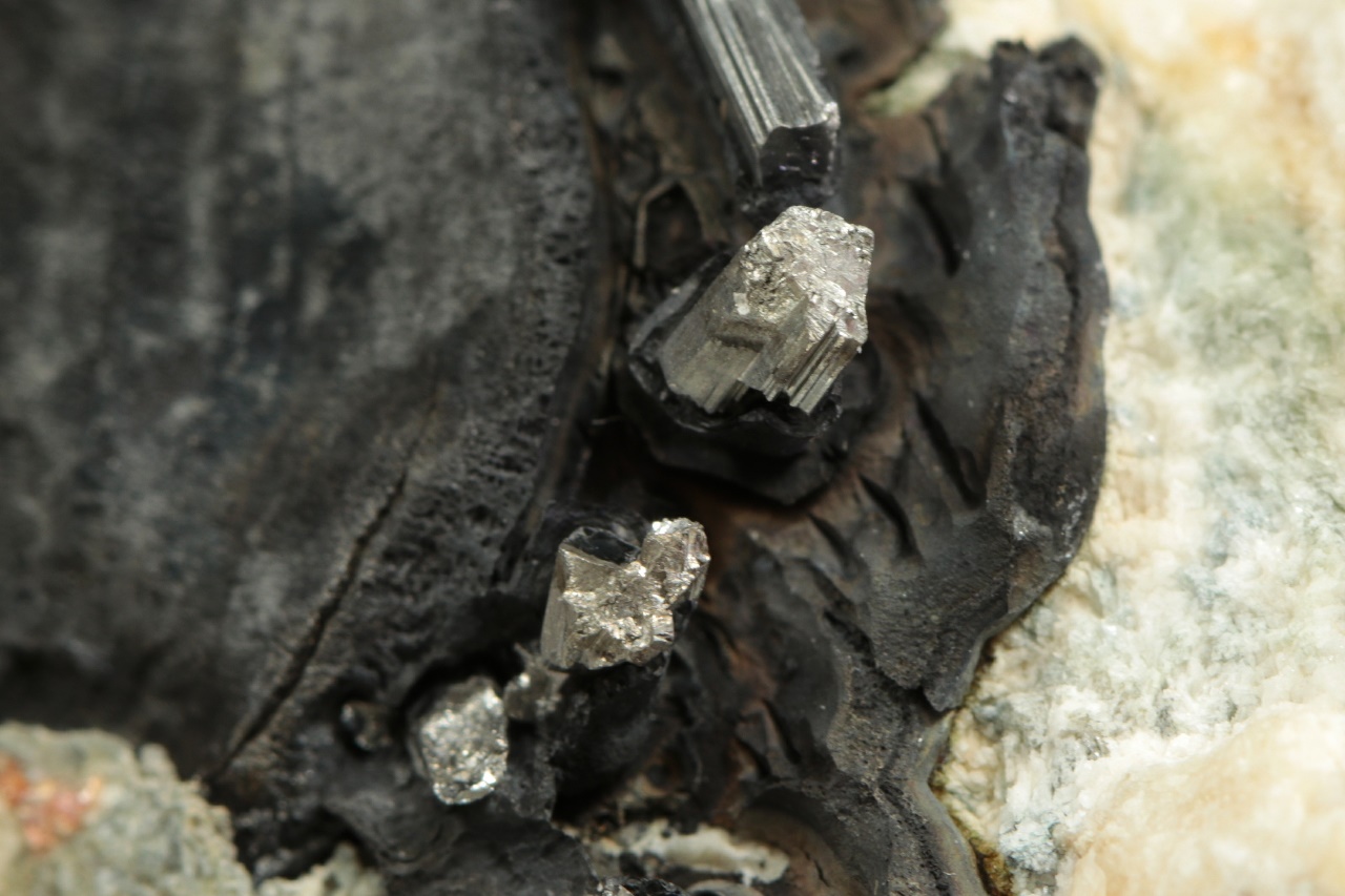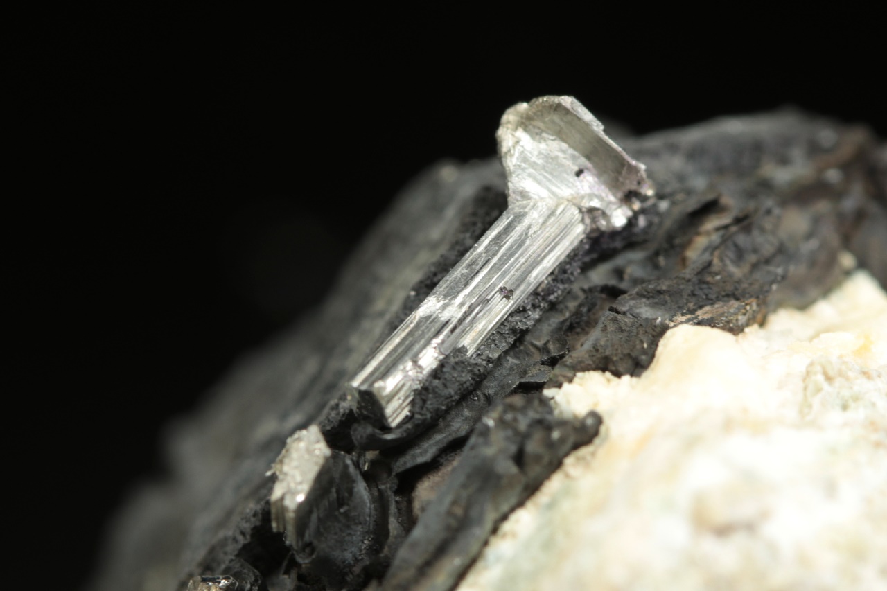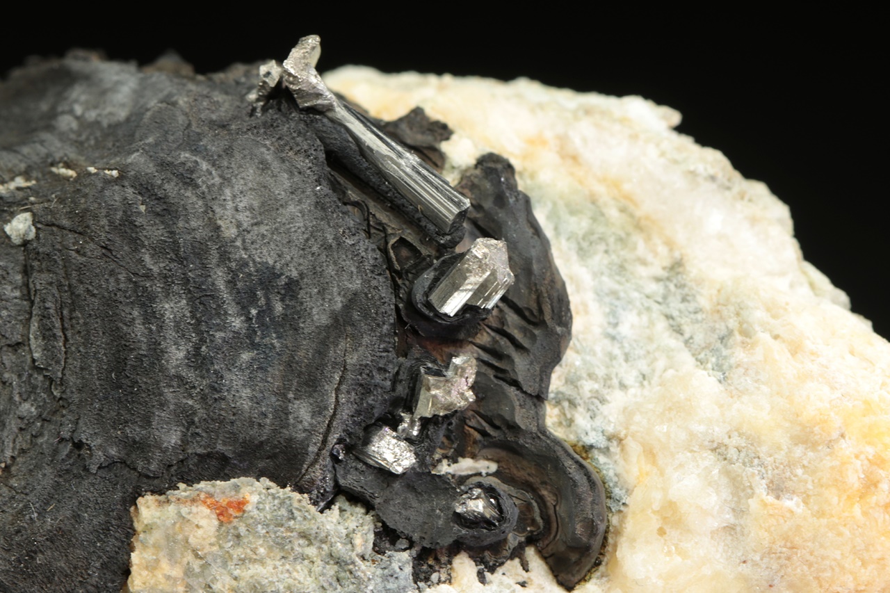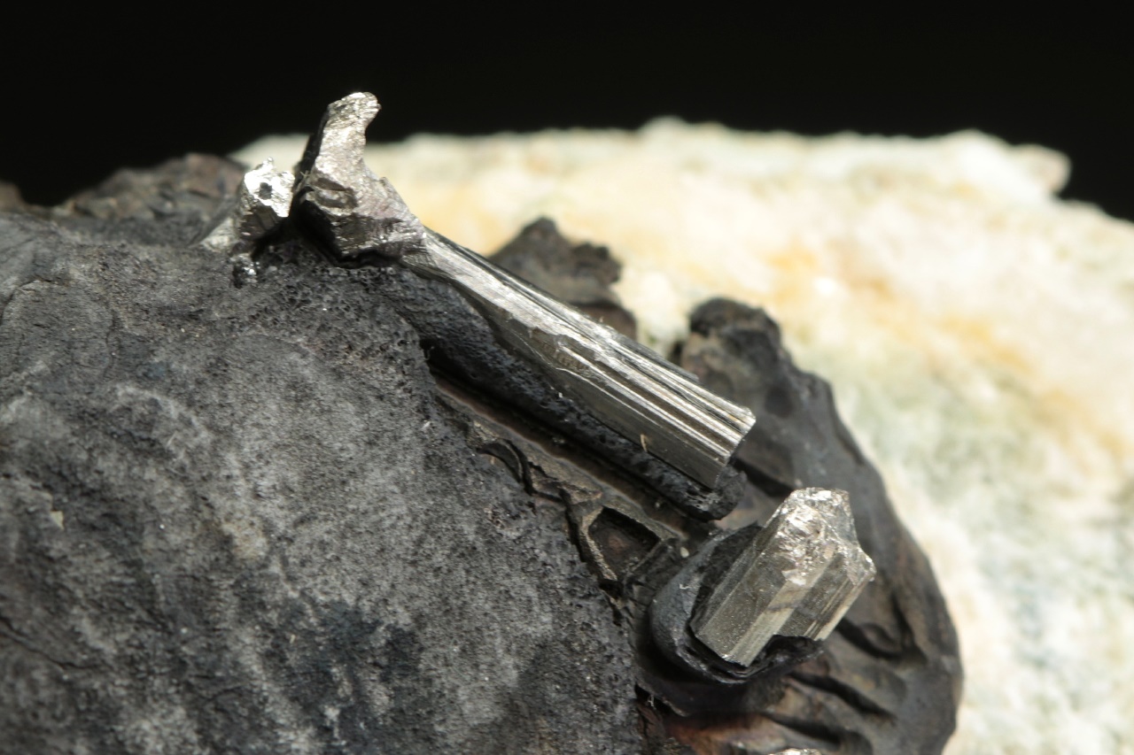 Stříbrně lesklé krystaly dyskrazitu s charakteristickým rýhování vystupující z černého arsenu. Největší krystal dyskrazitu je 10 mm velký.