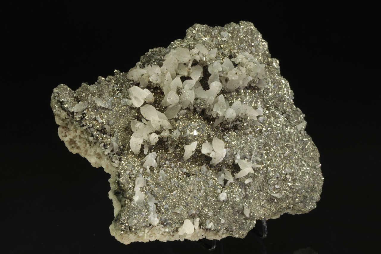 Drobné zlatavé krystaly pyritu, na které narůstají bílé skalenoery kalcitu až 8 mm velké.
