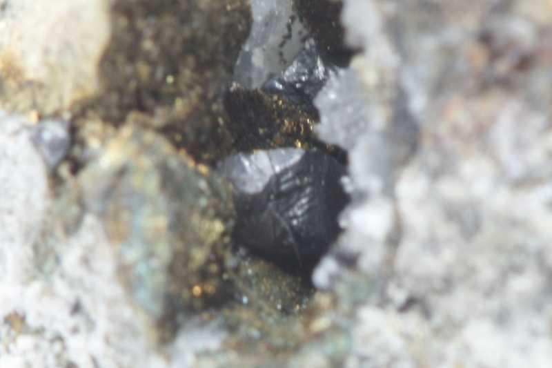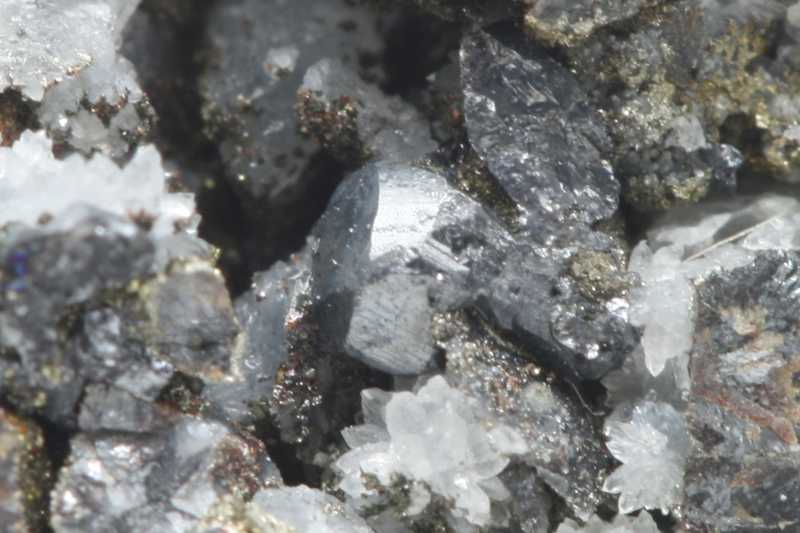Two small crystals of a rare silver mineral, both crystals are approximately 1 mm in size.