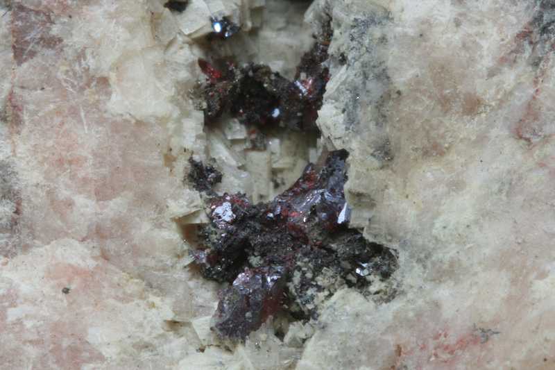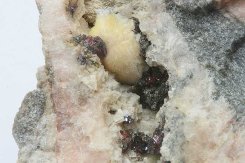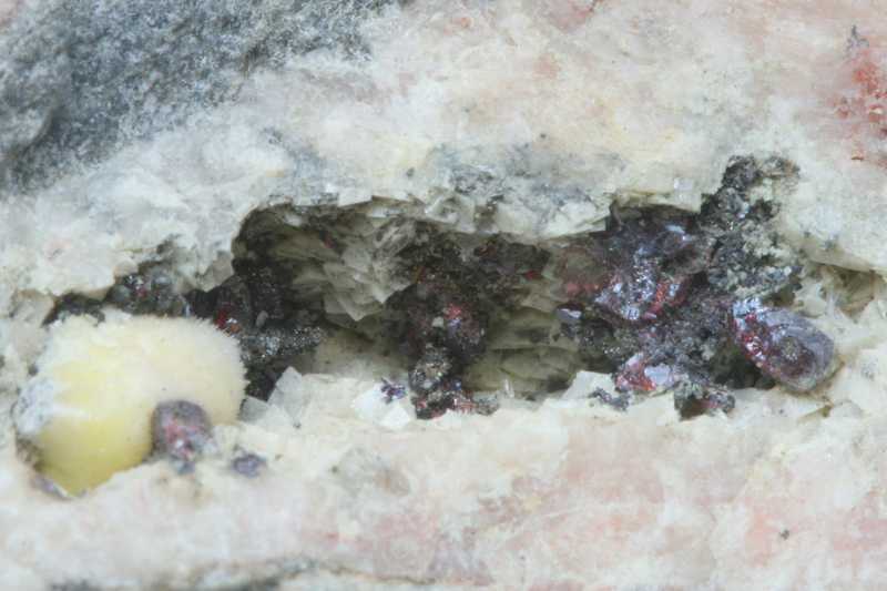 Aggregates of red proustite and small hexagonal crystals of argentopyrite, 0.5 mm in size, grown on yellowish pharmacolite in a 24 mm cavity