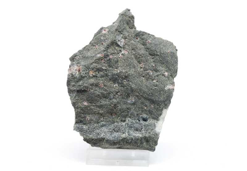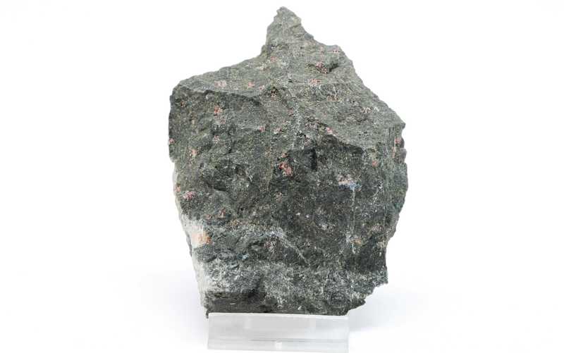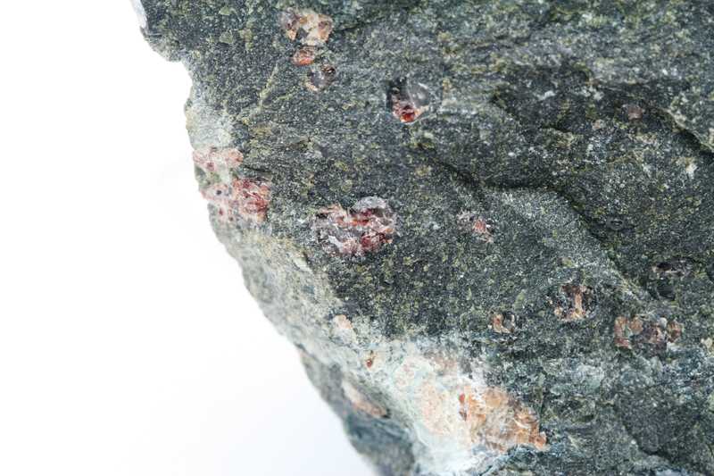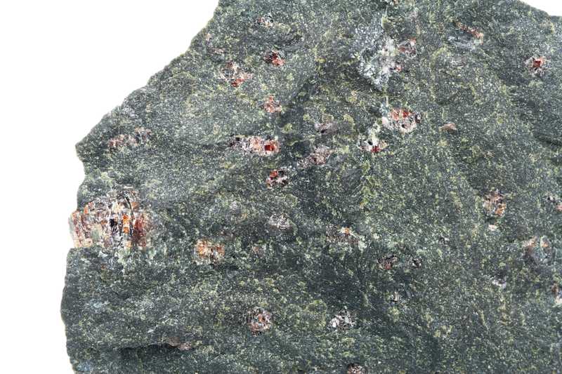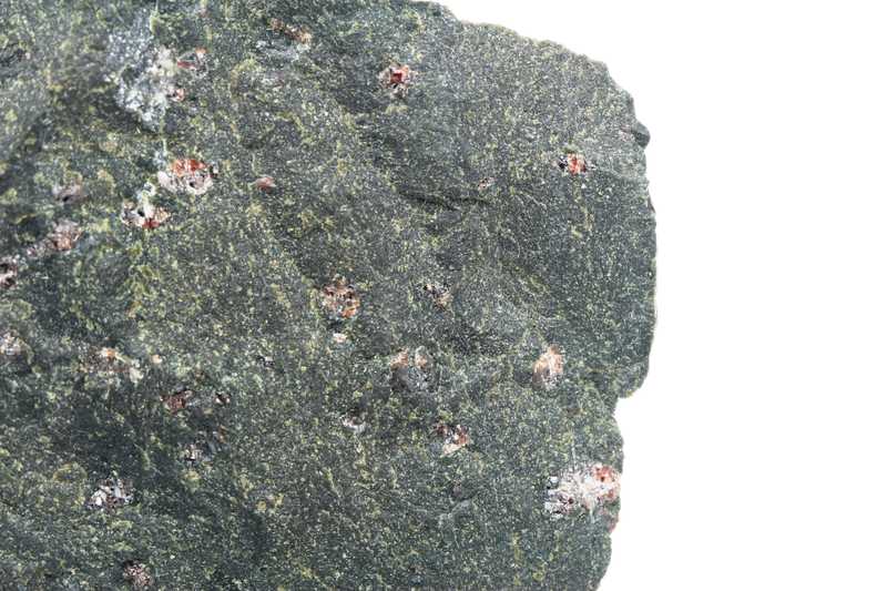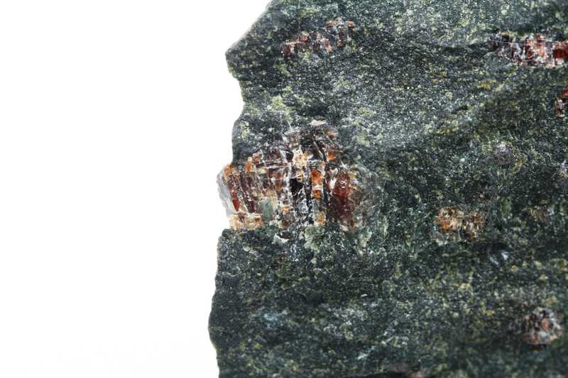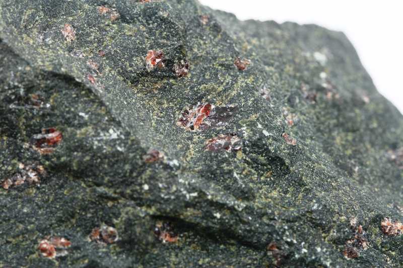 An interesting pecimen of a magnesian variety of garnet – pyrope (Czech garnet). Pyropes are located in serpentinized peridotite. The largest crystal is 9 mm in size.