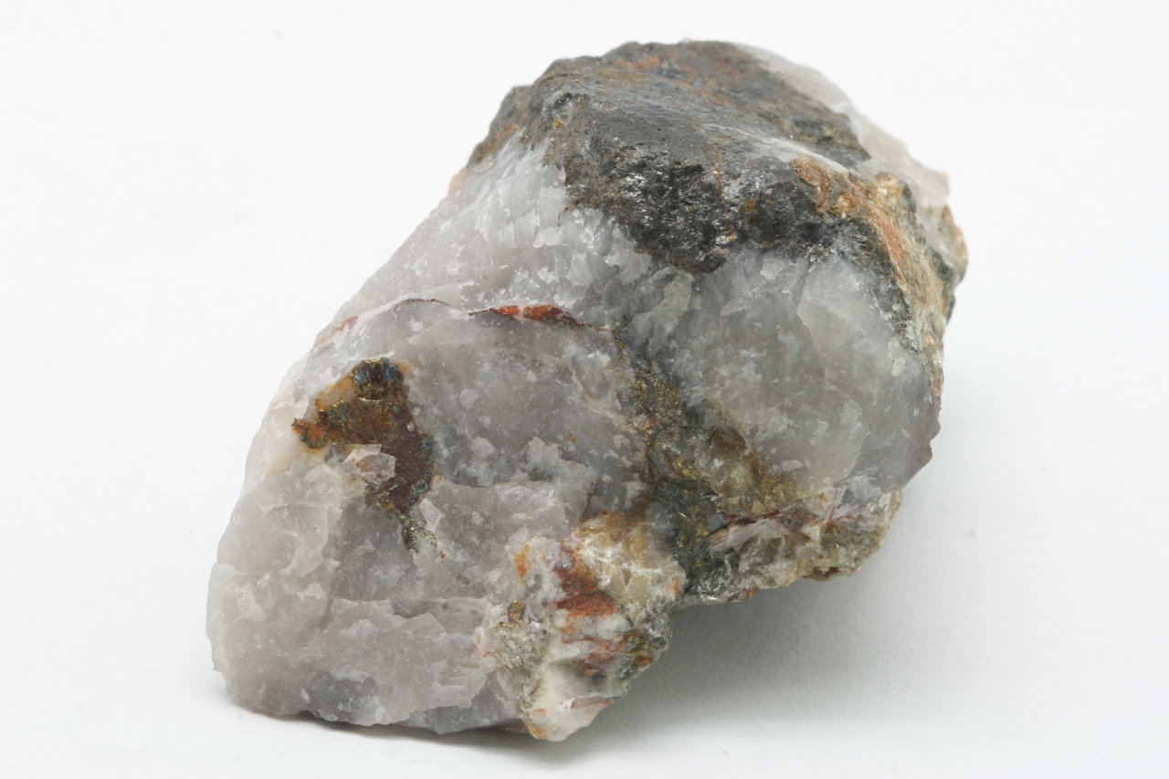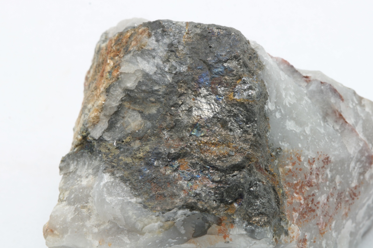 Metallic grey grains of copper, iron, and zinc sulfide.
