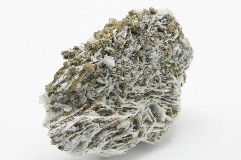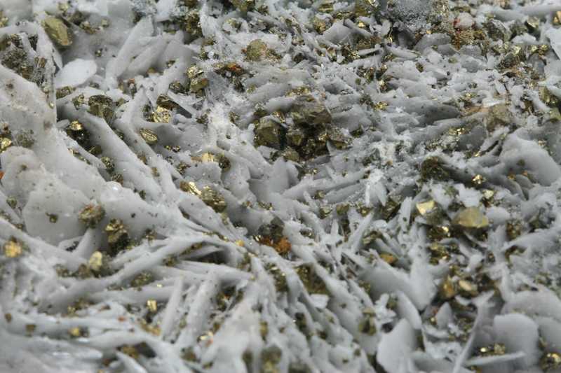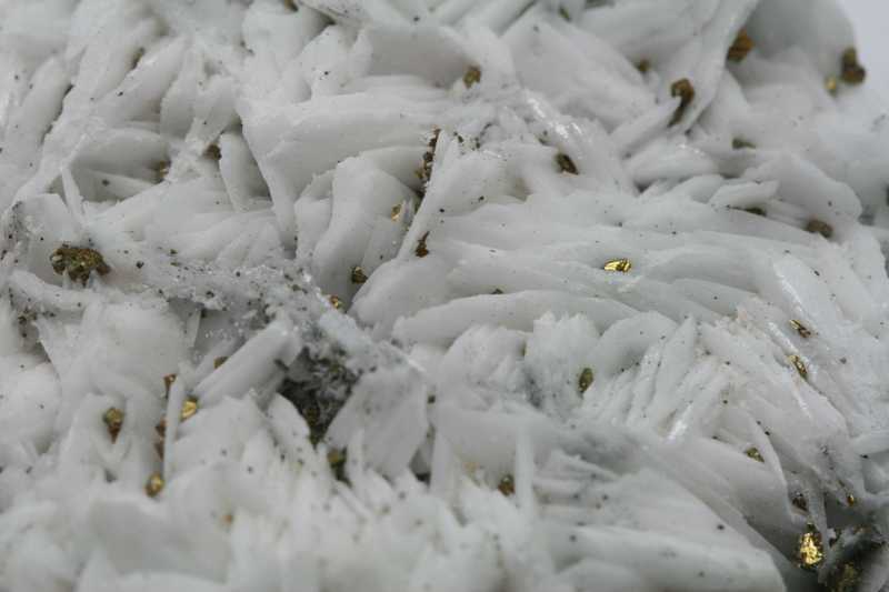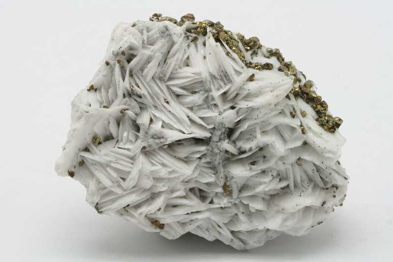 Aesthetic sample of white lamellar baryte with golden chalcopyrite. The bars of baryte are 1 to 1.5 cm large.