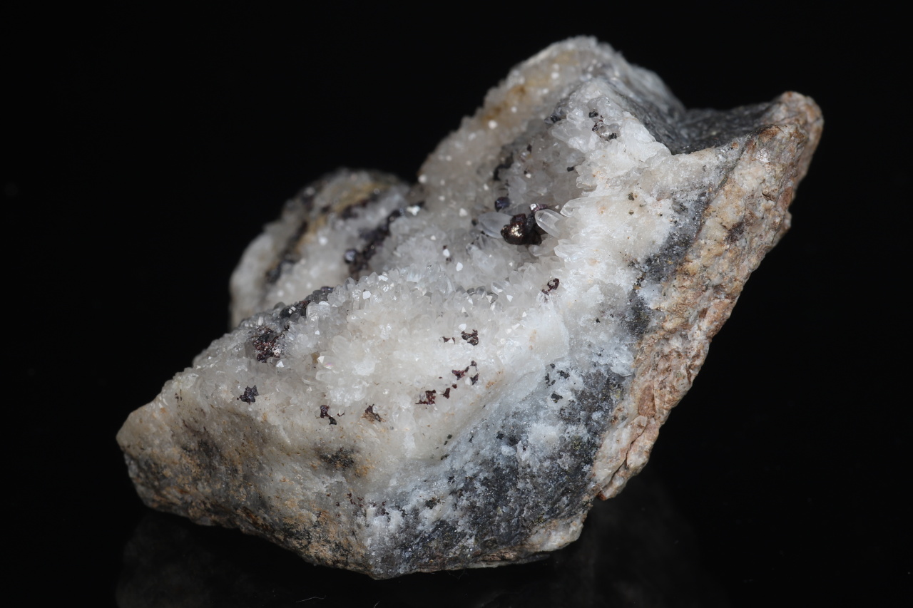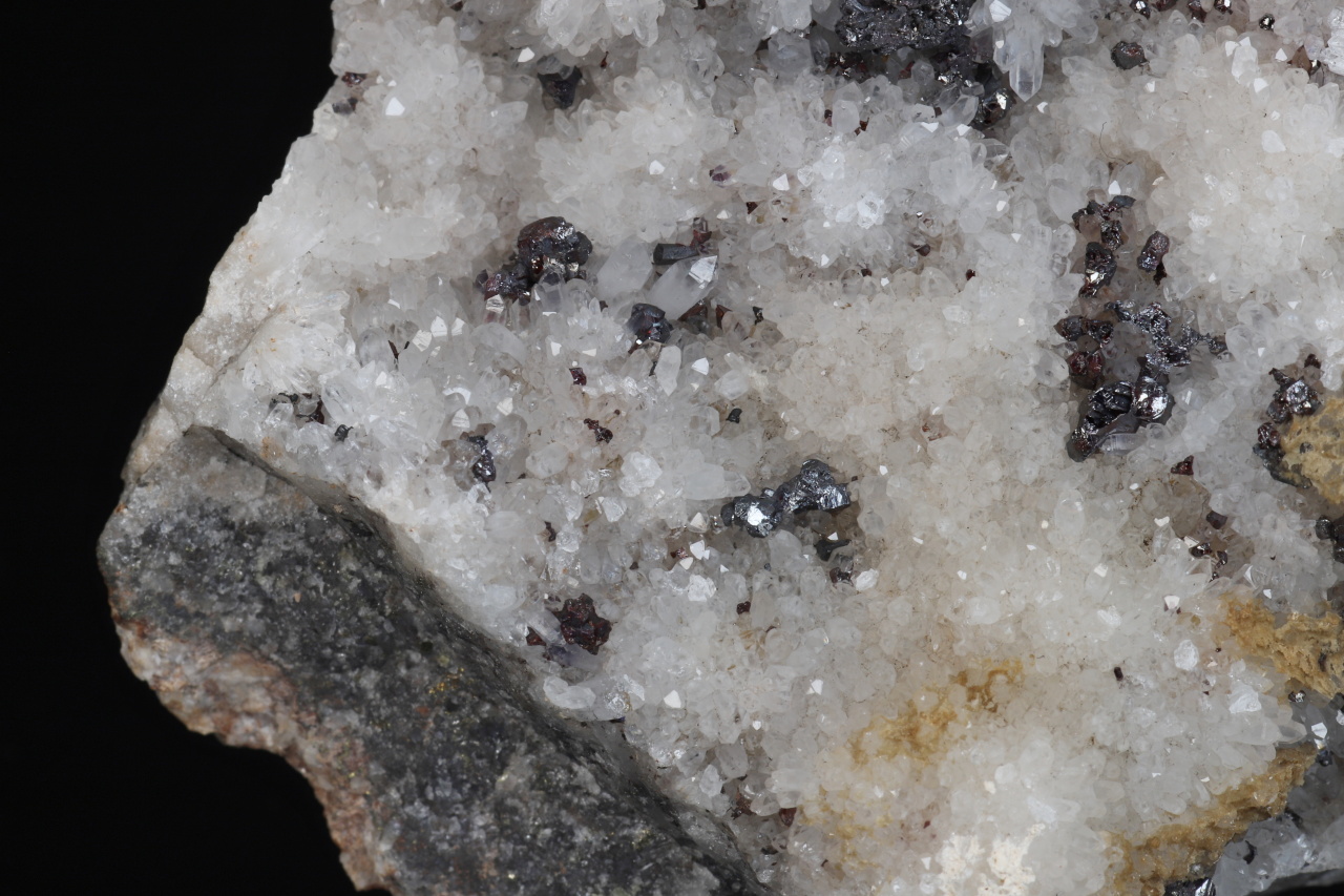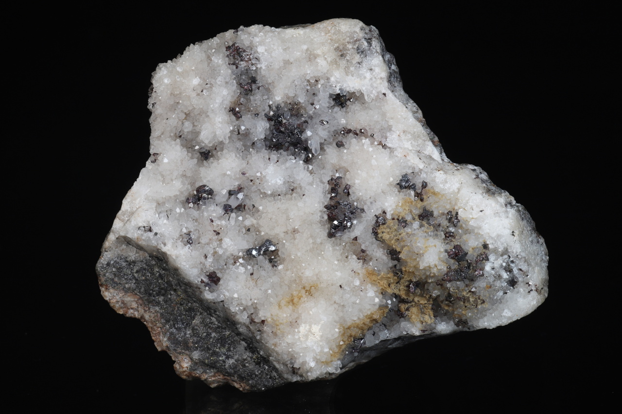 A historically very rich sample of silver minerals from the famous Freiberg deposit. The sample contains numerous perfectly terminated crystals and grains of pyrargyrite, about 2-3 mm in size, with flat steel gray crystals of polybasite and especially with the rare xanthocon. Xanthocon forms tiny, roughly 1 mm large, glossy orange crystals, of which there are at least 8 throughout the sample. The Freiberg area is a type locality for xanthocon.