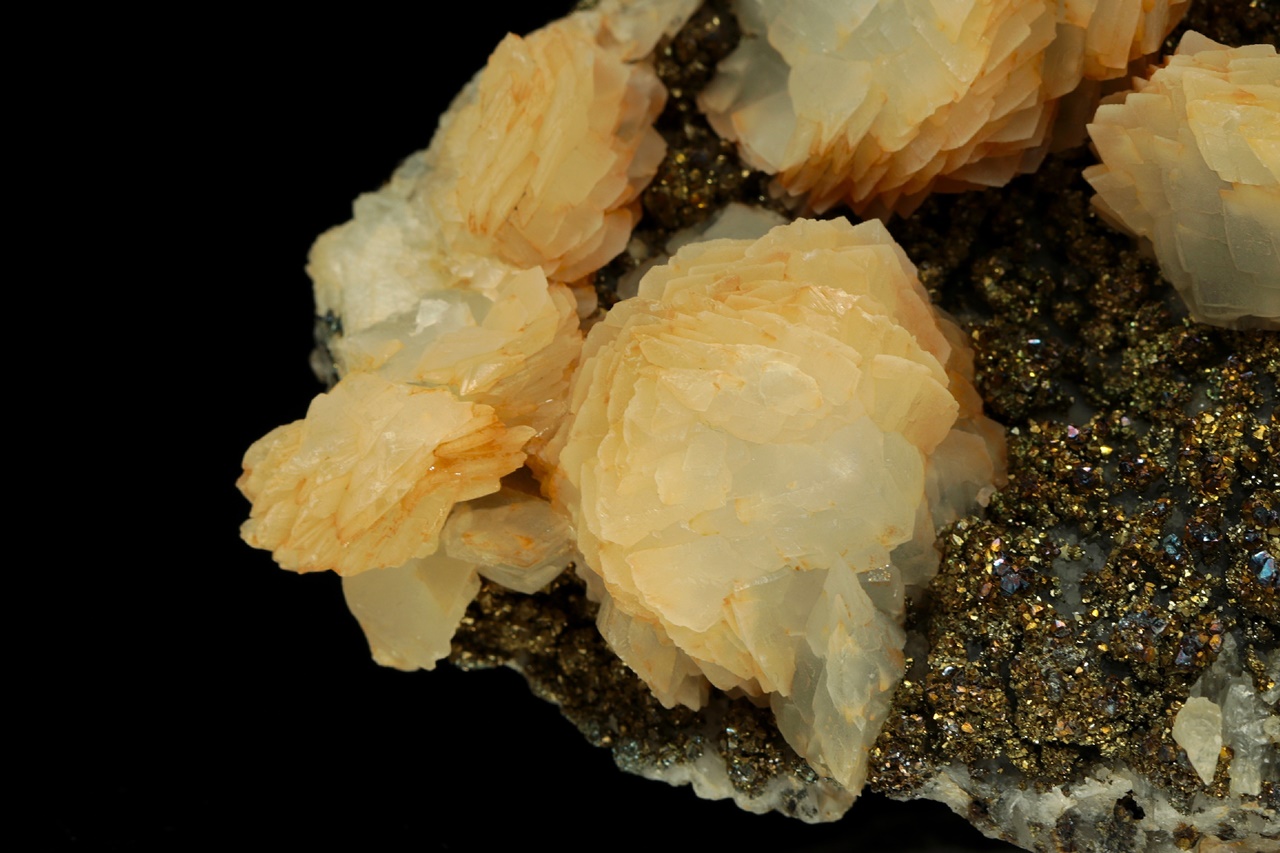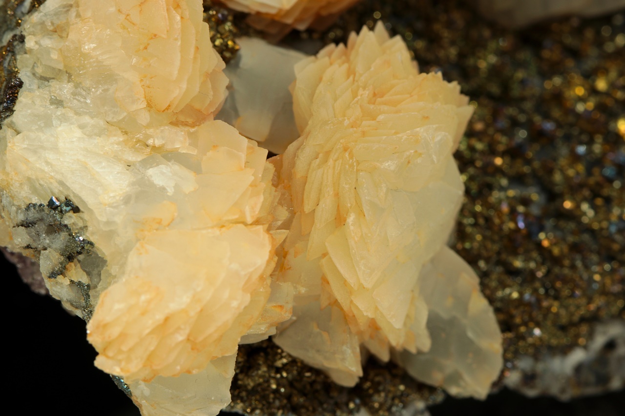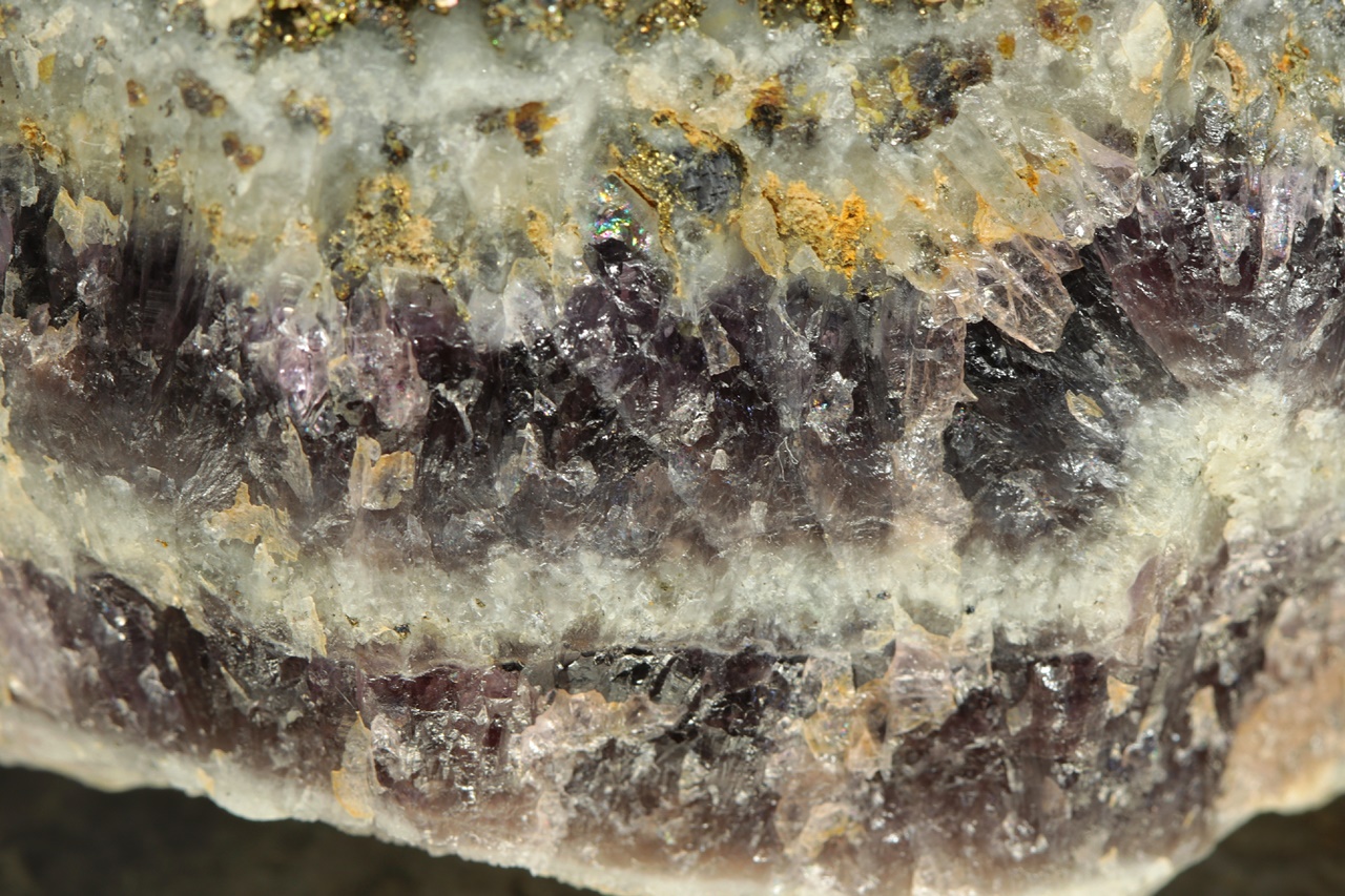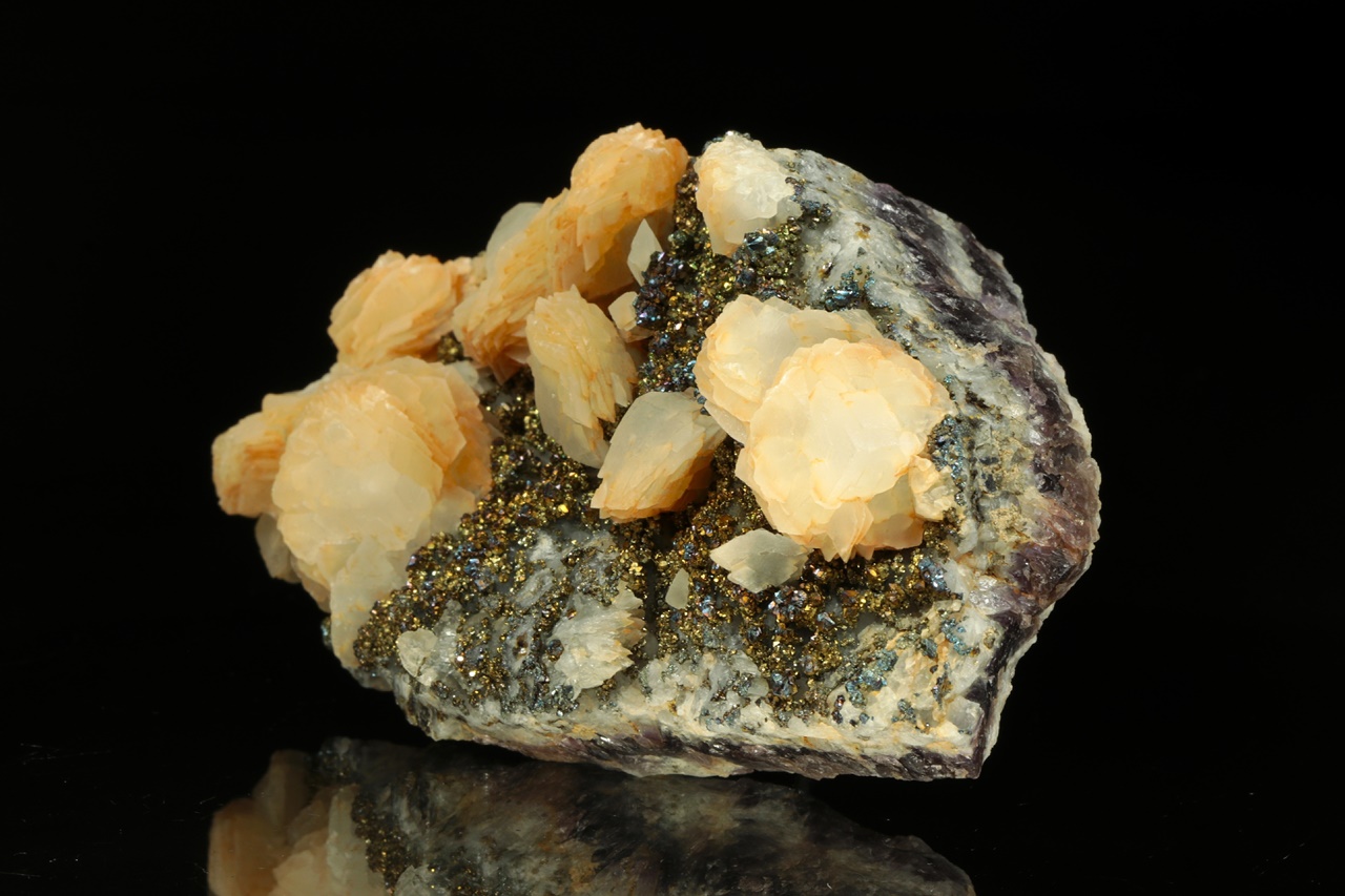 Vějiřovité agregáty průsvitného kalcitu narůstající s drobným pyritem na podložce z hradbového ametystu.